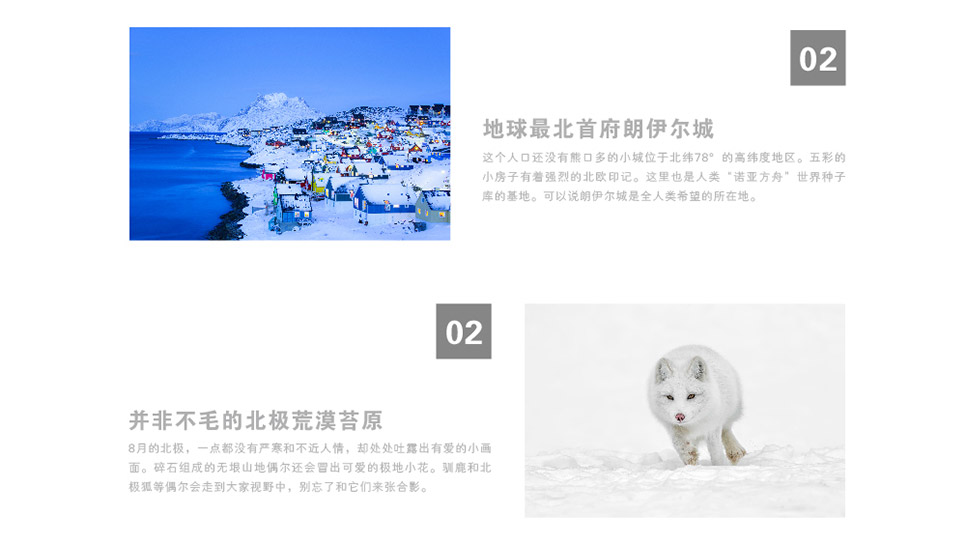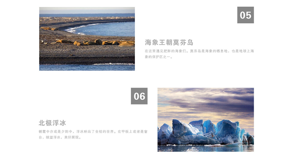 浩桑岛:浩桑岛位于群岛的南边,岛上有险峻陡峭的崖壁,海面散落着无数的美丽冰山,还有气势宏伟的冰川,当所有这些映入眼帘时,您会感到大自然的伟大。