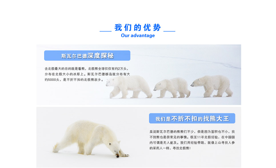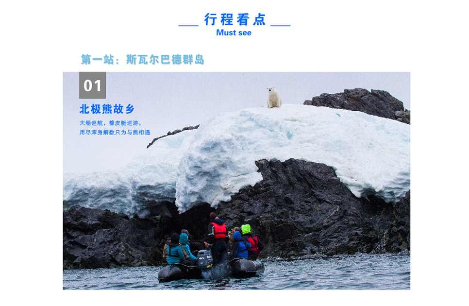 从今天起,我们的所有行程将取决于天气和冰面情况,进行橡皮艇登陆,探访无人区,穿越北纬81度,欣赏壮丽的峡湾、冰川和浮冰,寻觅北极熊,北极狐,驯鹿,海象,海燕等北极特有的野生动物。和普通的环斯瓦尔巴德线路不同,我们这个独一无二的行程将深入群岛的东北部,沿着250公里长的大冰川,有机会欣赏到壮观的冰瀑布和冰山上的北极熊。