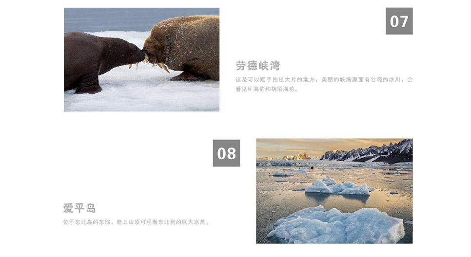 科维托岛:位于群岛的最东部,这个是最少有游客能到达的岛,整个岛屿被冰盖覆盖,只剩一小块没有冰雪的地方。预计能见到大群的海象。