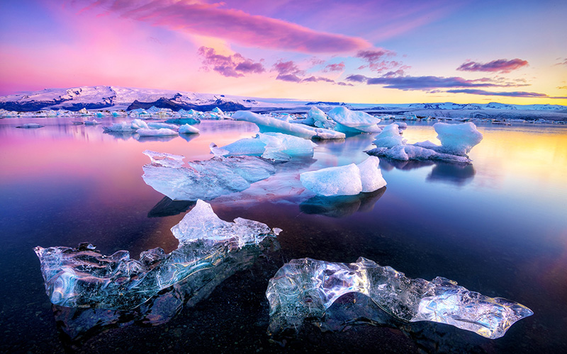 欣赏世界第三大冰原——瓦特纳大冰原的冰湖、冰山和冰川,寂静的湖面漂浮着晶莹剔透、形状各异也颜色不同的巨型冰块。