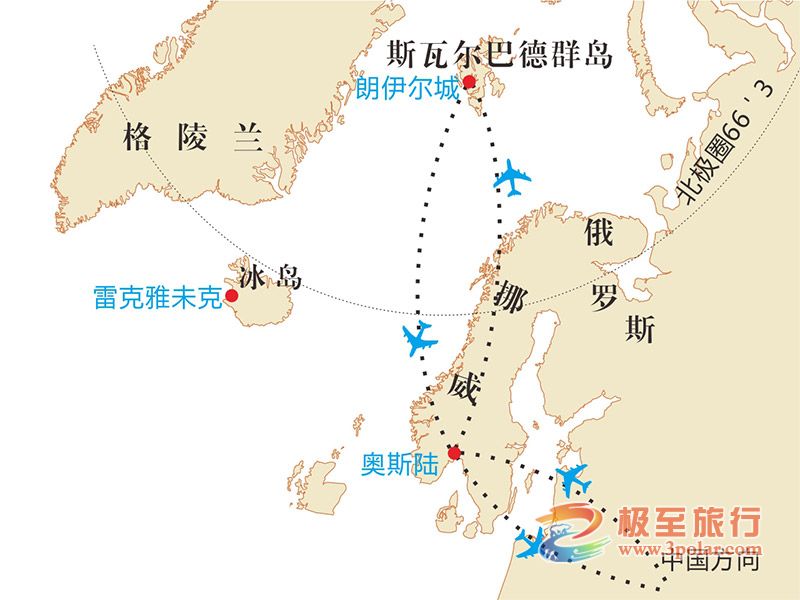 机场集中。搭乘国际航班转机飞赴挪威,抵达奥斯陆后,换乘专机飞往北极斯瓦尔巴群岛首府朗伊尔毕。