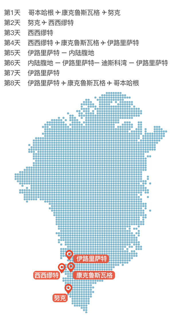 这是一片历经亿万年洗礼的陆地,记录着4000多年的人类历史,孕育了各种胜景。在这里,既能感受到因纽特人文历史的痕迹,也能欣赏到纯美的北极风光。 西格陵兰岛于海岸和内陆冰盖之间的陆地上,留存着因纽特人的捕猎、迁徙的历史和民俗,于2018年最新被评为世界文化遗产。 伊路里萨特冰川,早在2004年就被评为格陵兰岛唯一的世界自然遗产,北半球最活跃的冰川积压在城市的出海口,形成冰峡湾,冰山和冰块映着彩色的房屋,无论远眺还是近距离欣赏,都十分震撼。
