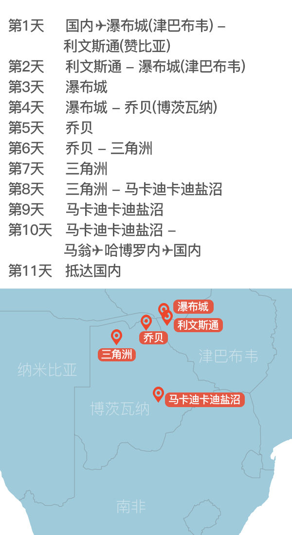 入住非洲鲜为人知的超奢华营地,融入当地环境,近距离体验非洲的心跳。瀑布城住3晚,聆听轰鸣之声,感受雷霆之雾。在非洲伊甸园博茨瓦纳入住乔贝国家公园特色营地,寻找大象踪迹;前往非洲最生机勃勃的奥卡万戈三角洲乘坐独木舟,悠悠飘荡,与动物同游一片水域;深入马卡迪卡迪盐沼,和萌萌的“丁满”互动。