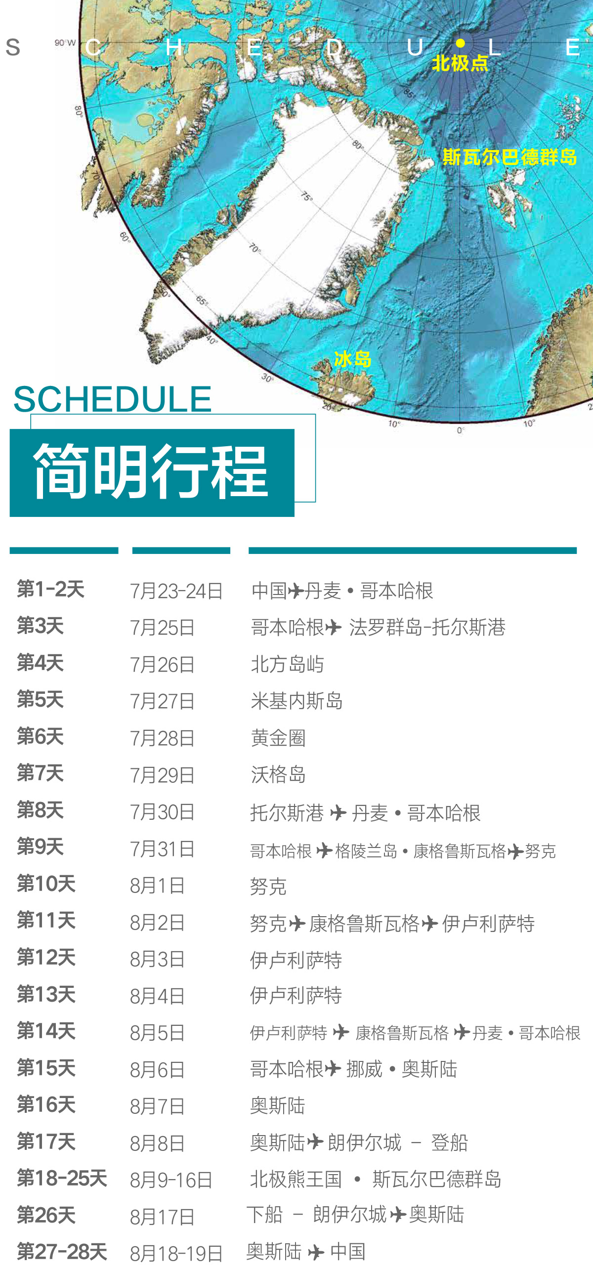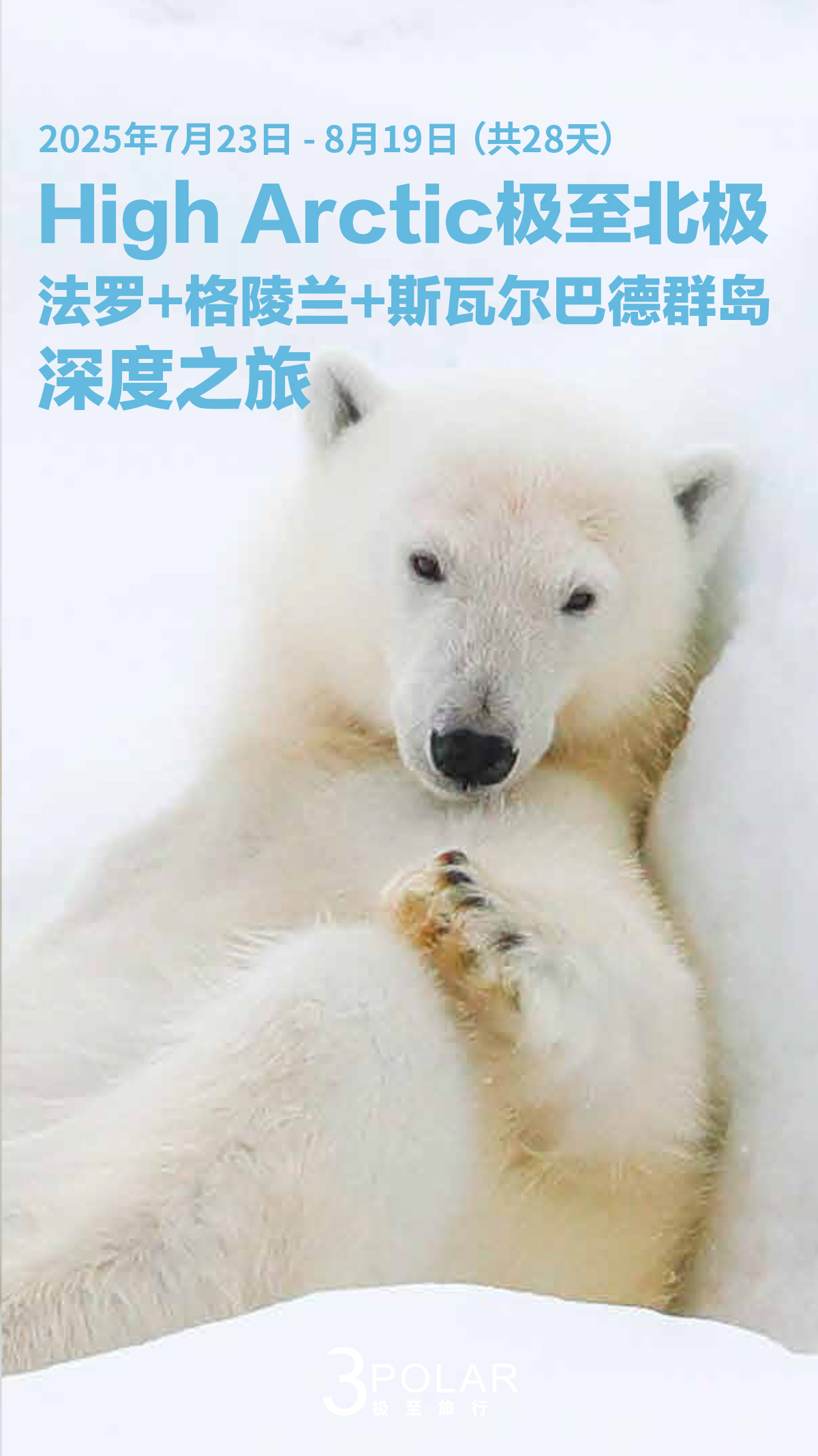 中国唯一一家18年内29次探访北极斯瓦尔巴德群岛每次看到北极熊;确保最大的几率近观北极熊;仅100名游客最佳的活动体验;深度探访北极熊的故乡;独家安排:有机会巡游200公里长的超级大冰川,观看冰瀑布;全面的北极风光地貌;有机会遇见数量庞大的海鸟;有机会观看鲸、北极狐、海豹和海象;走进大美格陵兰邂逅原生态的自然与纯粹的北极文化;走进法罗群岛的居民生活,体验北大西洋的旷野文化;走进因纽特人的神秘家园