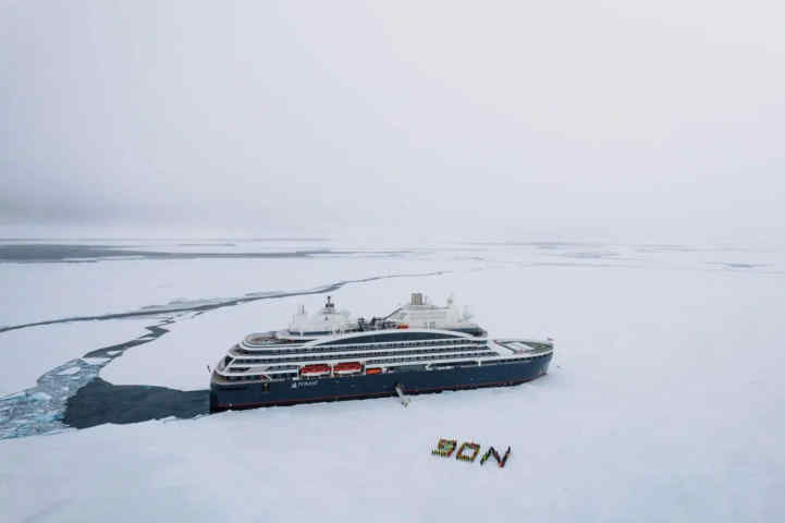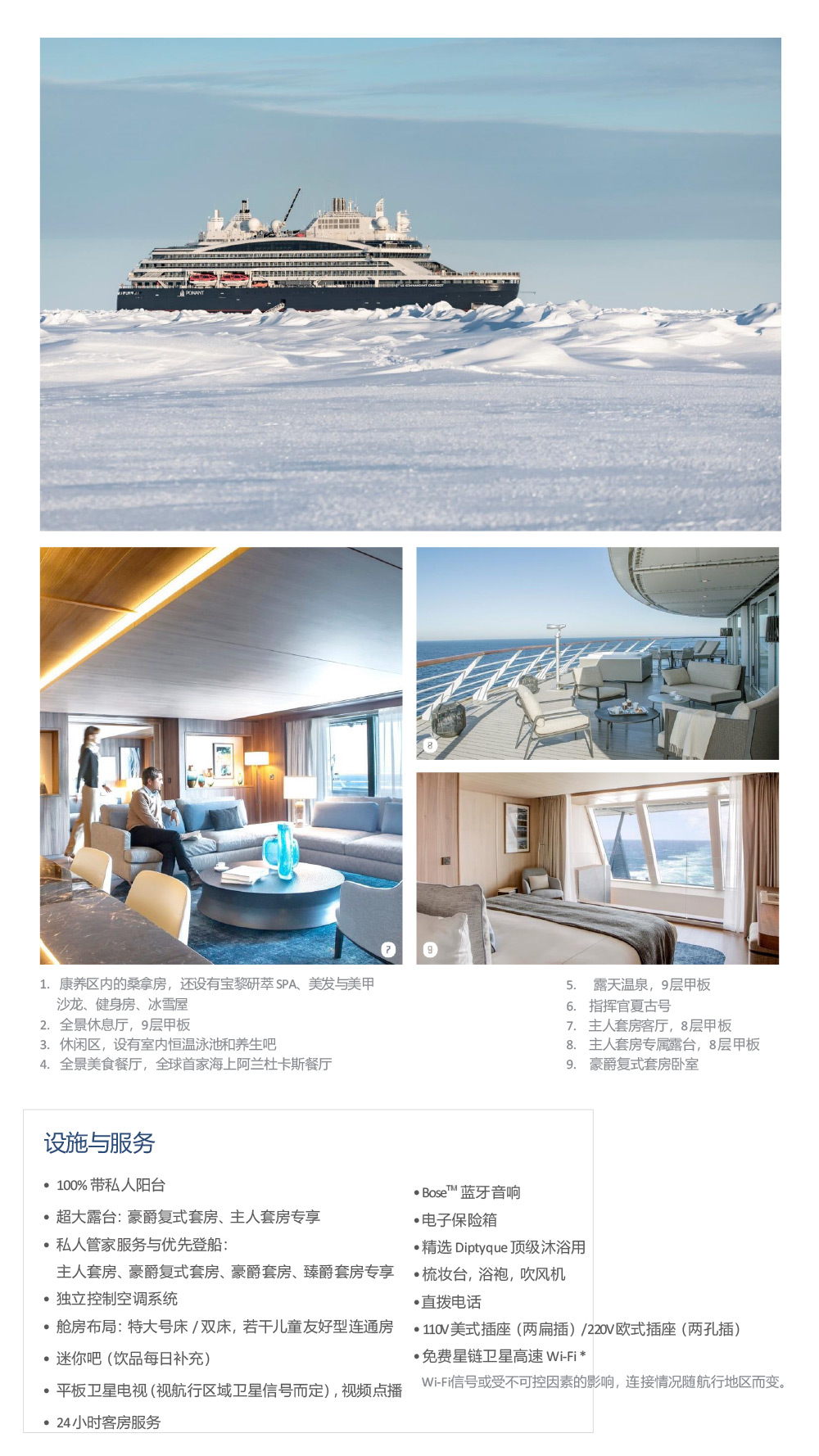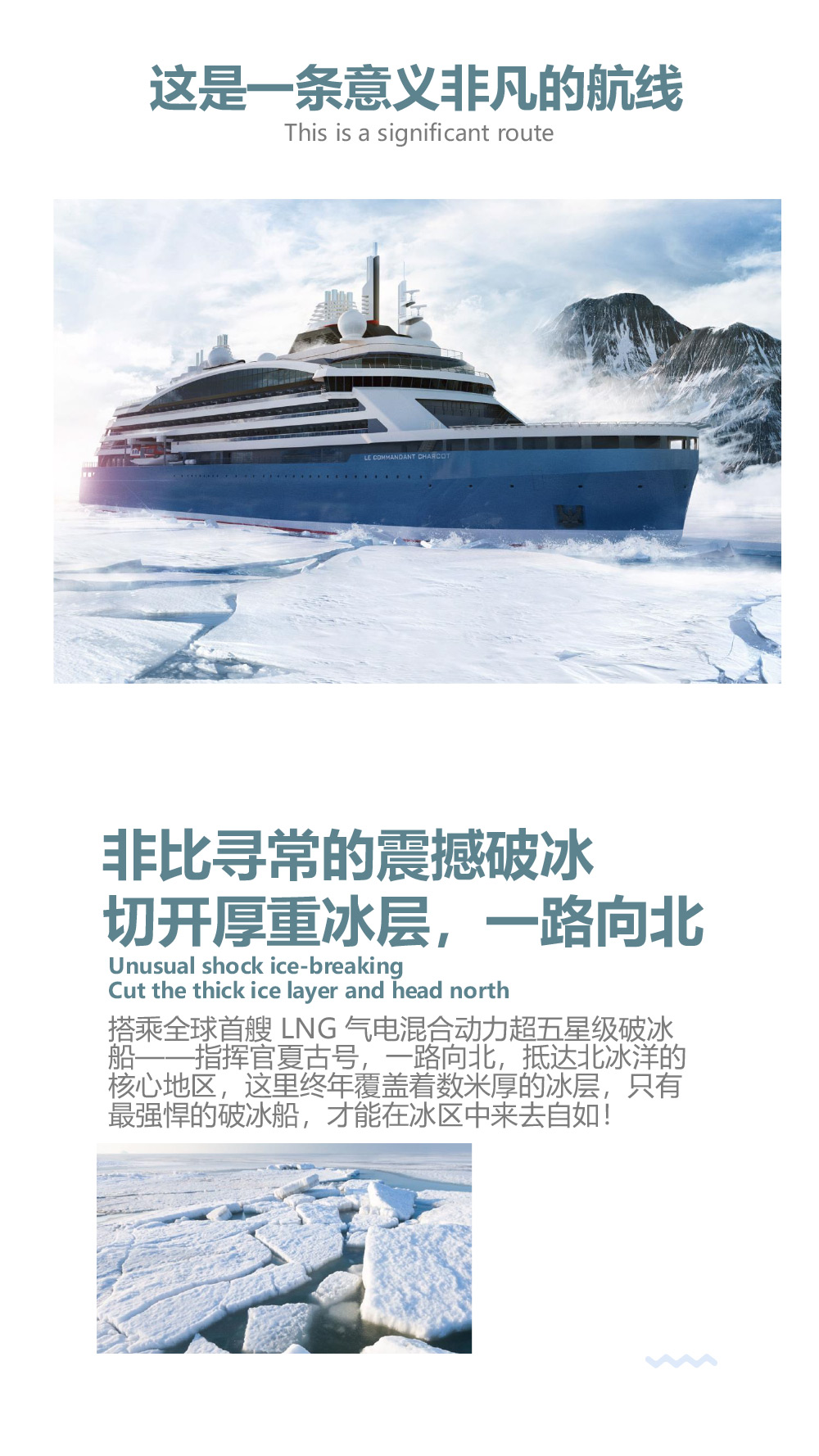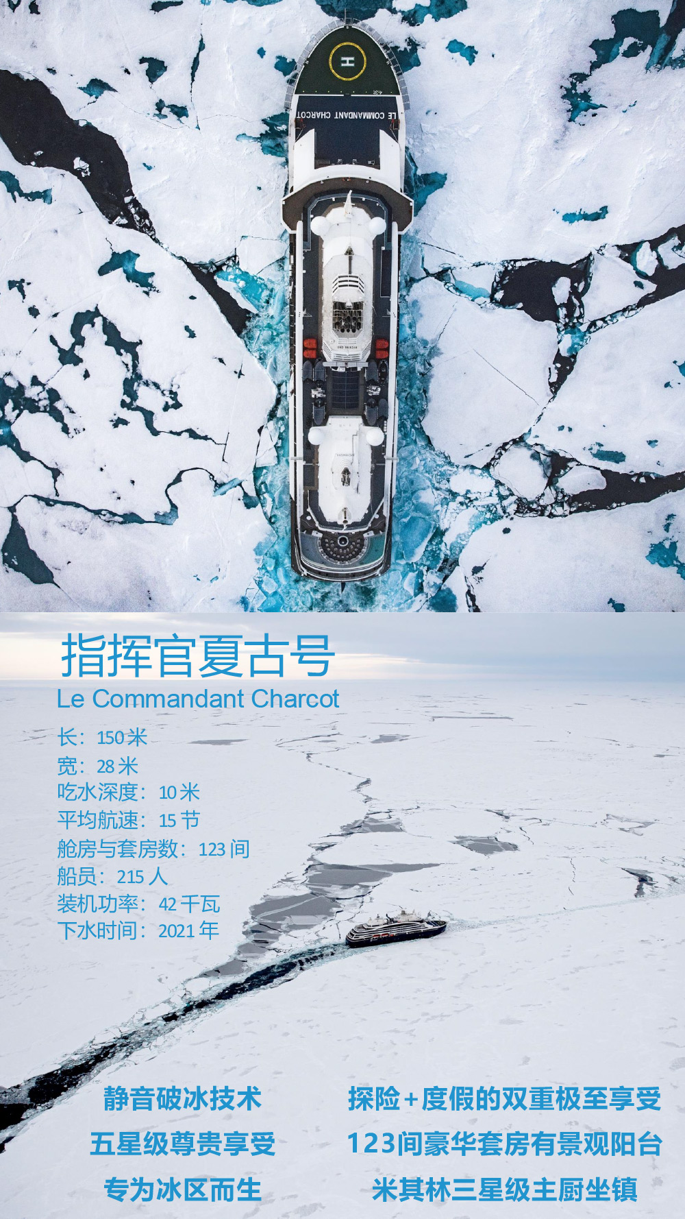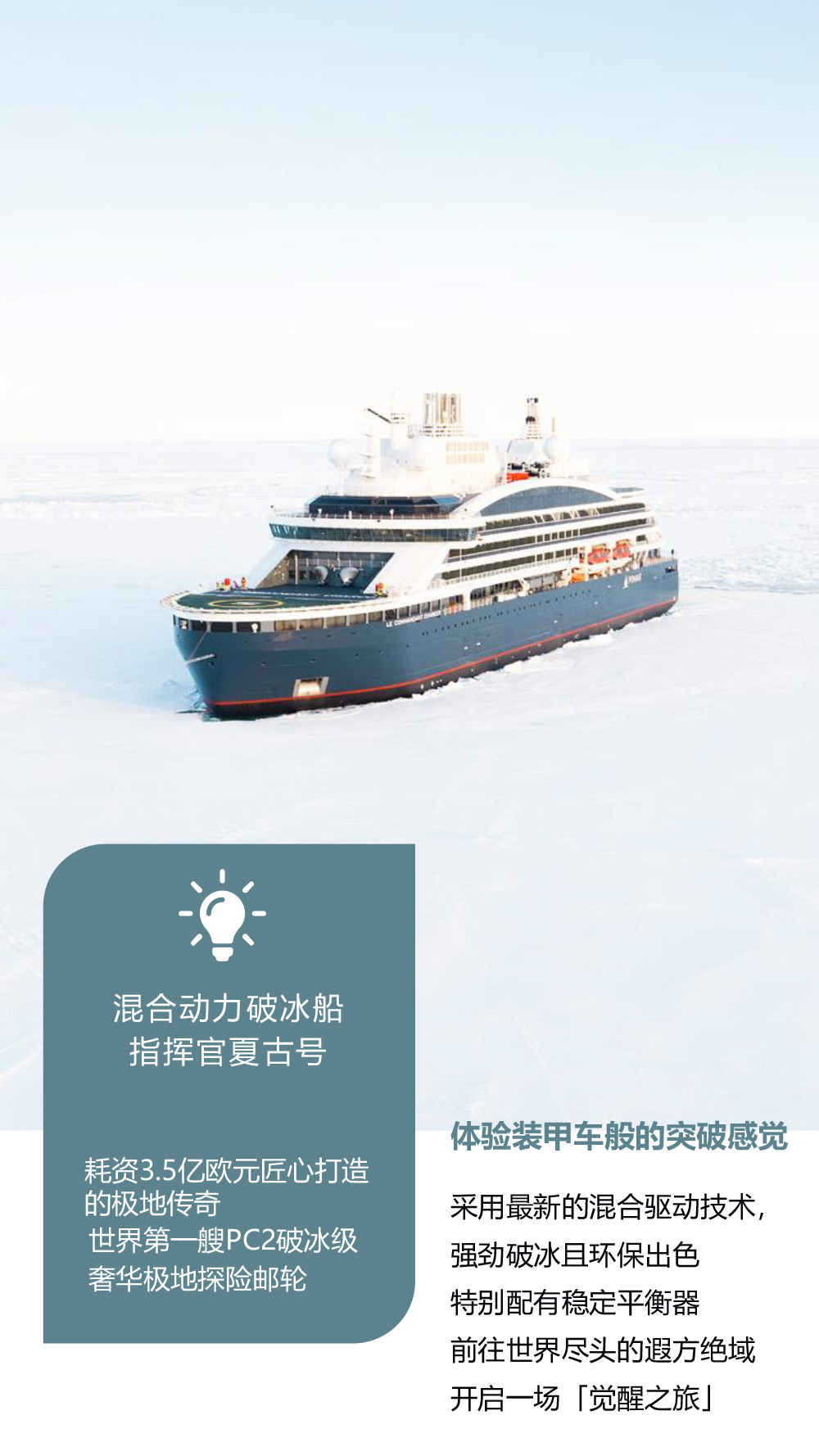 乘坐着豪华极地探险船“指挥官夏古号”。这艘邮轮能够驶入普通船只无法到达的冰层中心,在冰冻的海洋中航行。