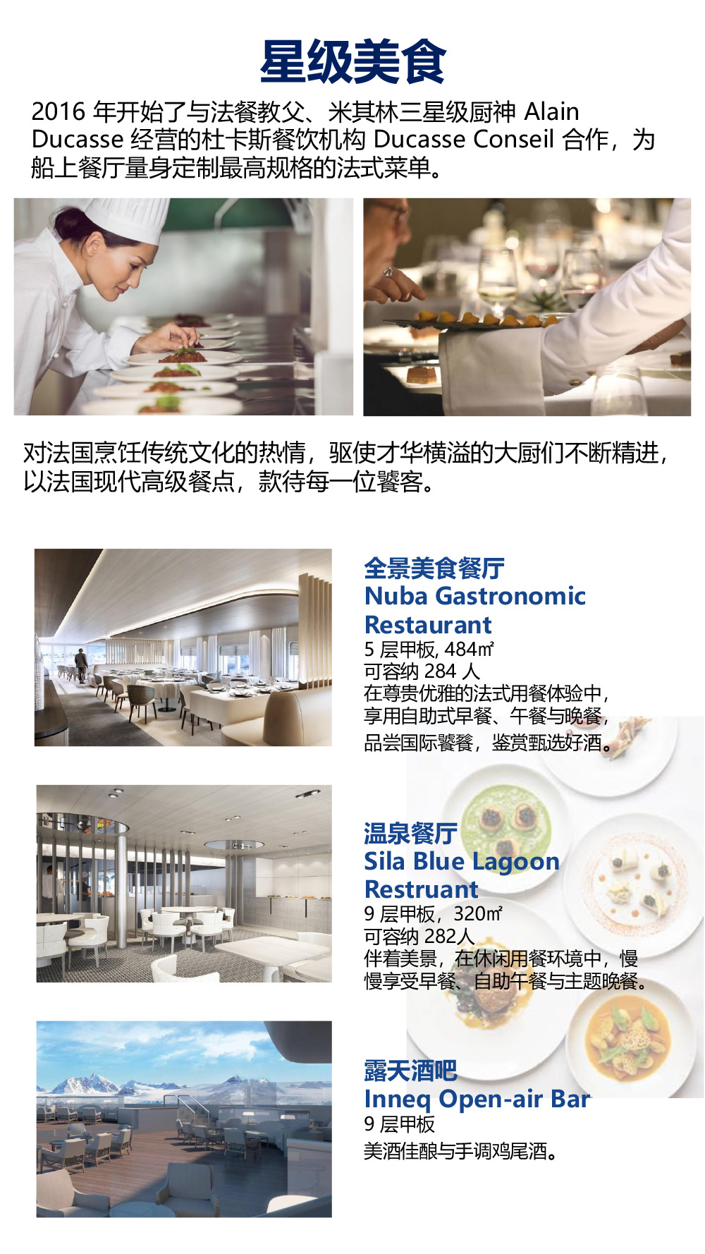 • 【机票】国内往返巴黎国际段机票经济舱,登船当天巴黎-朗伊尔毕包机经济舱,下船当天朗伊尔毕-巴黎包机经济舱(可额外付费升级商务舱,位置有限);