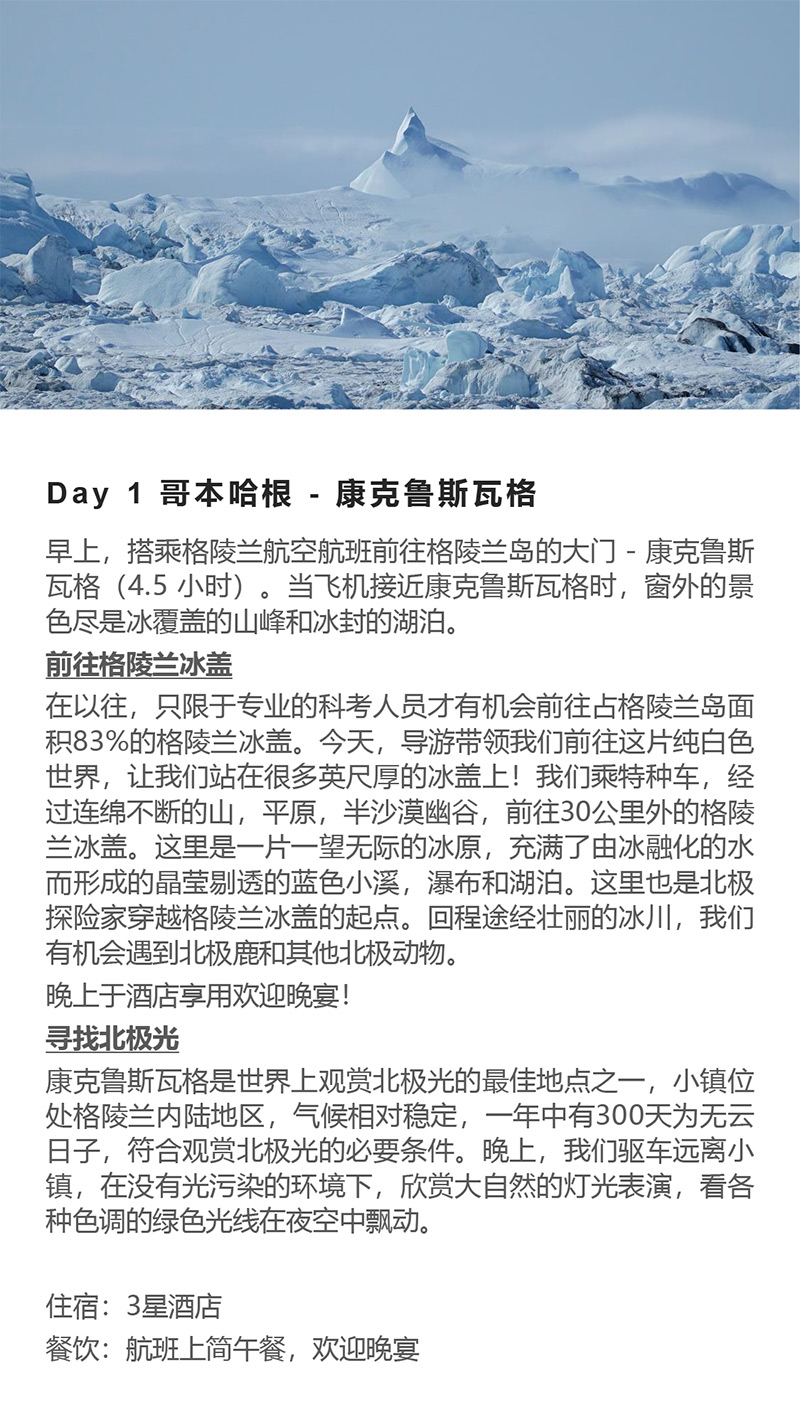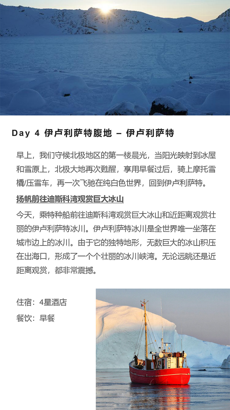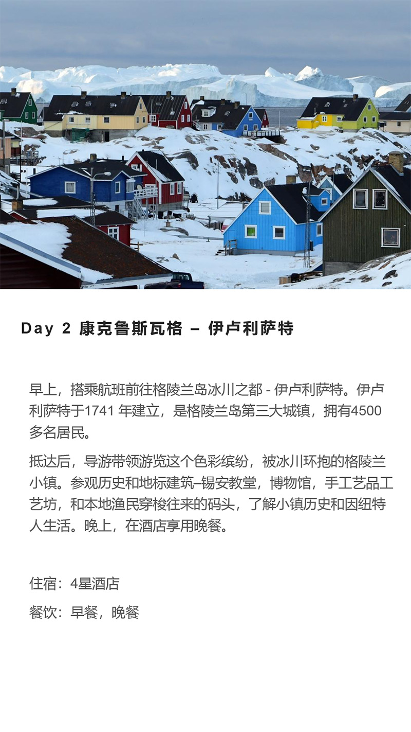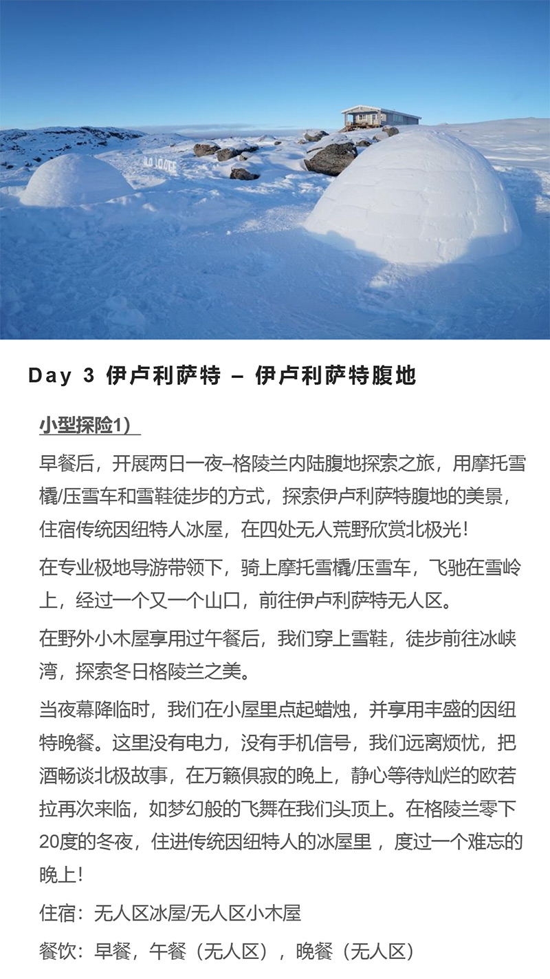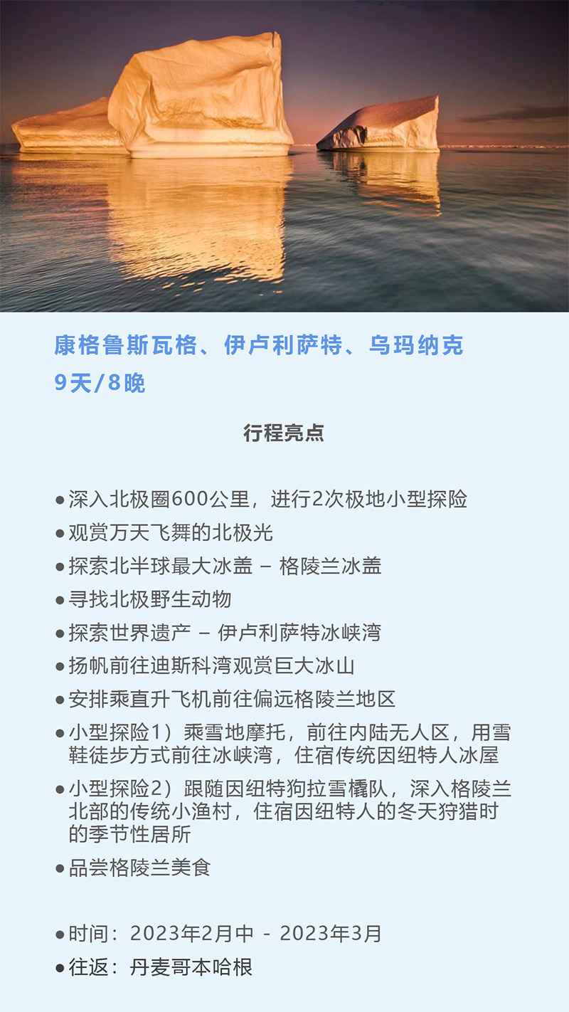 深入北极圈600公里,进行2次极地小型探险;观赏万天飞舞的北极光;探索北半球最大冰盖–格陵兰冰盖;寻找北极野生动物;探索世界遗产–伊卢利萨特冰峡湾;扬帆前往迪斯科湾观赏巨大冰山;安排乘直升飞机前往偏远格陵兰地区;乘雪地摩托,前往内陆无人区,用雪 鞋徒步方式前往冰峡湾,住宿传统因纽特人冰屋;跟随因纽特狗拉雪橇队,深入格陵兰 北部的传统小渔村,住宿因纽特人的冬天狩猎时 的季节性居所;