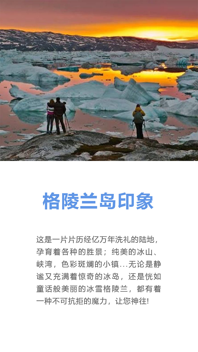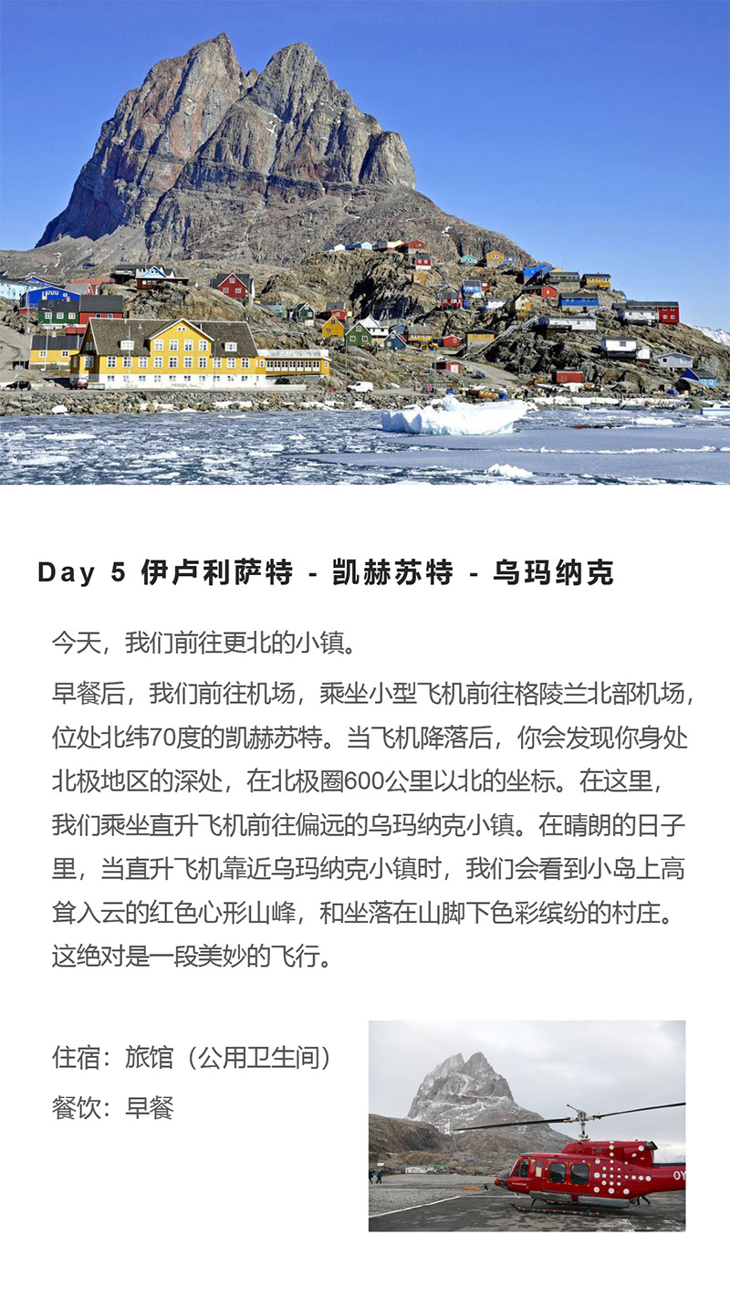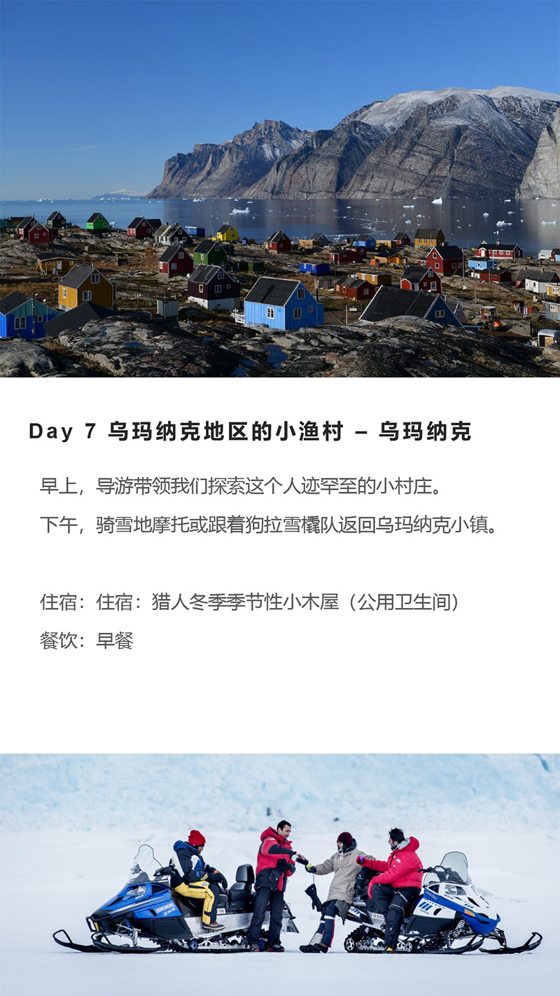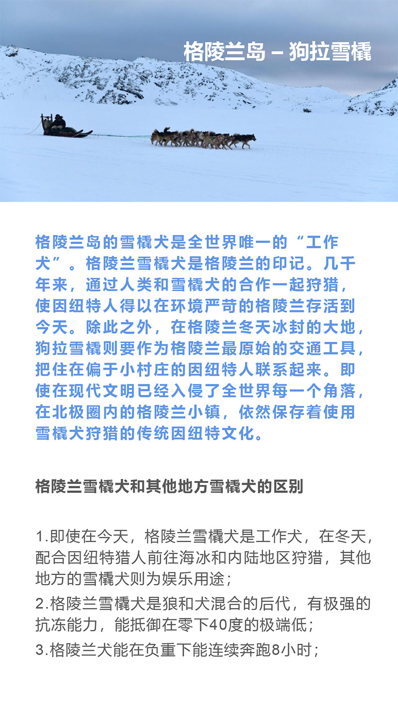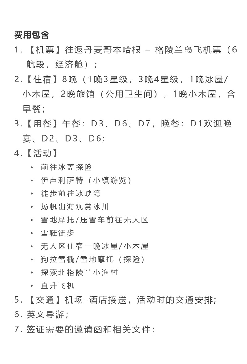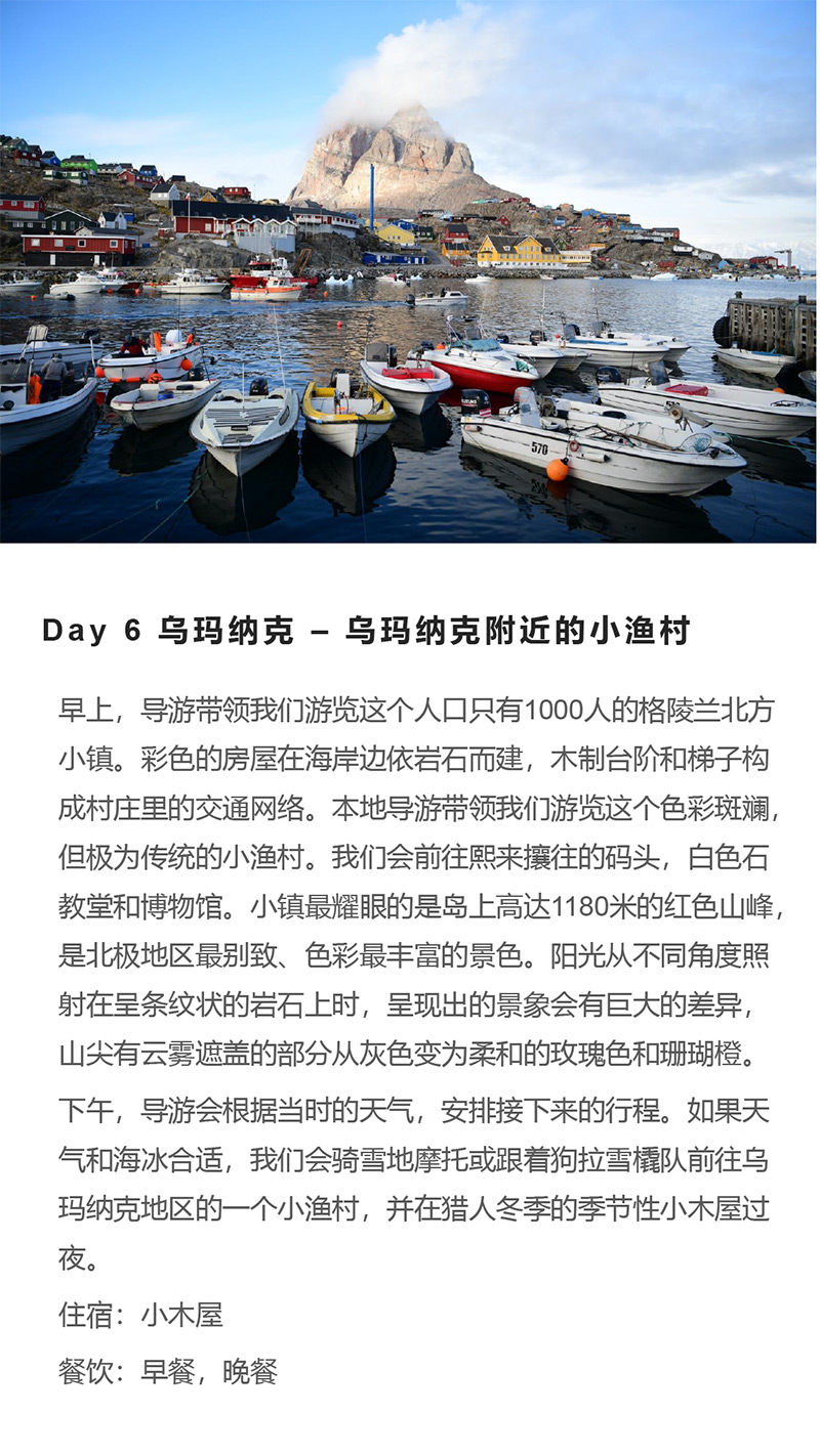 深入北极圈600公里,进行2次极地小型探险;观赏万天飞舞的北极光;探索北半球最大冰盖–格陵兰冰盖;寻找北极野生动物;探索世界遗产–伊卢利萨特冰峡湾;扬帆前往迪斯科湾观赏巨大冰山;安排乘直升飞机前往偏远格陵兰地区;乘雪地摩托,前往内陆无人区,用雪 鞋徒步方式前往冰峡湾,住宿传统因纽特人冰屋;跟随因纽特狗拉雪橇队,深入格陵兰 北部的传统小渔村,住宿因纽特人的冬天狩猎时 的季节性居所;
