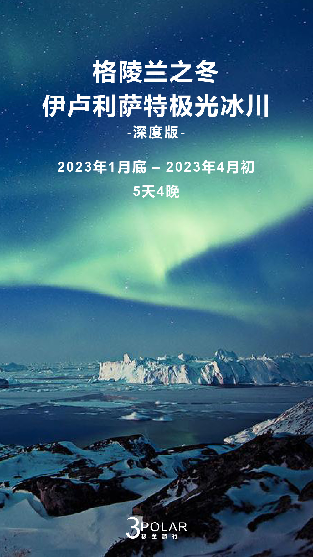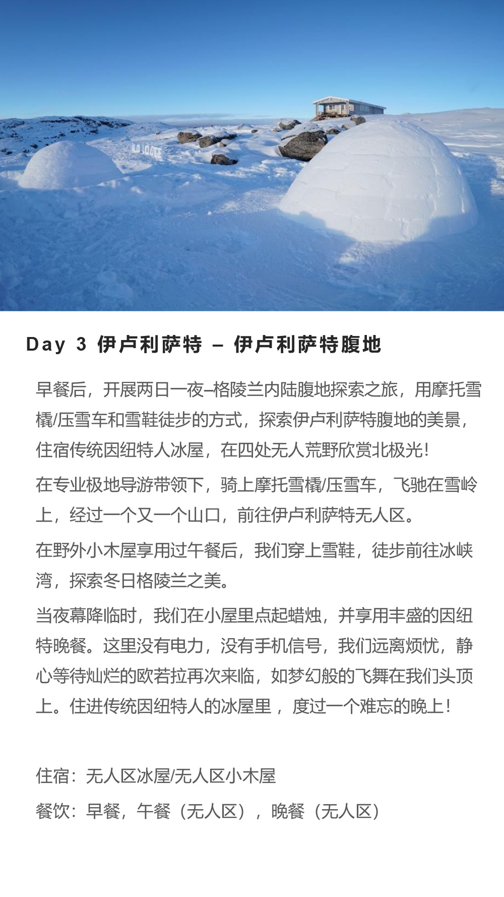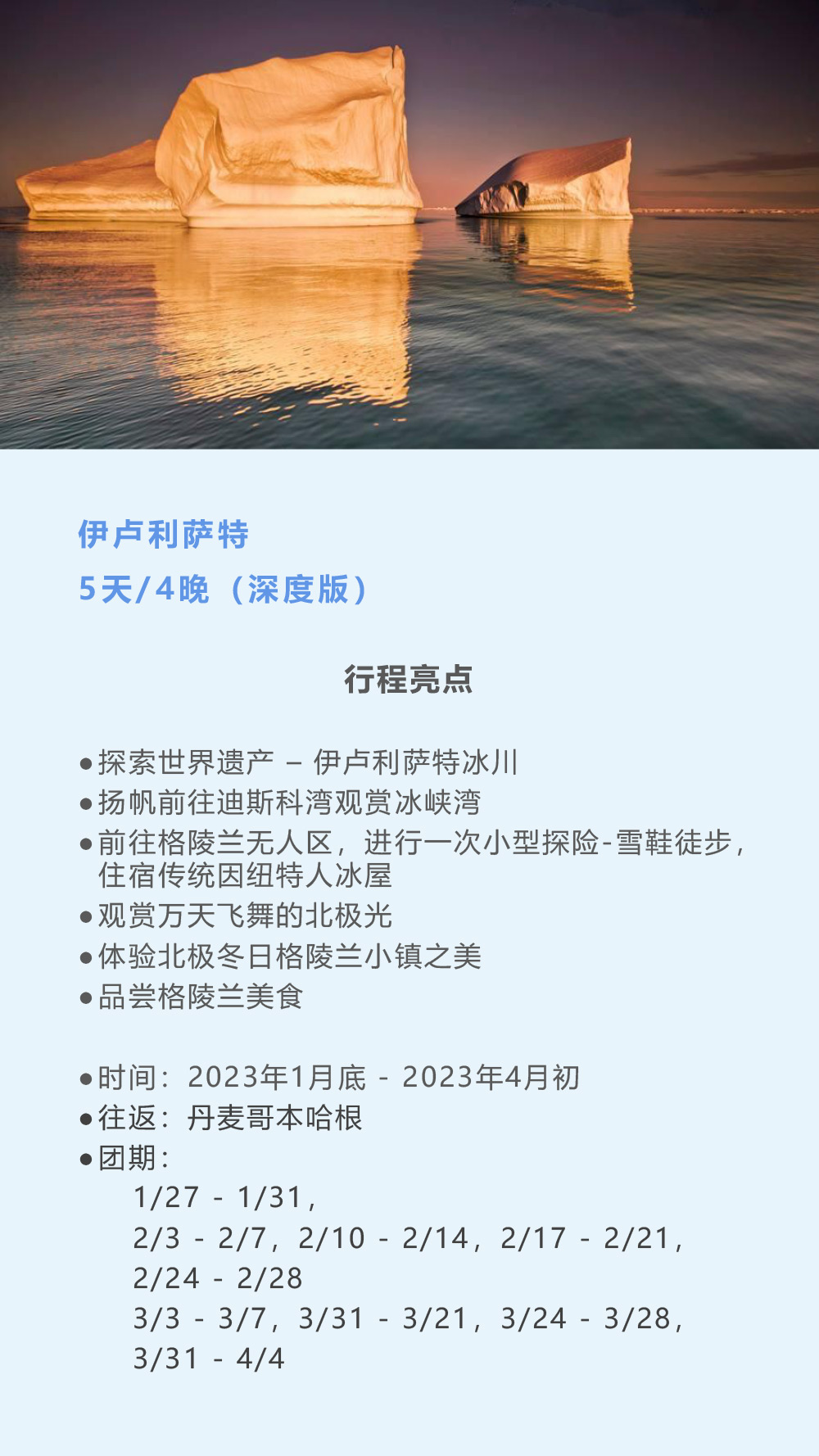 ●探索世界遗产 – 伊卢利萨特冰川 ●扬帆前往迪斯科湾观赏冰峡湾 ●前往格陵兰无人区,进行一次小型探险-雪鞋徒步, 住宿传统因纽特人冰屋 ●观赏万天飞舞的北极光 ●体验北极冬日格陵兰小镇之美