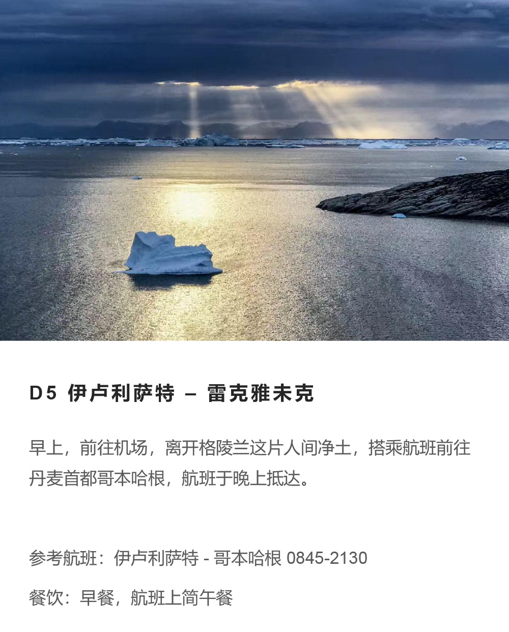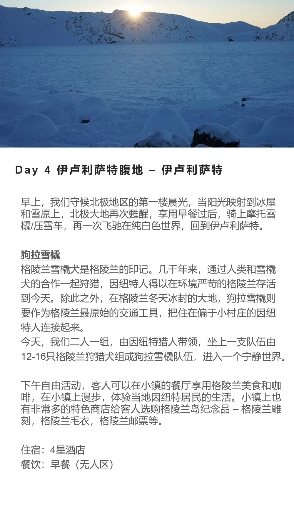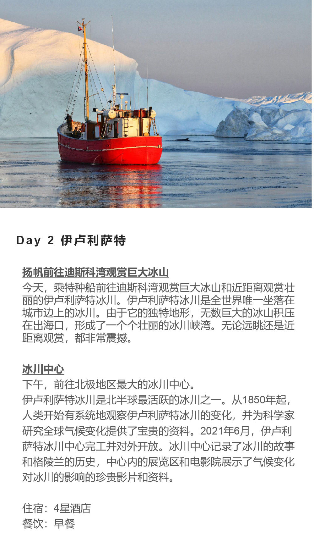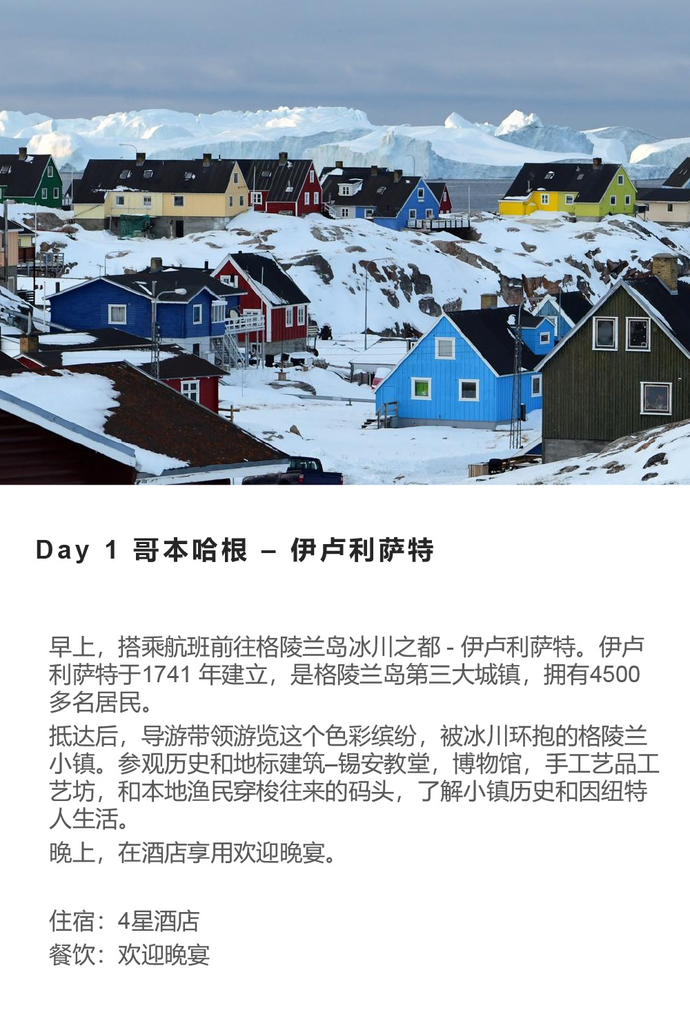 ●探索世界遗产 – 伊卢利萨特冰川 ●扬帆前往迪斯科湾观赏冰峡湾 ●前往格陵兰无人区,进行一次小型探险-雪鞋徒步, 住宿传统因纽特人冰屋 ●观赏万天飞舞的北极光 ●体验北极冬日格陵兰小镇之美