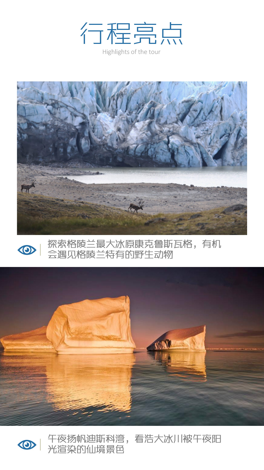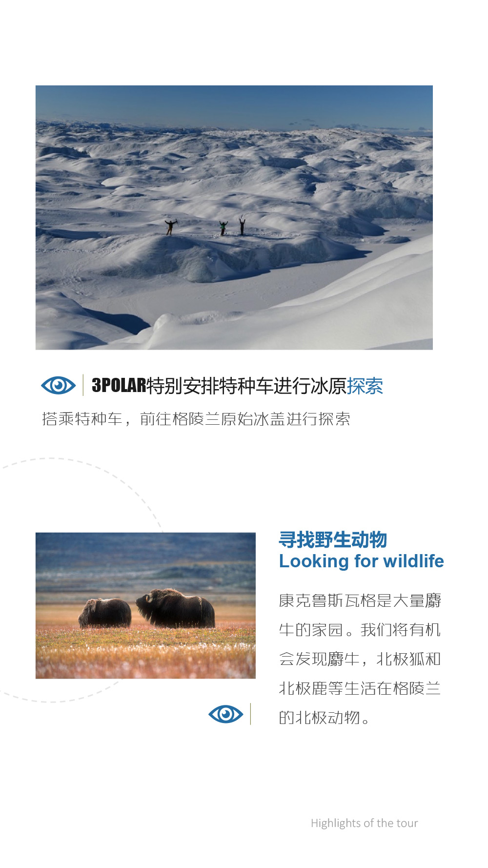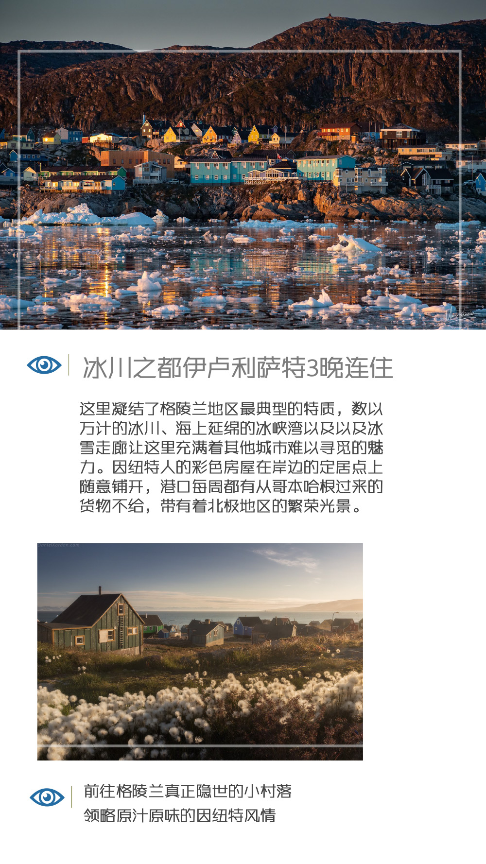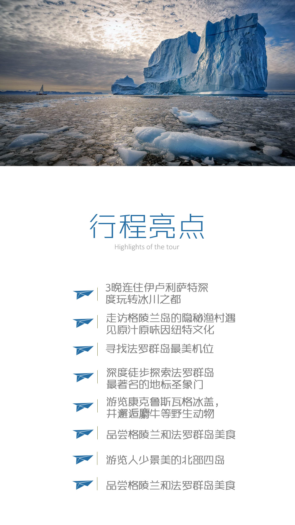 3晚连住伊卢利萨特深度玩转冰川之都;走访格陵兰岛的隐秘渔村遇见原汁原味因纽特文化;寻找法罗群岛最美机位;深度徒步探索法罗群岛最著名的地标圣象门; 游览康克鲁斯瓦格冰盖,并邂逅麝牛等野生动物;品尝格陵兰和法罗群岛美食;游览人少景美的北部四岛;品尝格陵兰和法罗群岛美食