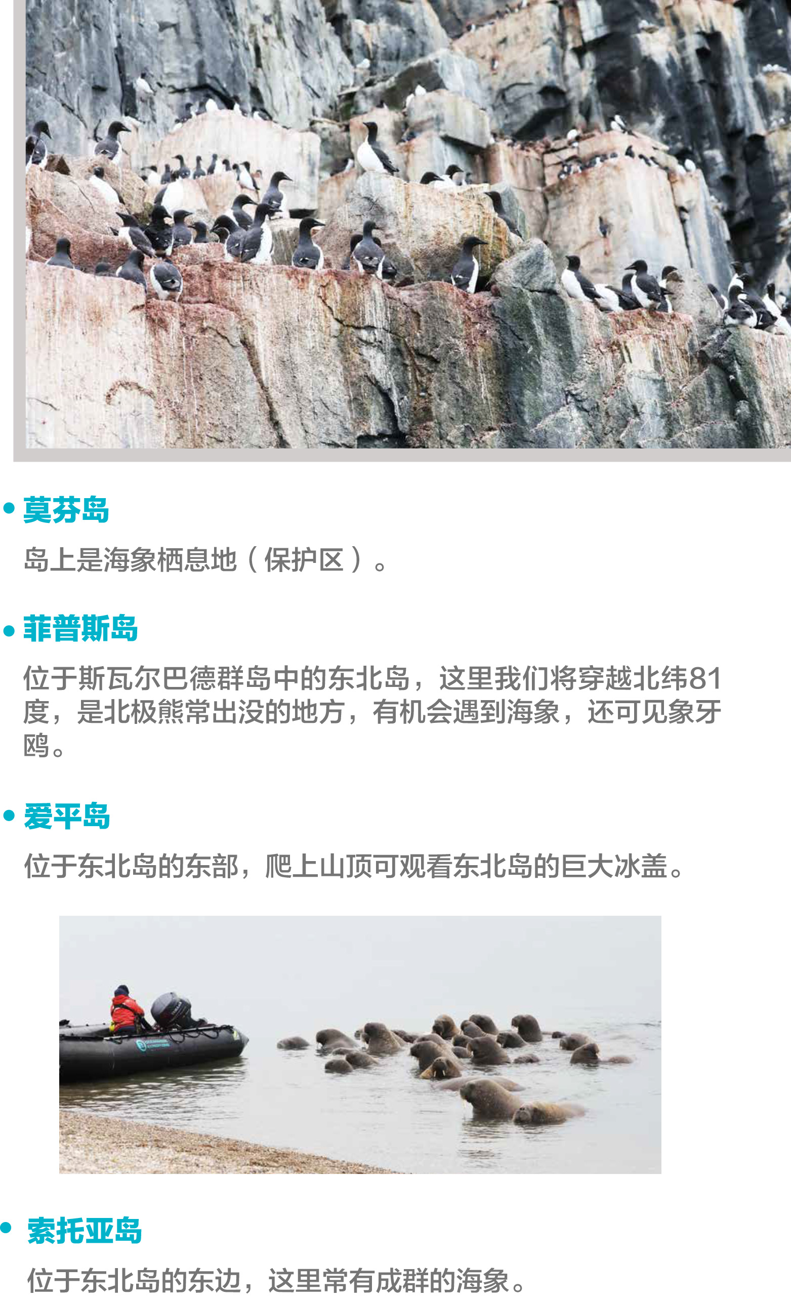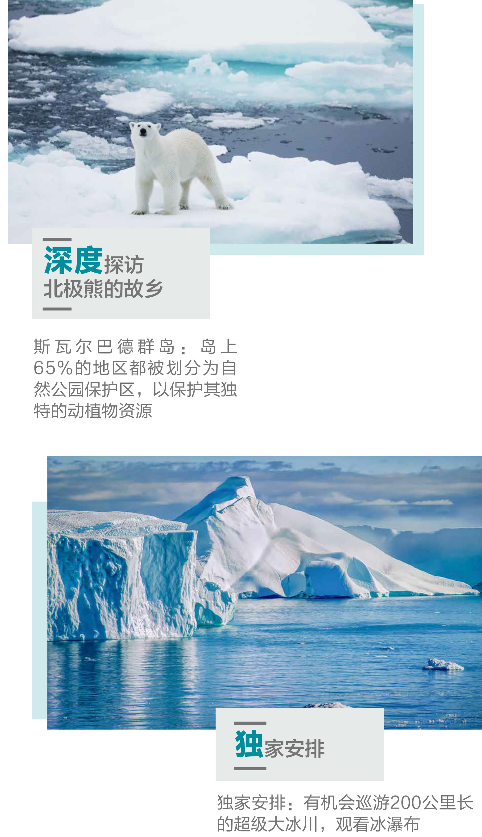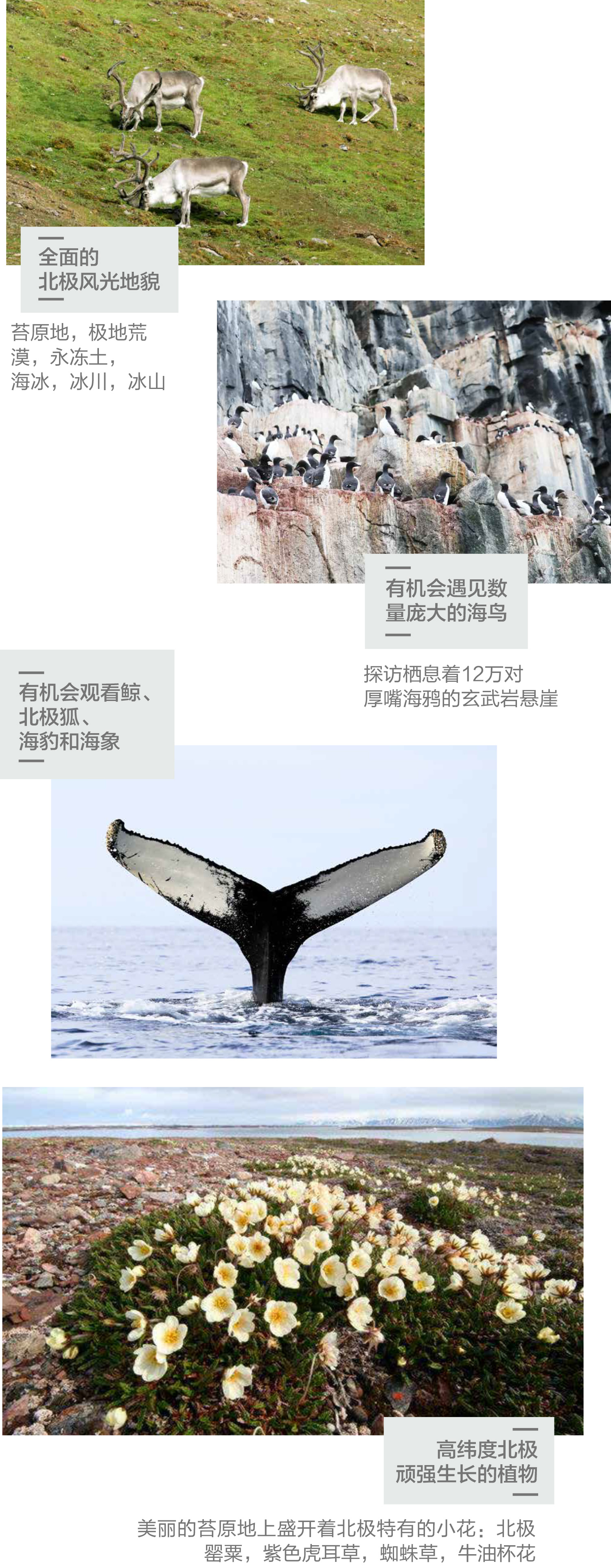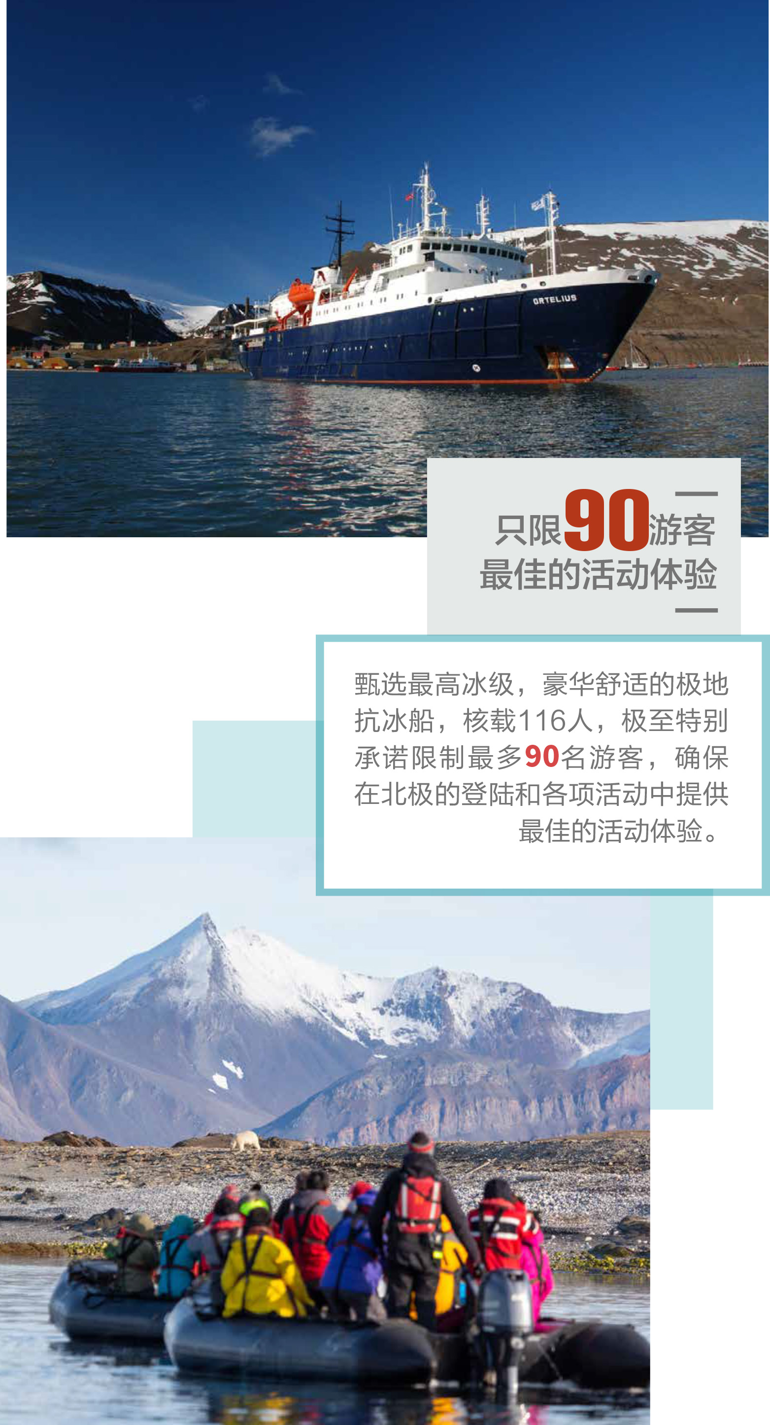 确保最大的几率近观北极熊;只限90游客最佳的活动体验;深度探访北极熊的故乡;有机会观看鲸、北极狐、海豹和海象;全面的北极风光地貌;有机会遇见数量庞大的海鸟