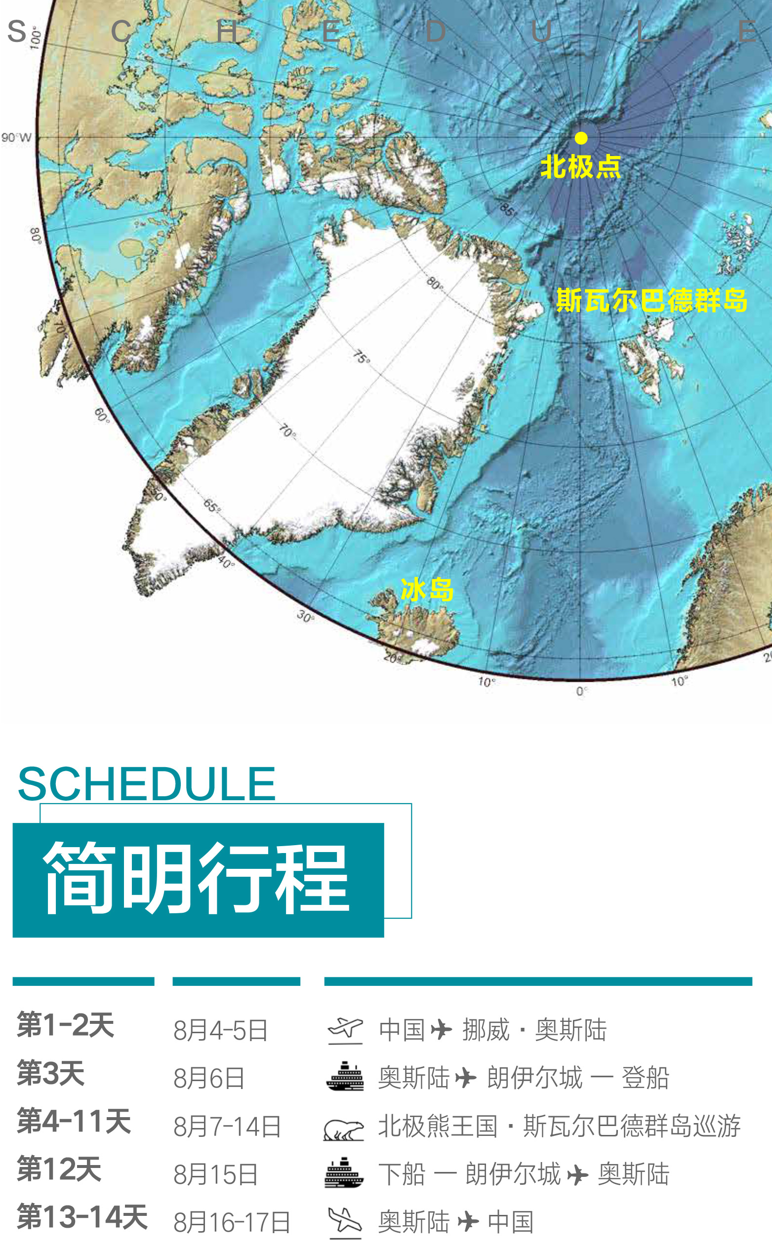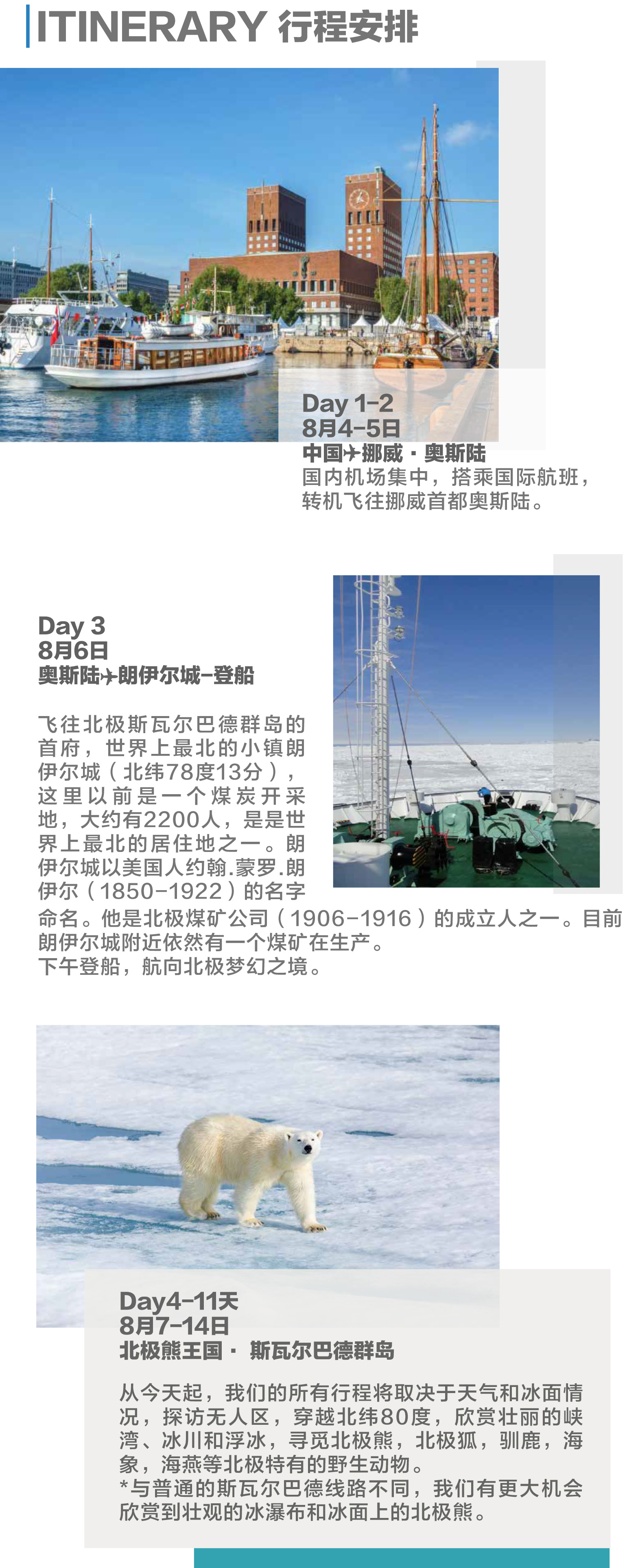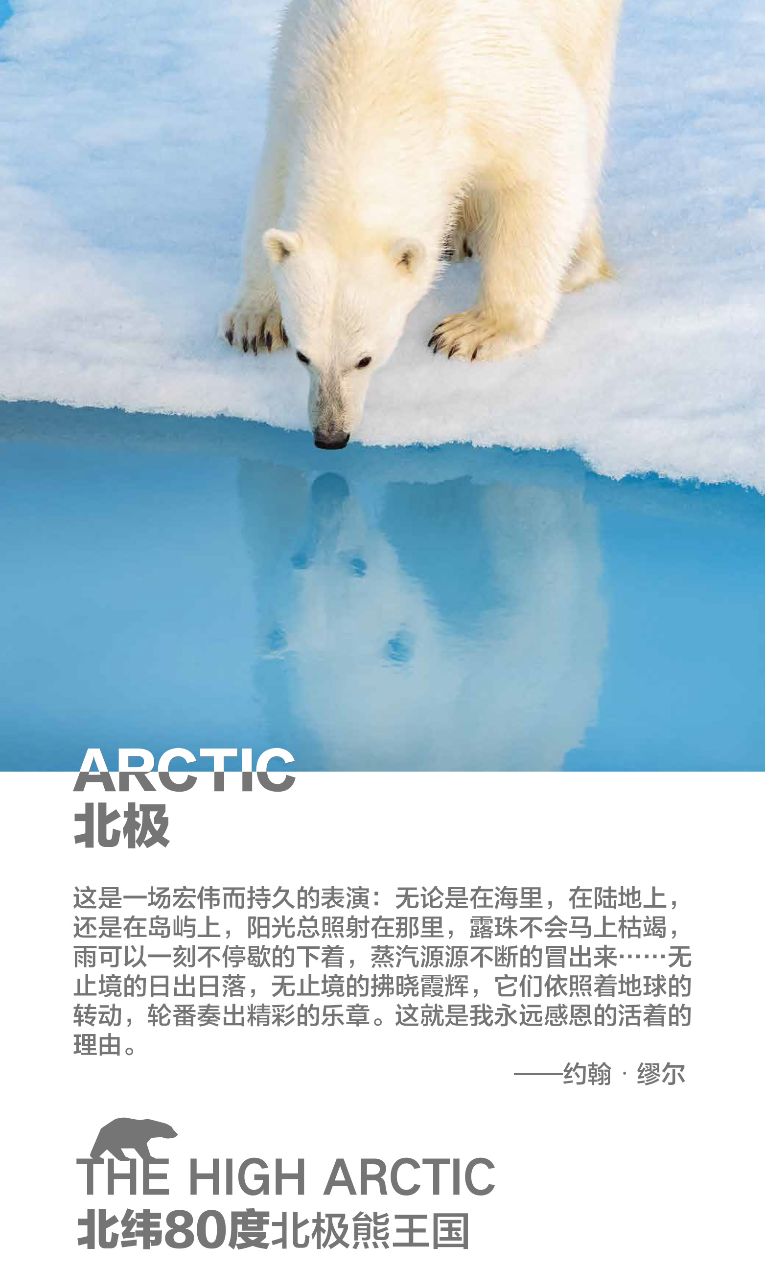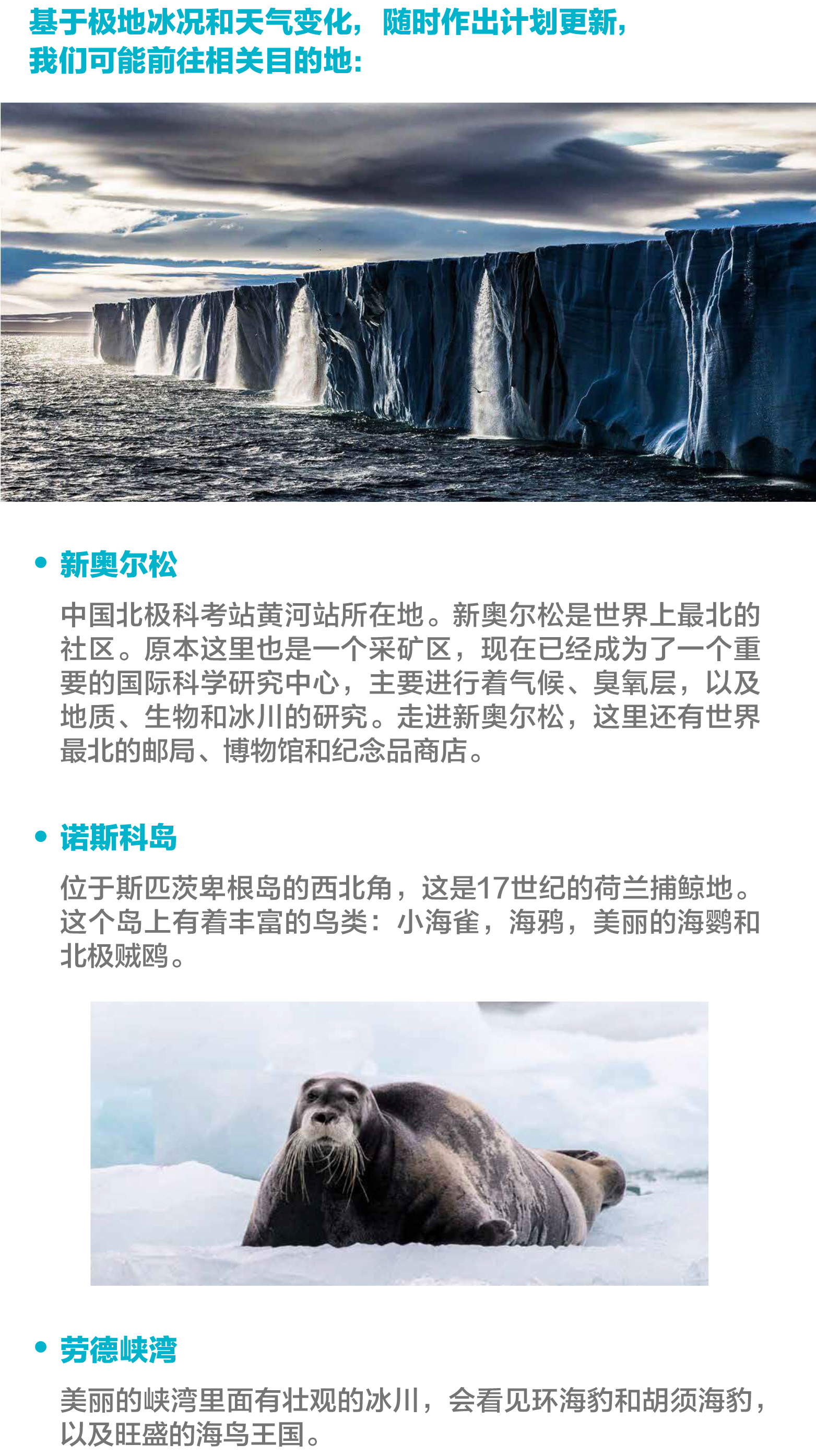 确保最大的几率近观北极熊;只限90游客最佳的活动体验;深度探访北极熊的故乡;有机会观看鲸、北极狐、海豹和海象;全面的北极风光地貌;有机会遇见数量庞大的海鸟