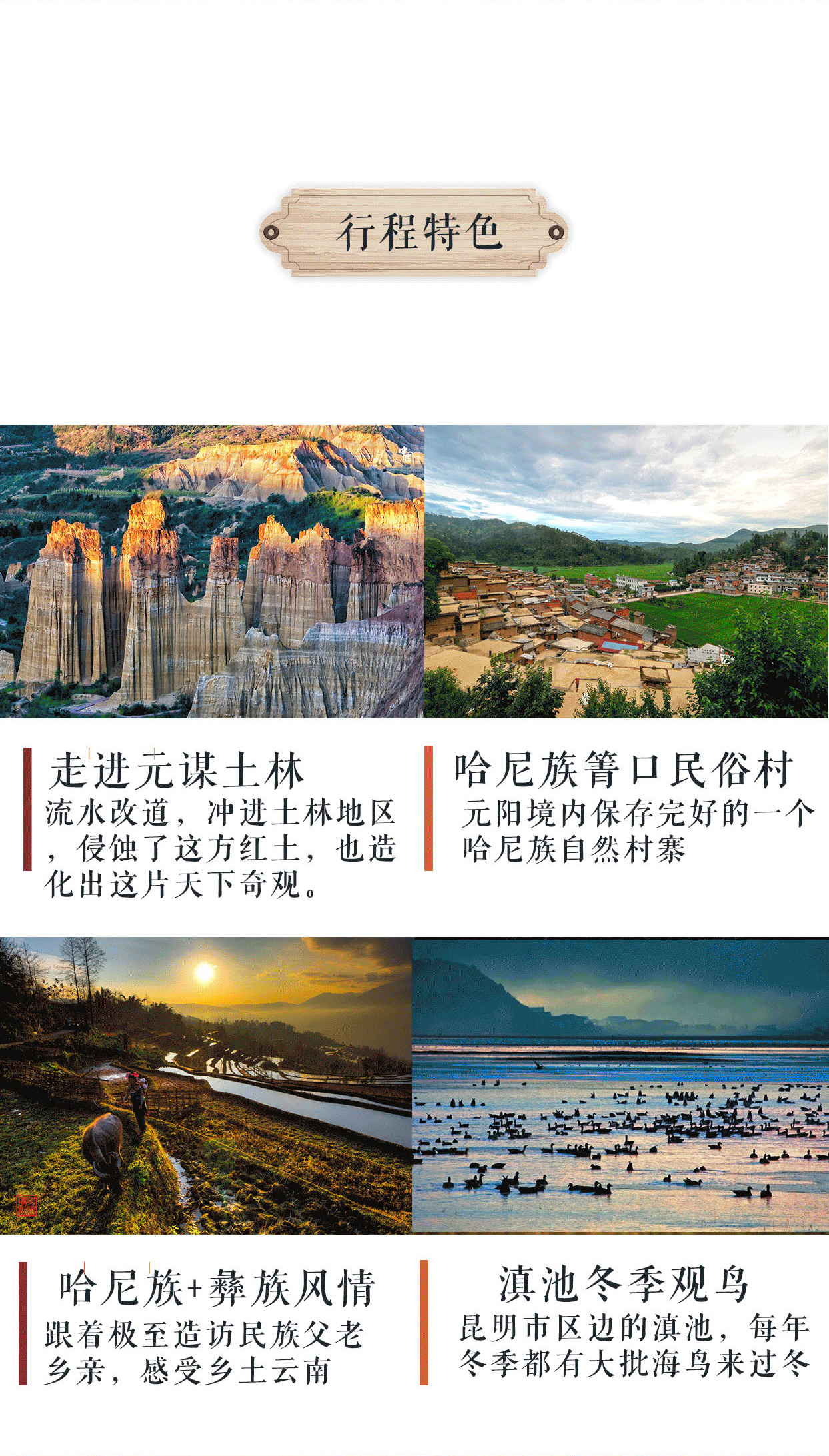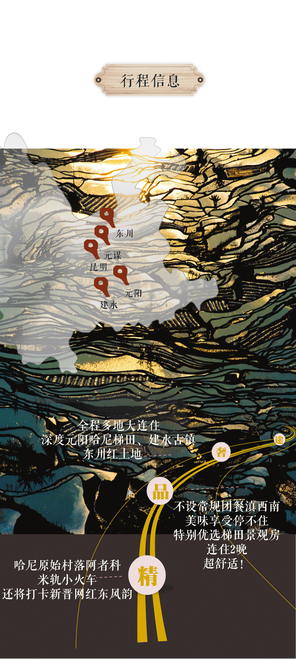 全程多地大连住 深度元阳哈尼梯田、建古水镇 东川红土地,不设常规团餐滇西南 美味享受停不住 特别优选梯田景观房 连住2晚 超舒适,哈尼原始村落阿者科 米轨小火车 还将打卡新晋网红东风韵