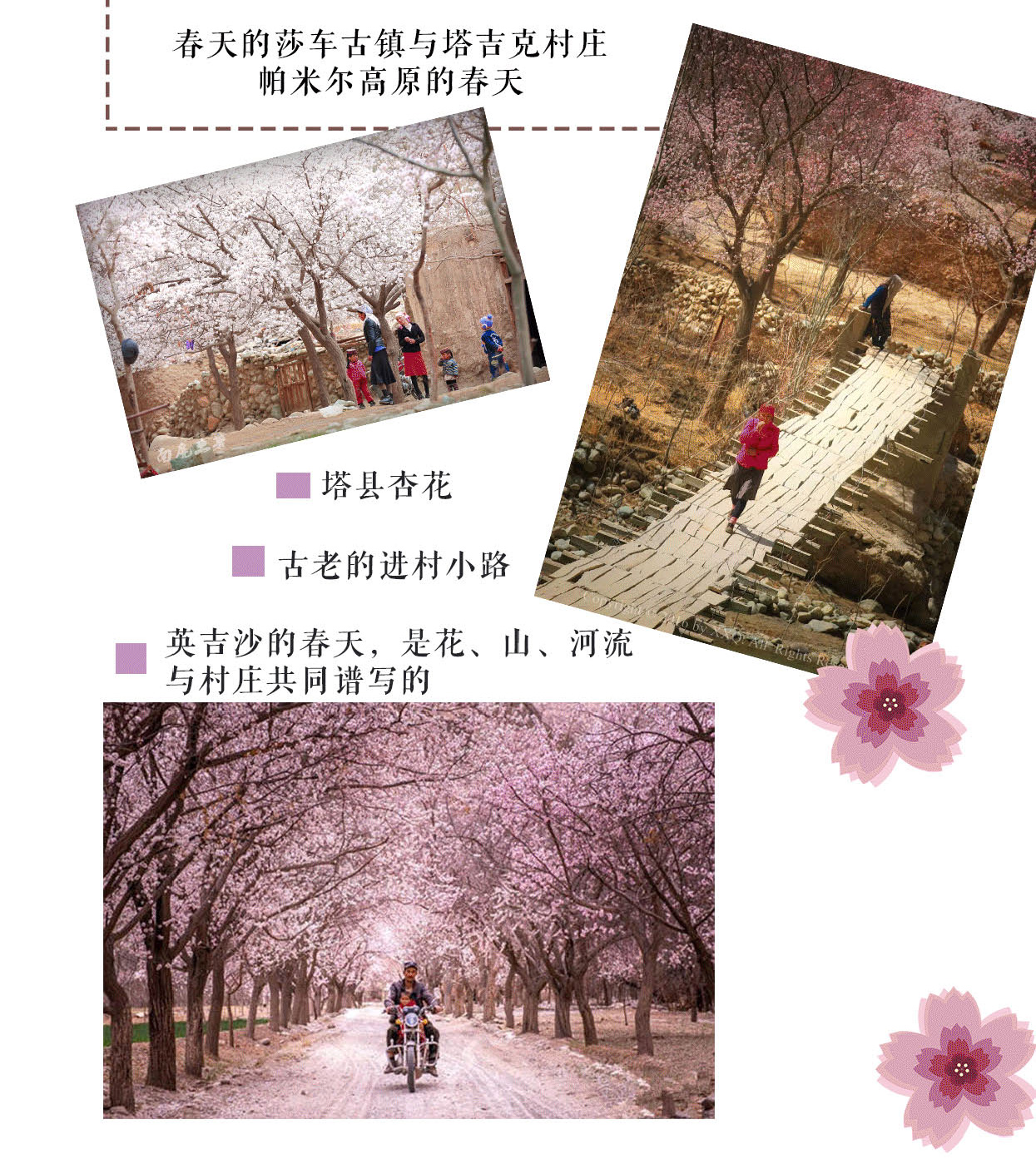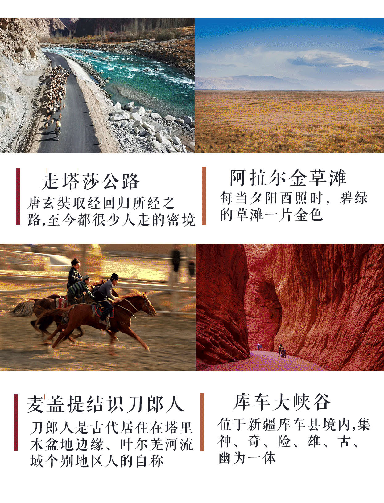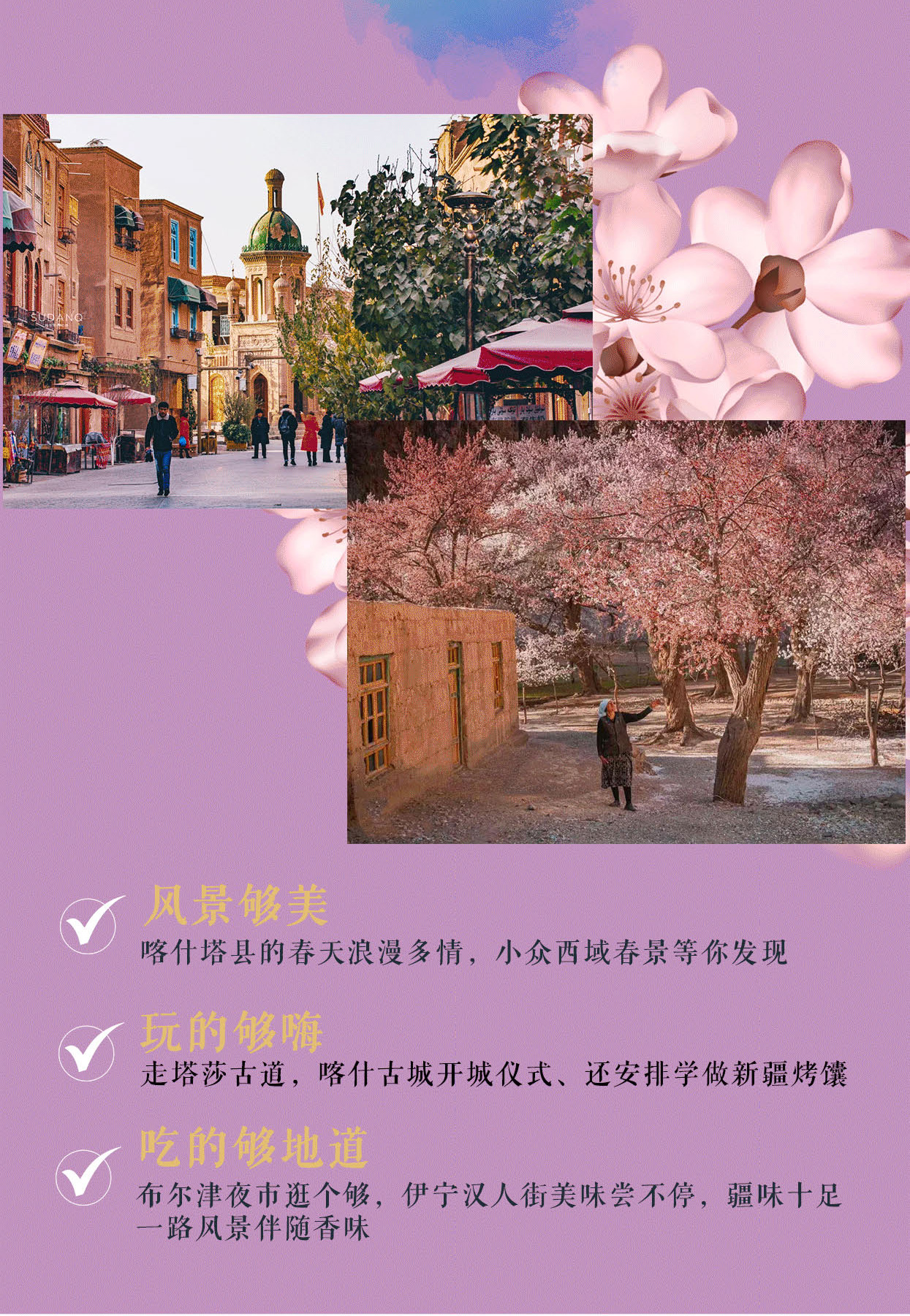 风景够美:喀什塔县的春天浪漫多情,小众西域春景等你发现;玩的够嗨:走塔莎古道,喀什古城开城仪式、还安排学做新疆烤馕;吃的够地道:布尔津夜市逛个够,伊宁汉人街美味尝不停,疆味十足,一路风景伴随香味。