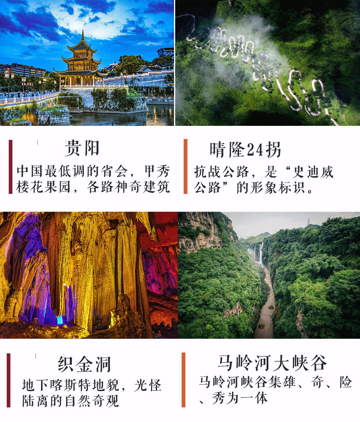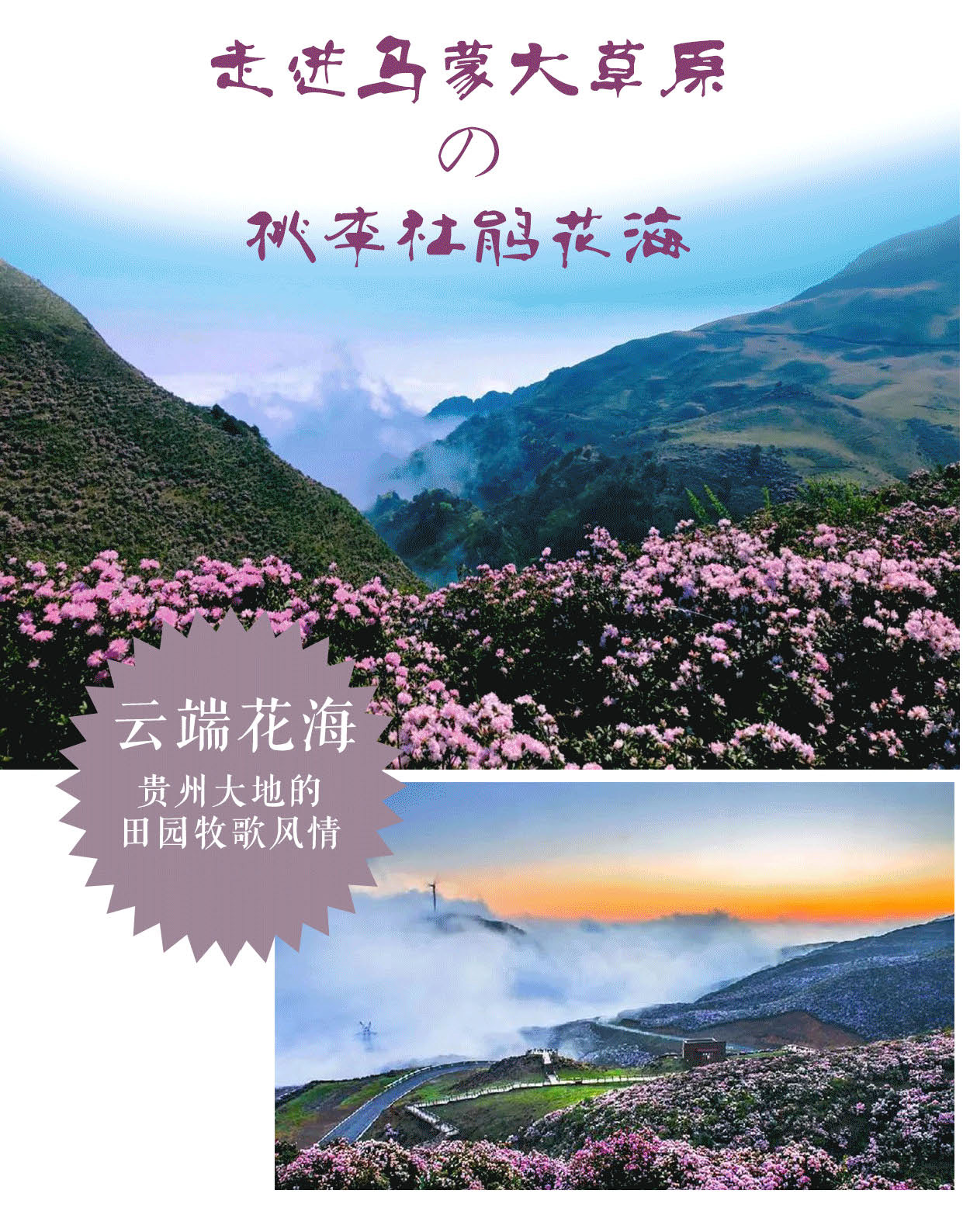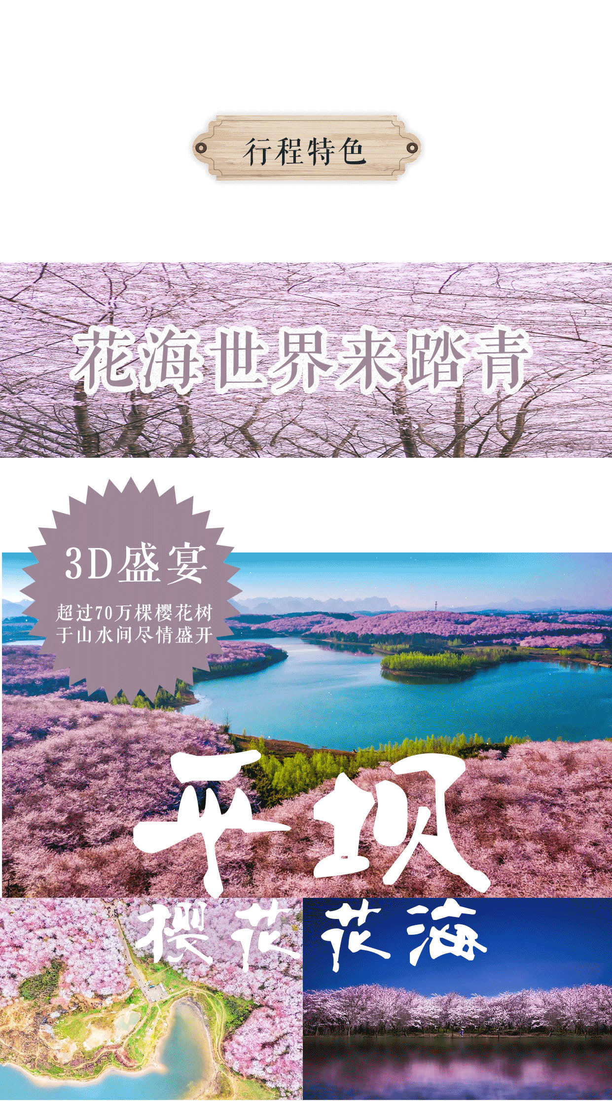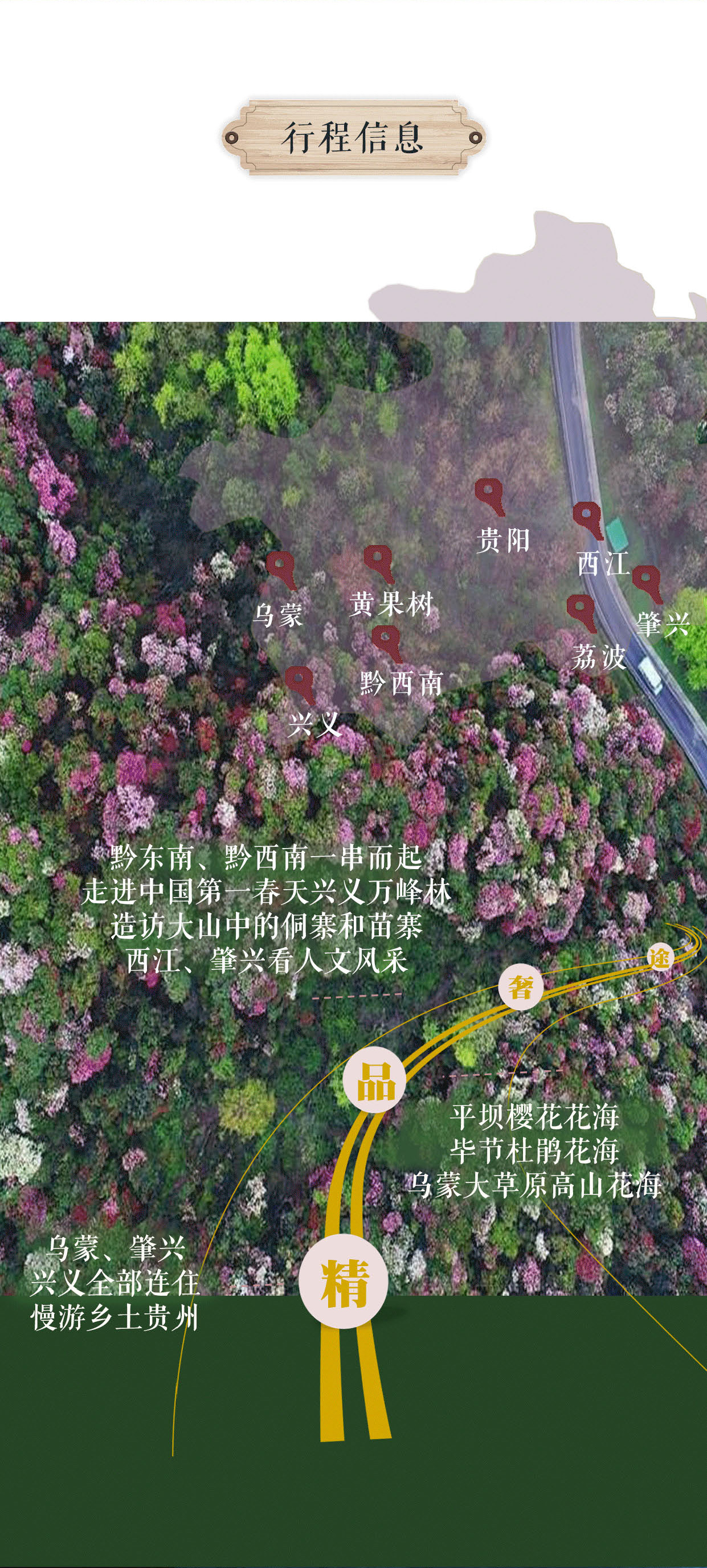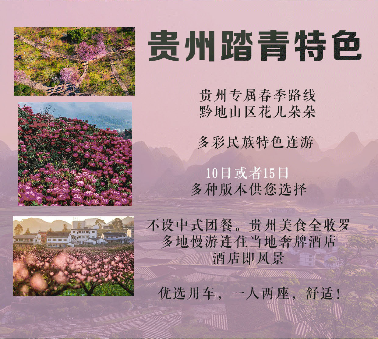 贵州专属春季路线;黔地山区花儿朵朵;多彩民族特色连游;10日或者15日多种版本供您选择;不设中式团餐。贵州美食全收罗;多地慢游连住当地奢牌酒店;酒店即风景;优选用车,一人两座,舒适!