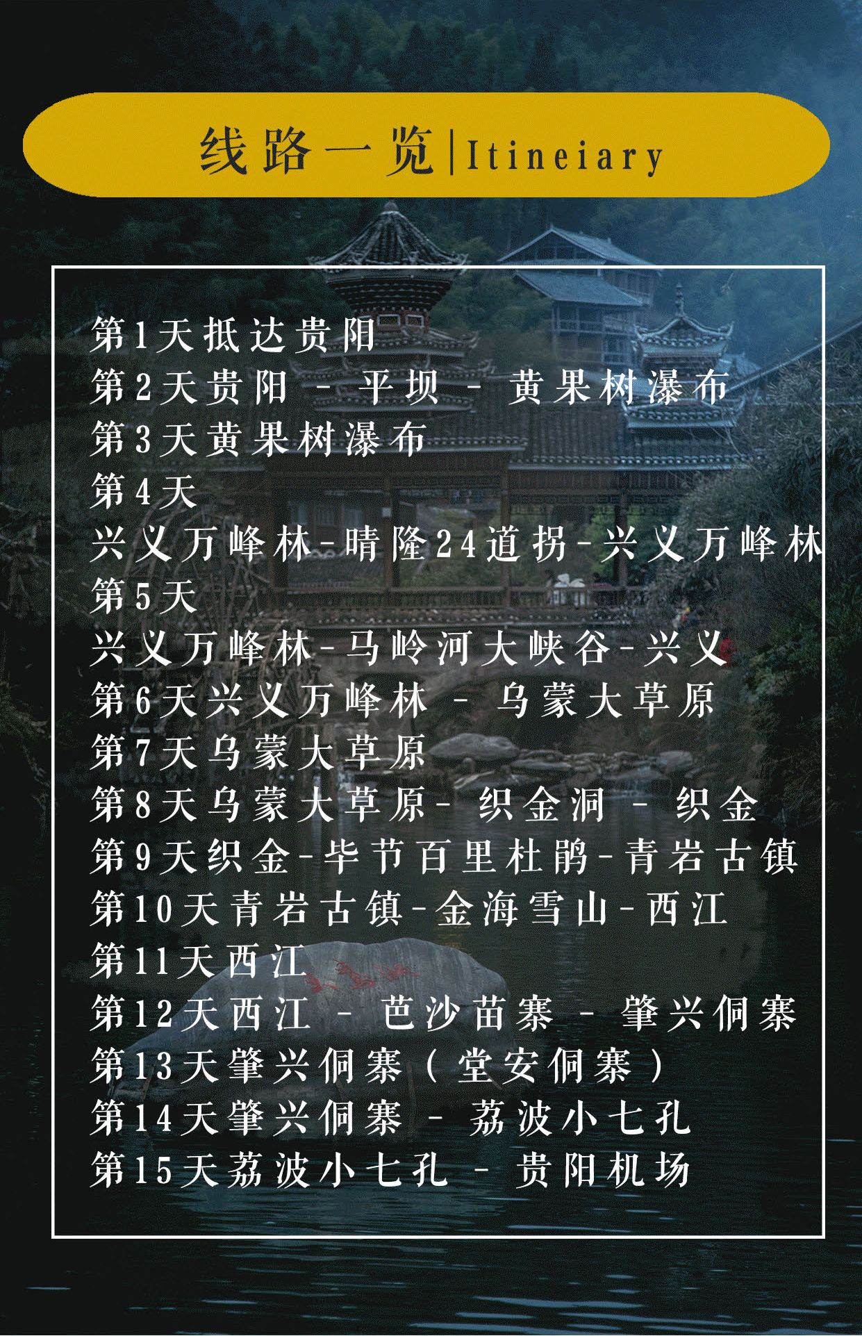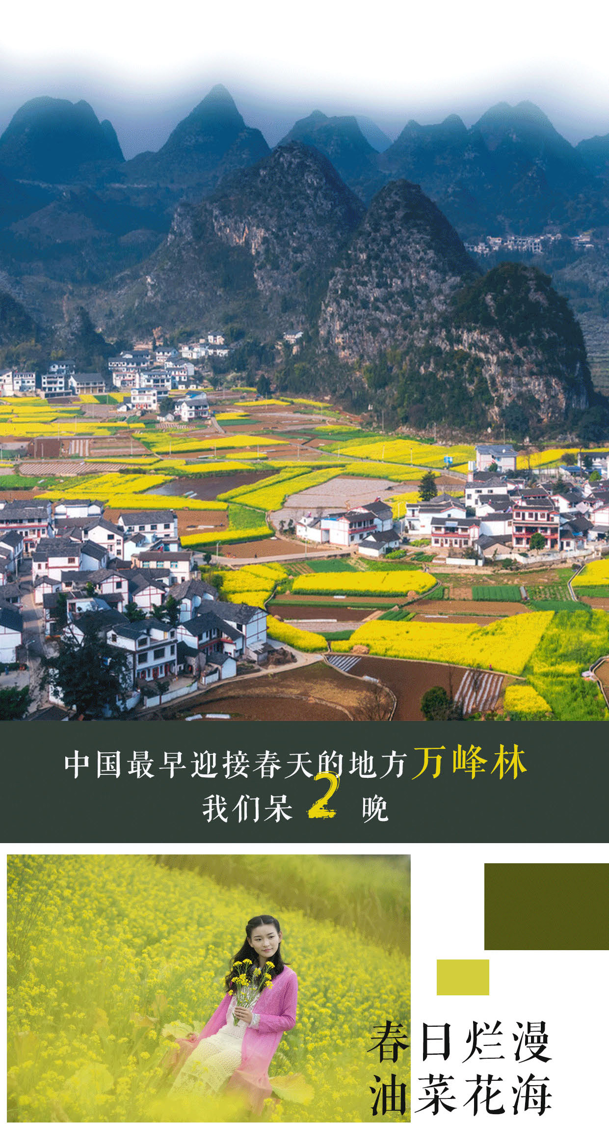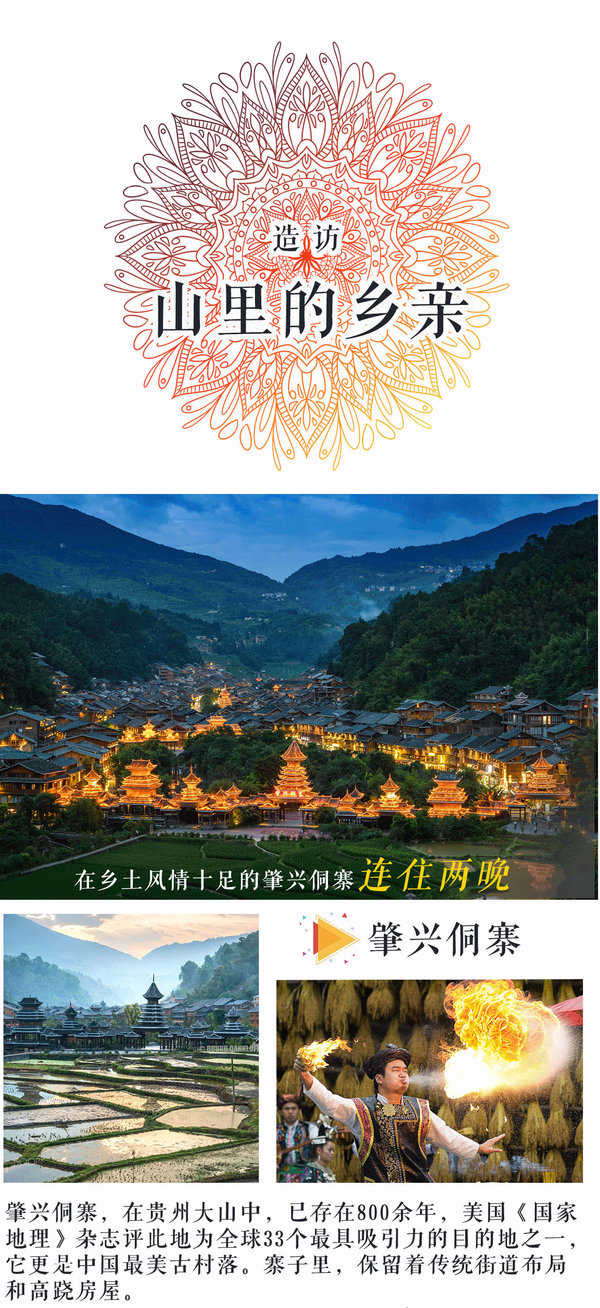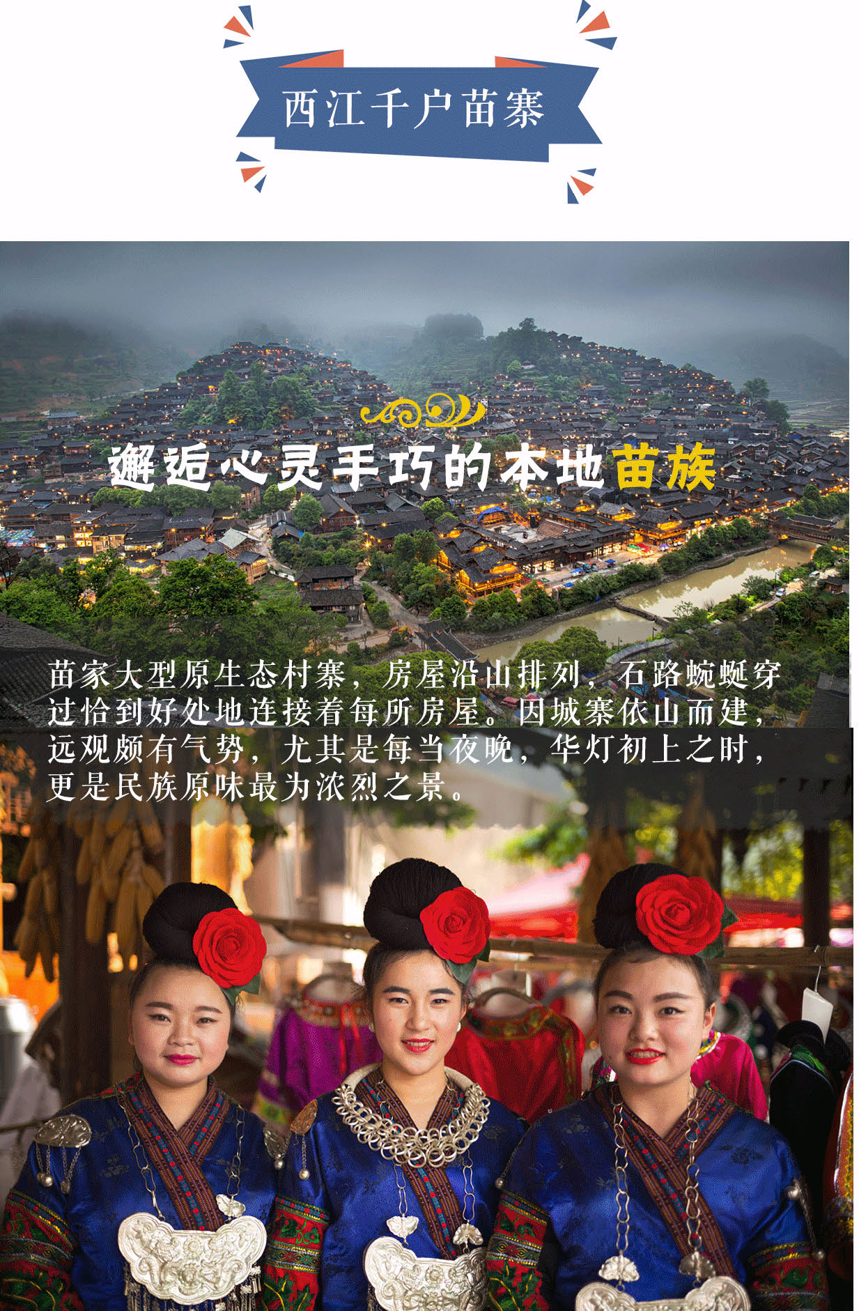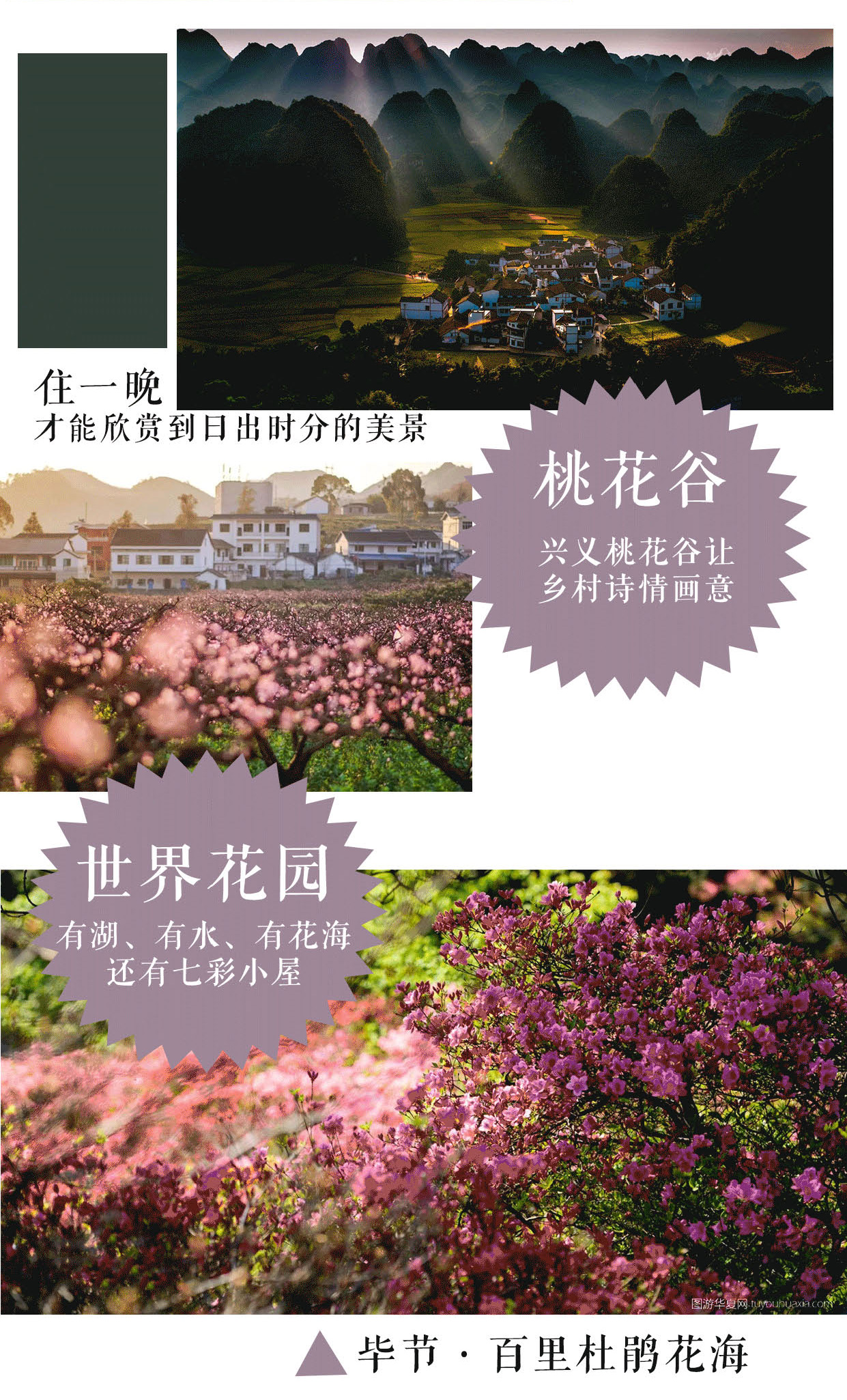贵州专属春季路线;黔地山区花儿朵朵;多彩民族特色连游;10日或者15日多种版本供您选择;不设中式团餐。贵州美食全收罗;多地慢游连住当地奢牌酒店;酒店即风景;优选用车,一人两座,舒适!