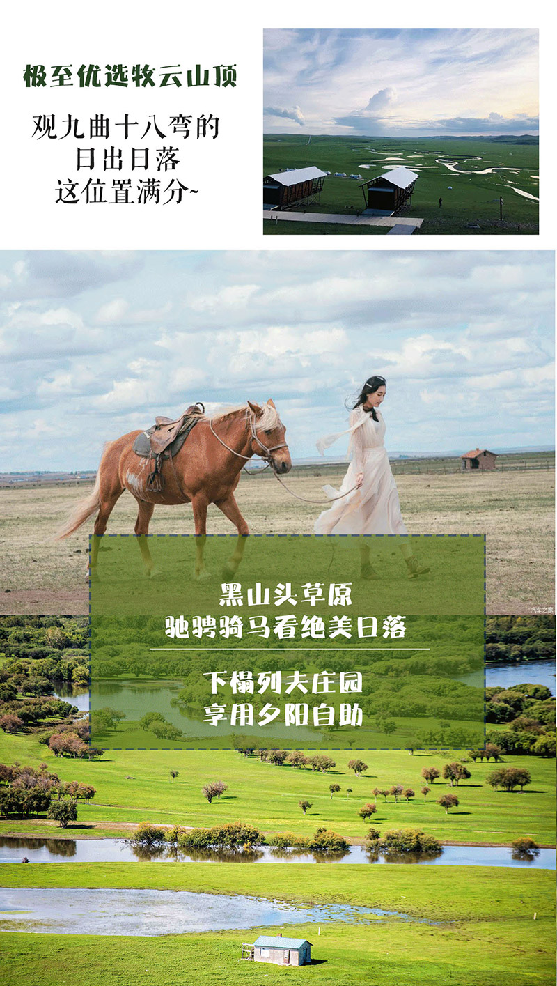 住在莫尔格勒河边 优选牧云山顶 观九曲十八弯是日出日落 黑山头草原驰骋骑马看绝美日落 下榻列夫庄园享用夕阳自助