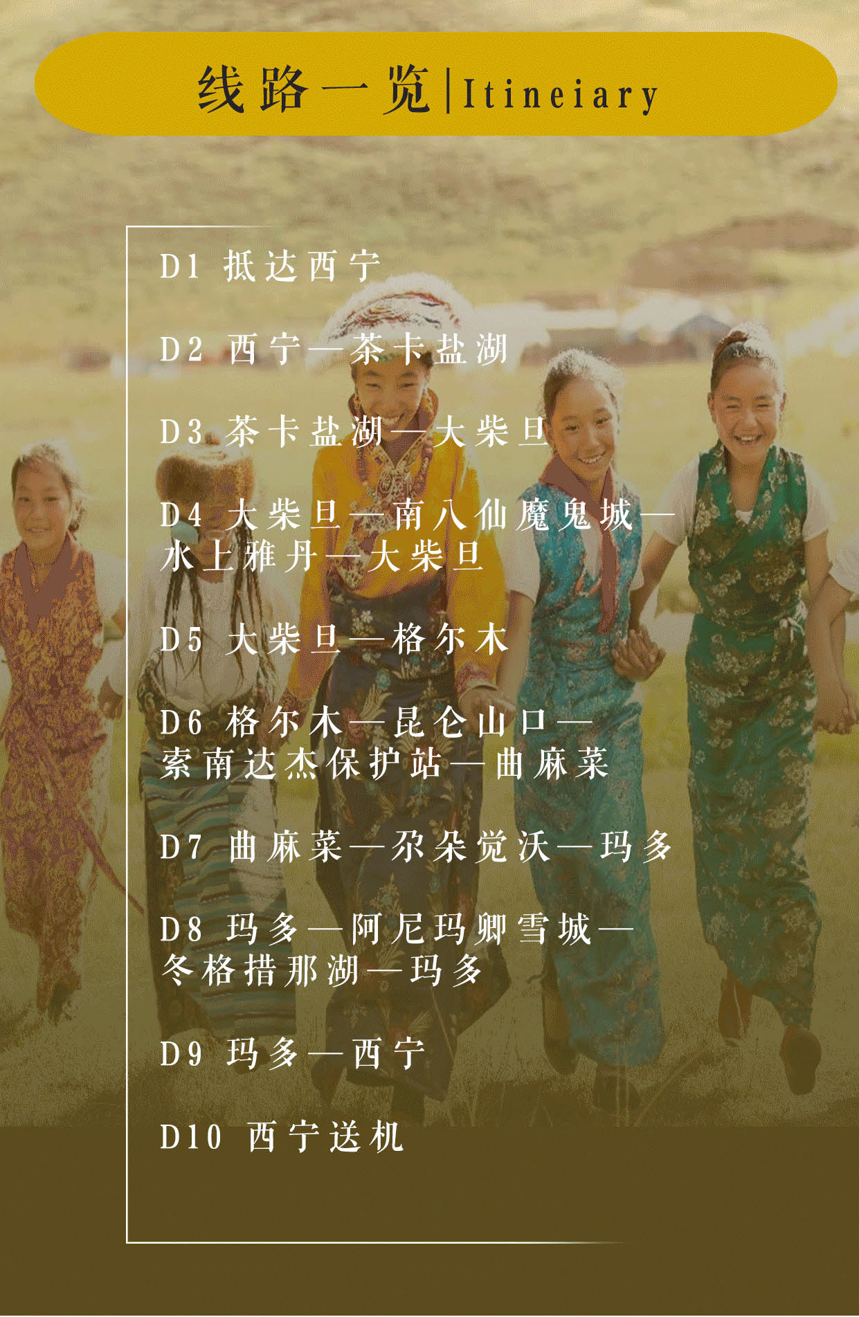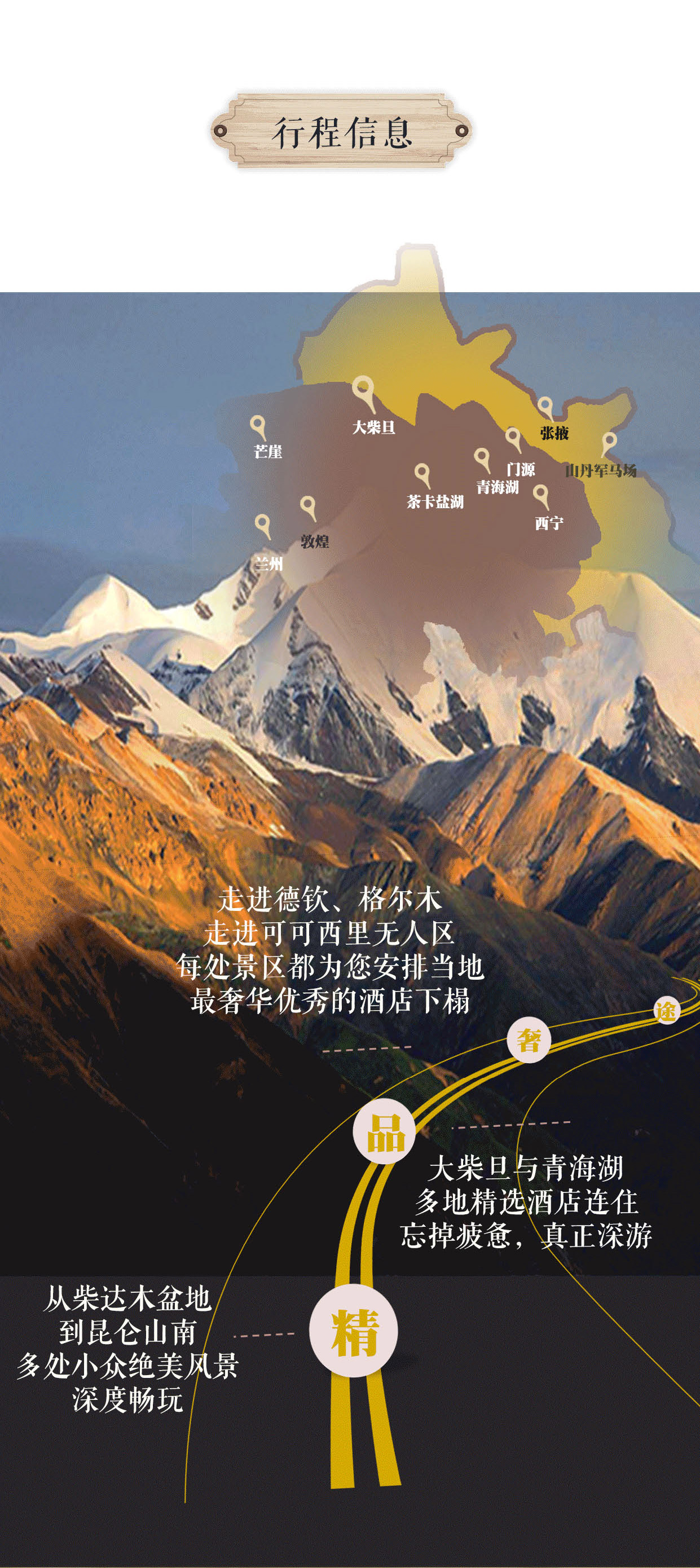 走进德钦、格尔木 走进可可西里无人区 每处景区都为您安排当地最奢华优秀的酒店下榻,大柴旦与青海湖 多地精选酒店连住 忘掉疲惫,真正深游,从柴达木盆地到昆仑山南多处小众绝美风景深度畅玩