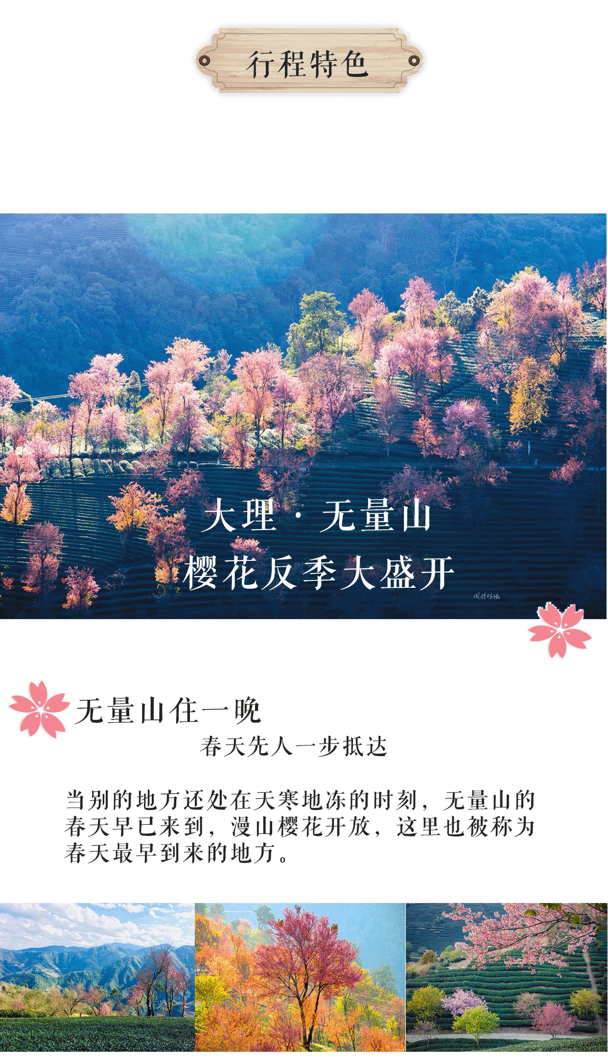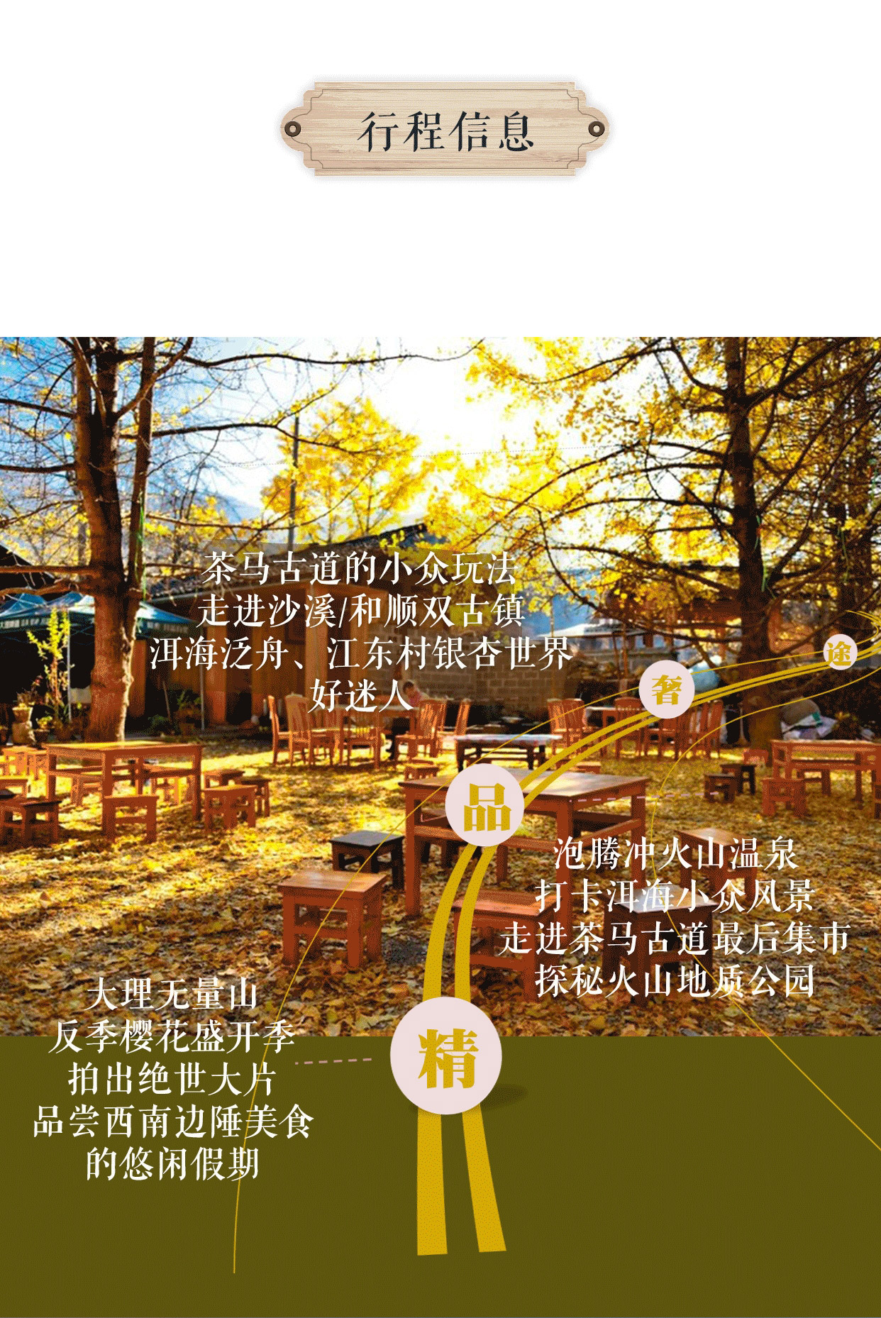 茶马古道的小众玩法 走进沙溪/和顺双古镇 洱海泛舟、江东村银杏世界好迷人;泡腾冲火山温泉 打卡洱海小众风景 走进茶马古道最后集市 探秘火山地质公园;大理无量山 反季樱花盛开季 拍出绝世大片 品尝西南边陲美食的悠闲假期