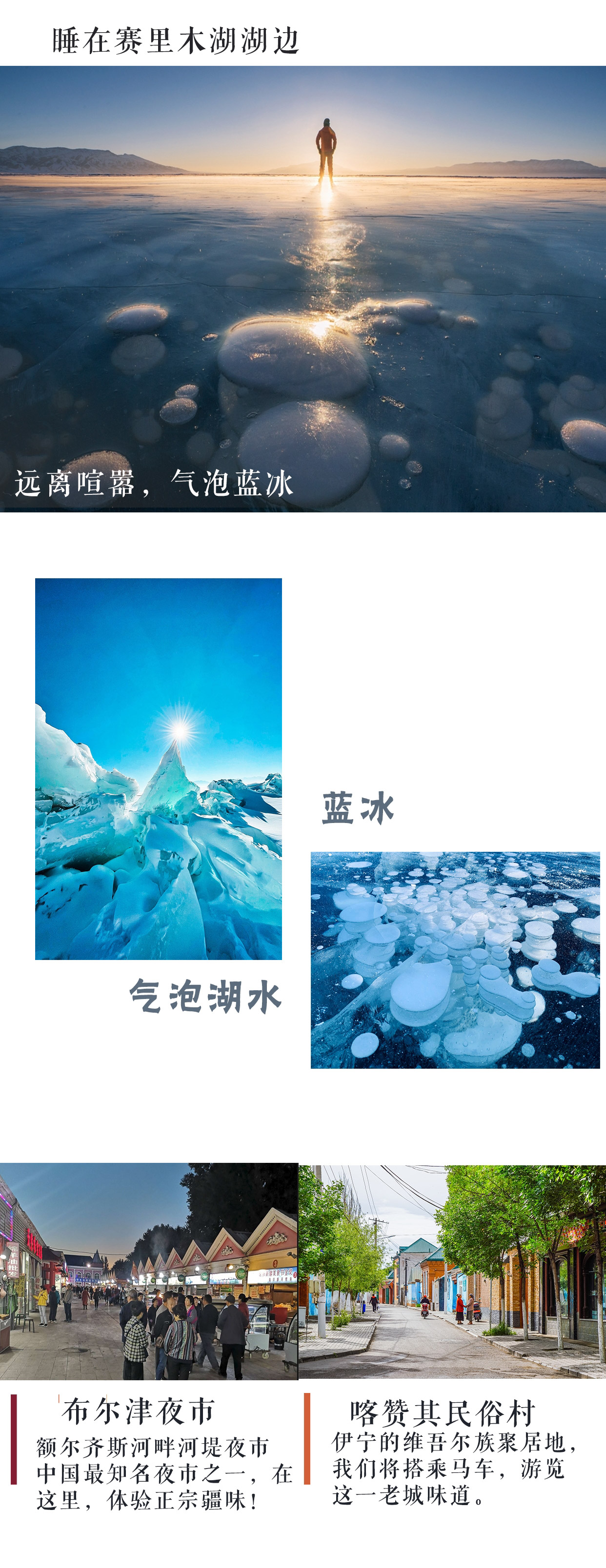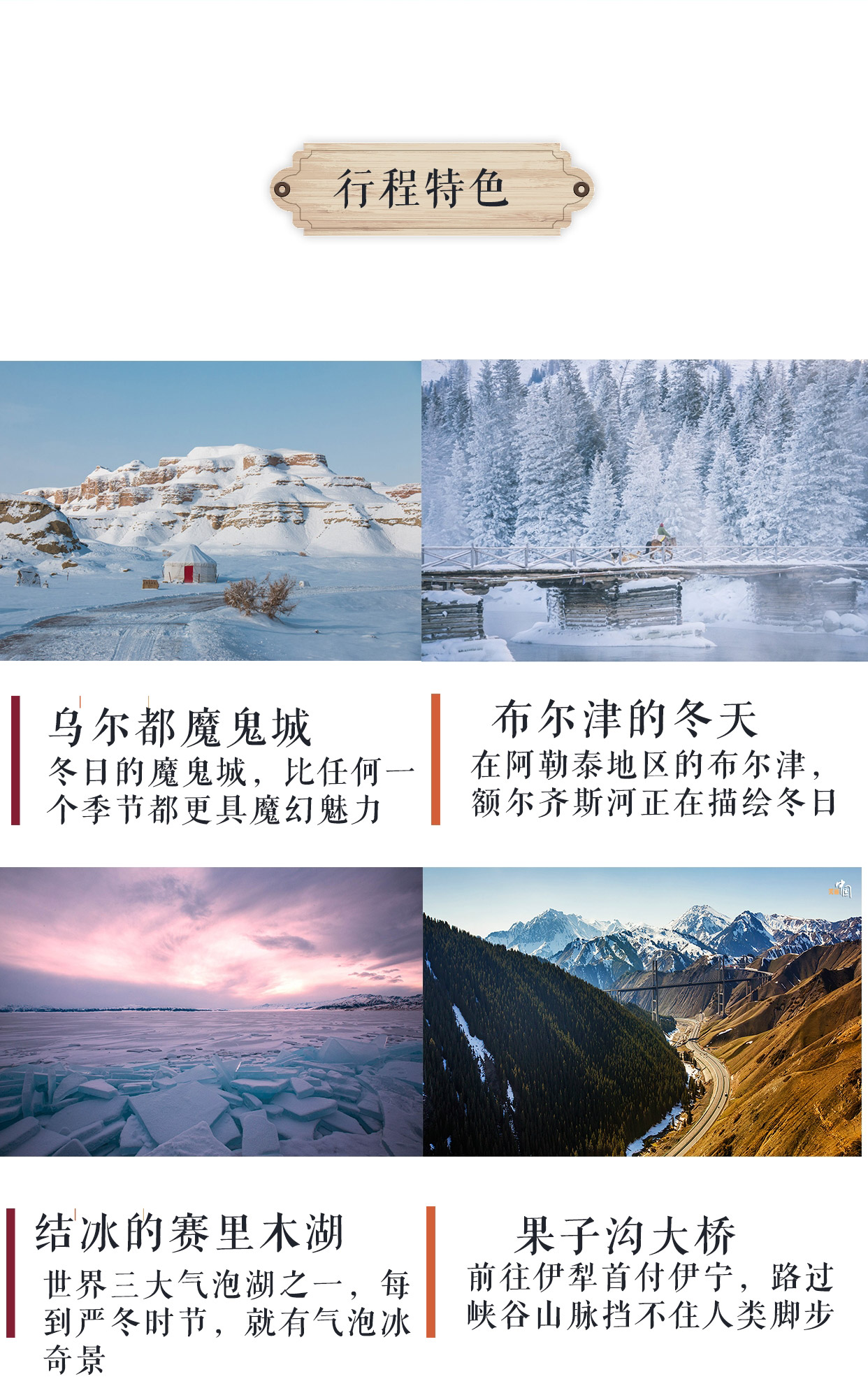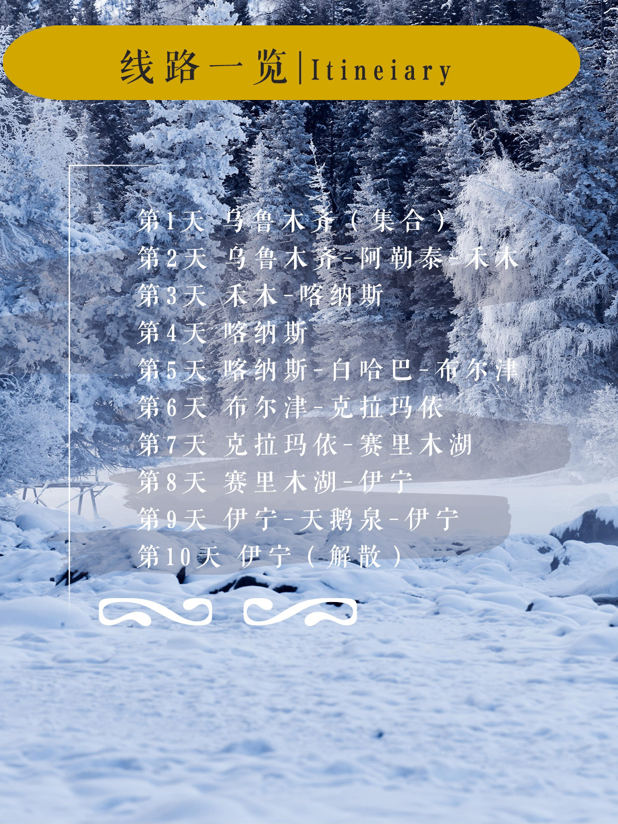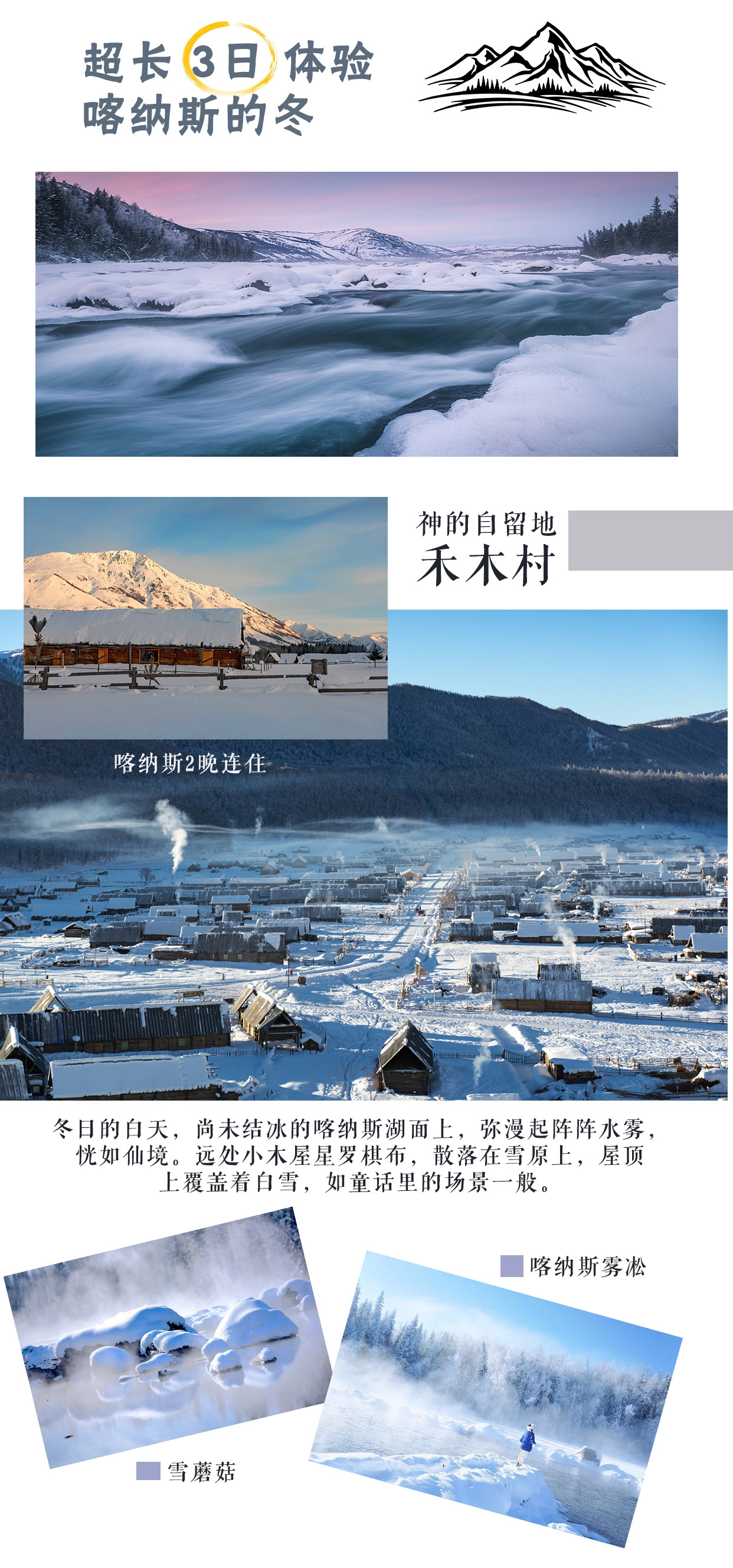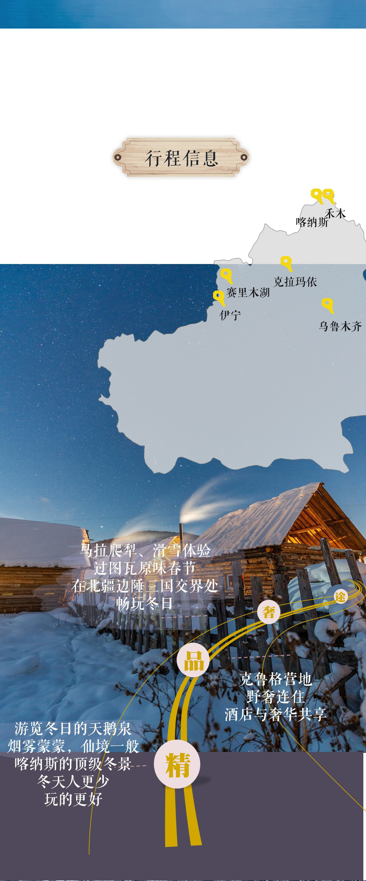 马拉爬犁、滑雪体验、过图瓦原味春节、在北疆边陲三国交界处畅玩冬日;游览冬日的天鹅泉,烟雾蒙蒙,仙境一般,喀纳斯的顶级冬景,冬天人更少玩的更好;克鲁格营地,野奢连住,酒店与奢华共享