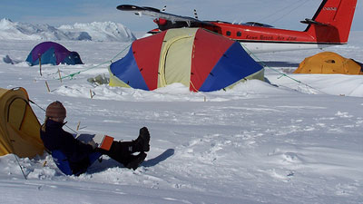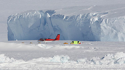 从智利乘坐私人运输飞机飞往南极。在冰上跑道着陆,于冰原安营扎寨。