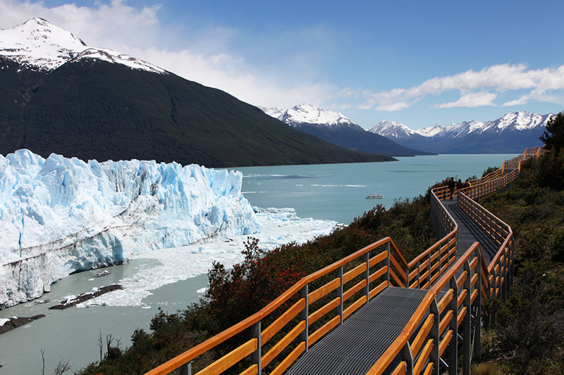 卡拉法特大冰川国家公园由47个大小冰川组成,其中最著名的是莫雷诺大冰川,面积达257平方公里,是世界三大冰川之一,也是少数还在继续生长的冰川之一,景色极为壮观。站在专门修建的观赏平台上,游客可以看到冰川是怎样从雪山顶上“倾泻”而下的。冰川正面笔直如削,顶部有无数裂隙,经过阳光的透射、折射,呈现出缤纷的颜色。你可以凭栏聆听从冰川上不时传来低沉的隆隆作响的冰川崩裂的声音。