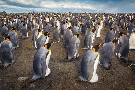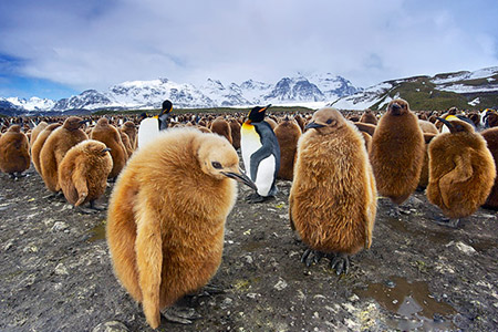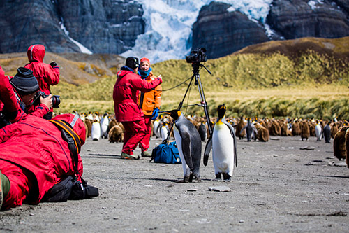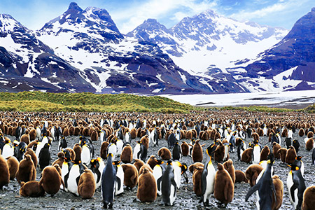 | 5.挑选南极动物繁殖时节,造访动物巢穴,观赏动物繁殖哺育的奇景。 | 6.深入南乔治亚岛腹地,欣赏成数百万王企鹅与幼崽的震撼景观。 |