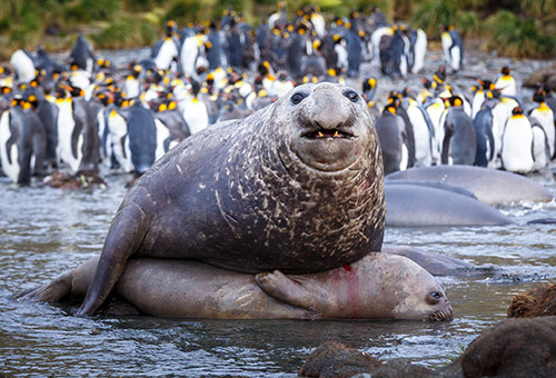 南乔治亚岛面积达3,755平方公里被无尽的冰块所包围,是众多企鹅、海象以及多种海鸟的家园。岛上的背风海岸壮丽,高山、冰川的独特景观比比皆是,蜿蜒曲折的海岸线上漂浮了许多巨型的平行冰山,如一条名贵的历史挂毯般美丽。岛上栖息着巨大的象海豹、好斗的毛海豹、麦可罗尼企鹅。也可以看到信天翁、海燕、贼鸥与海鸥。最瞩目的是岛上可以观赏到成千上万的王企鹅。