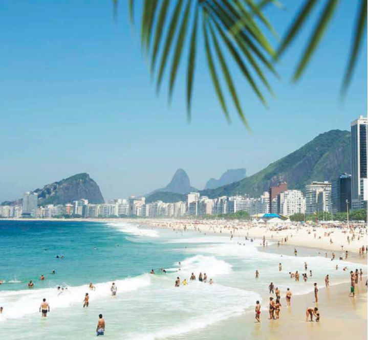 参观里约标志性建筑之一天梯大教堂、二战纪念碑。自由漫步于世界著名的COPACABANA海滩:沙色洁白如雪,蓝色的浪谷和白色的浪峰此消彼长,一次次涌来。