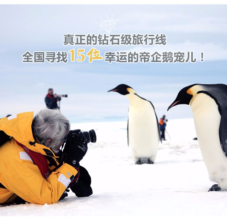 我们鼓励所有人,摄影师,自然景观爱好者,在我们探访企鹅群栖地时带上相机,因为您所拍摄下来的每一帧,都是世所罕见的。我们的探险队伍中将有一位专业的摄影师,会协助您捕捉到最为精彩的画面,不管您是入门者或是经验老到的摄影家。