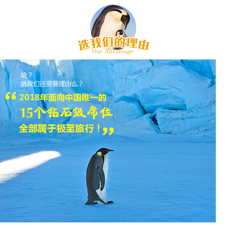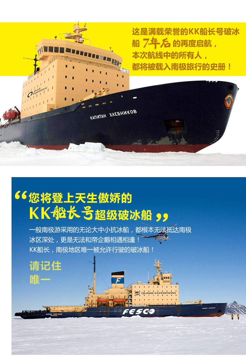 我们的探险之旅除了常规的登陆,观赏野生动物以及直升飞机观光等,还有海冰,无边无际的海冰!我们这艘破冰船将撞开冰盖,推开厚重的冰层,这标志着您真的到达南极腹地的厚冰区了!