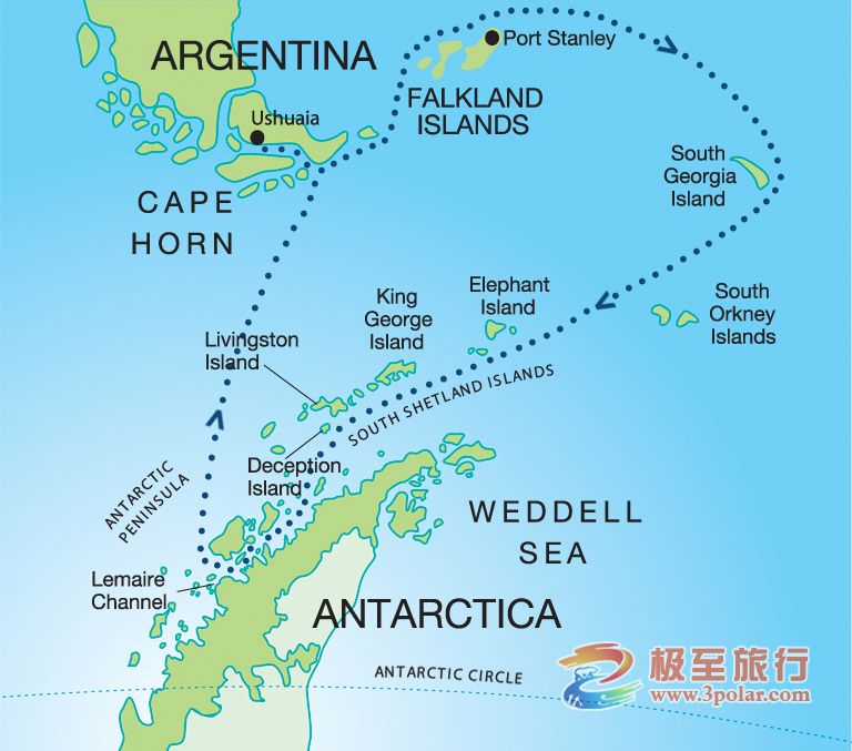 * 福克兰群岛——英阿争议岛屿(中国支持阿根廷对于马尔维纳斯群岛的主权要求),岛上亦可观赏到高贵的信天翁和海燕 (Petrel) ,麦哲伦企鹅(MagellanPenguins),史丹利港 (Stanley) 登陆,造访英国住民,参观博物馆。