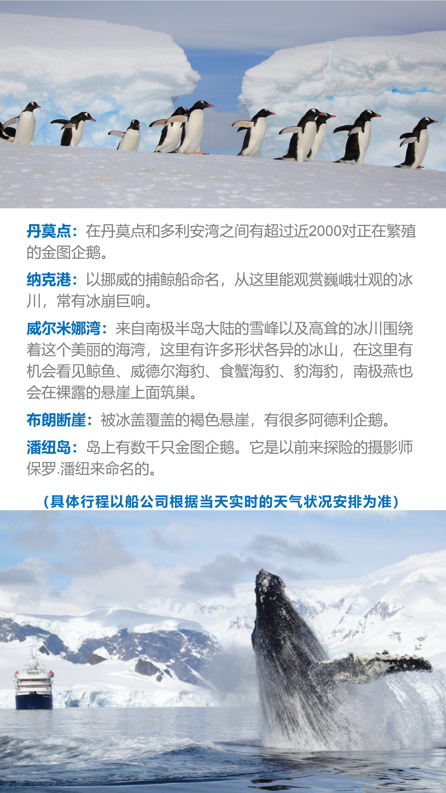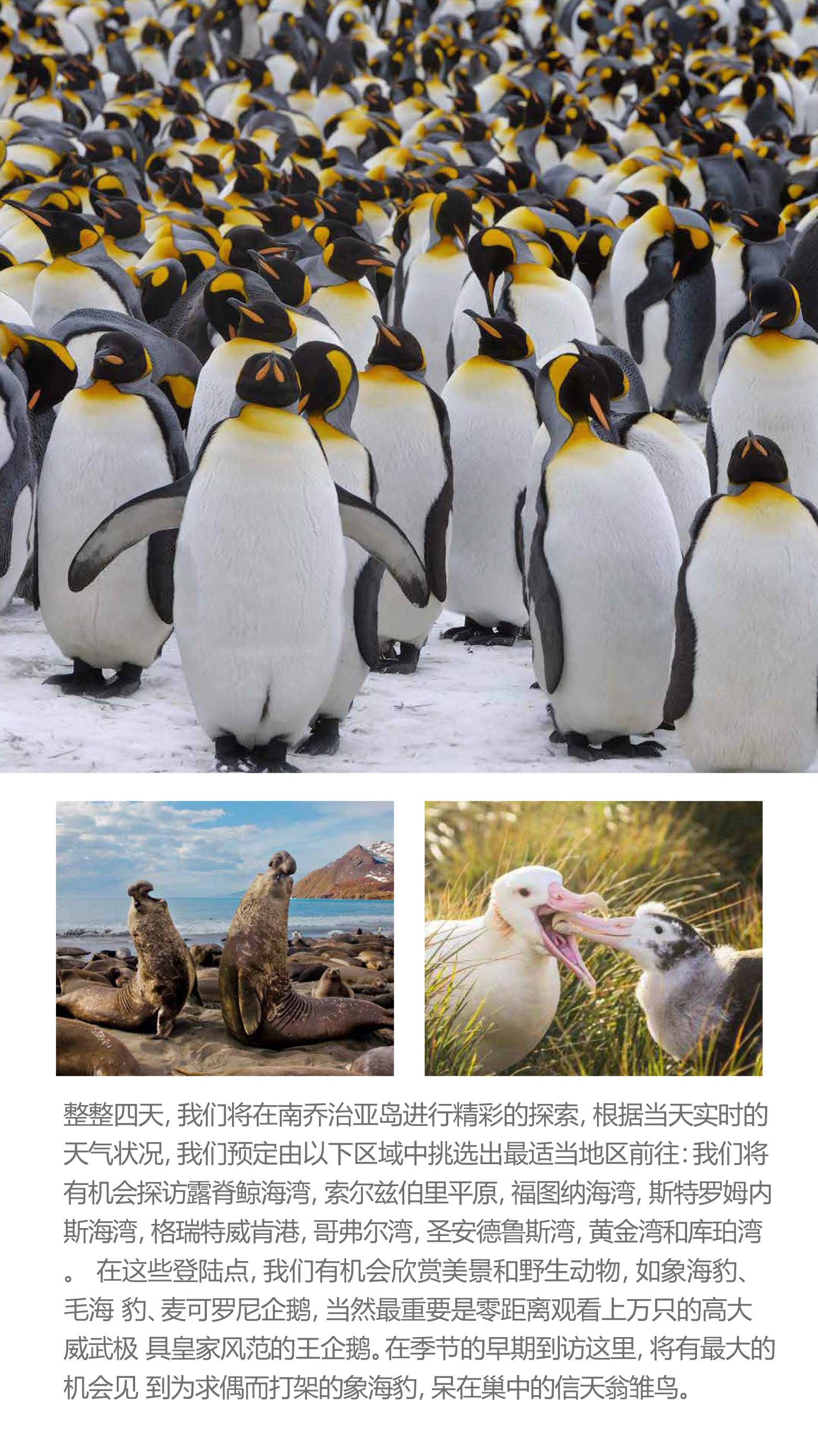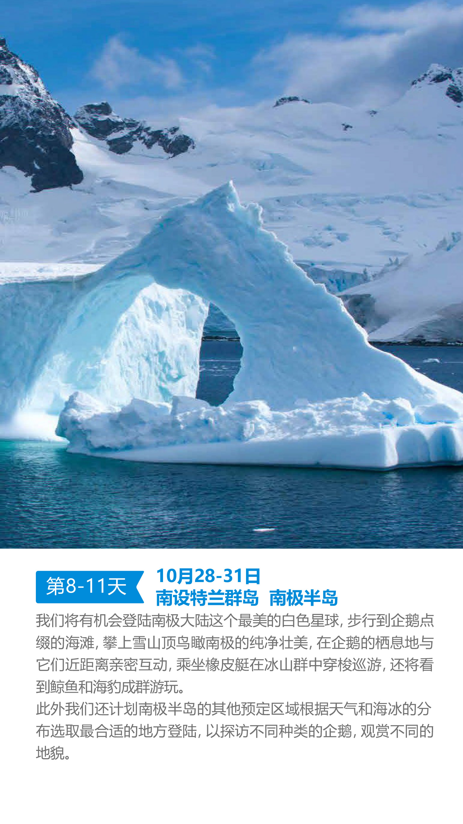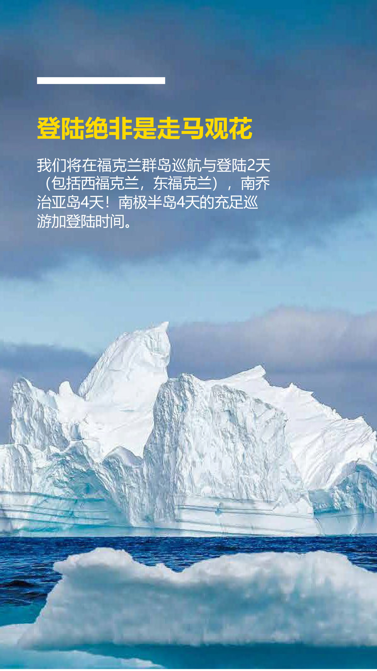 登陆亚南极岛屿,看王企鹅的幼崽——南极猕猴桃;看巨大的象海豹在海岸求偶打架,展翅长度达2-3米的信天翁在岸边筑巢;走进福克兰群岛首府史丹利港,一座英伦风情的南极城镇;登陆南极大陆,造访南极科考站,也深入在海上冰山丛中巡游;搭乘极至优选的科技型豪华游轮,穿越德雷克海峡,仪式感满满;正值企鹅们的繁殖季节,看多达六种南极企鹅千姿百态;座头鲸到南极捕食的季节,近赏鲸群跃出海面;近观海豹等极地野生动物,一路上,观赏罕见的极地海鸟