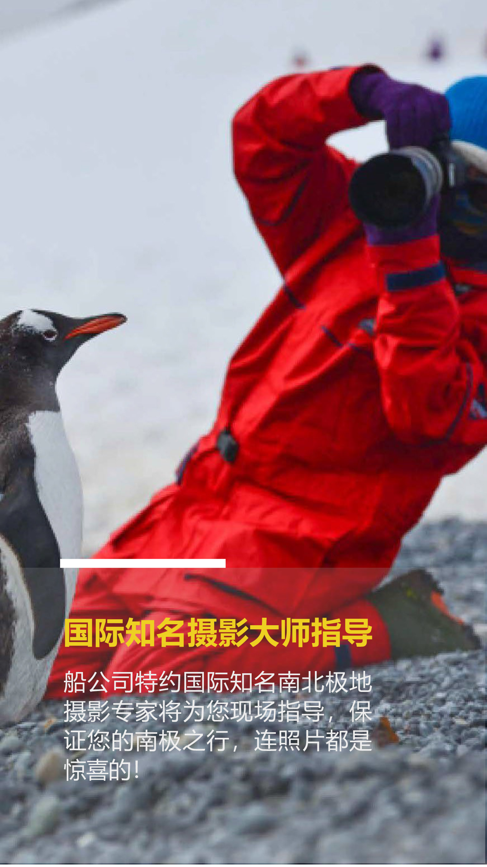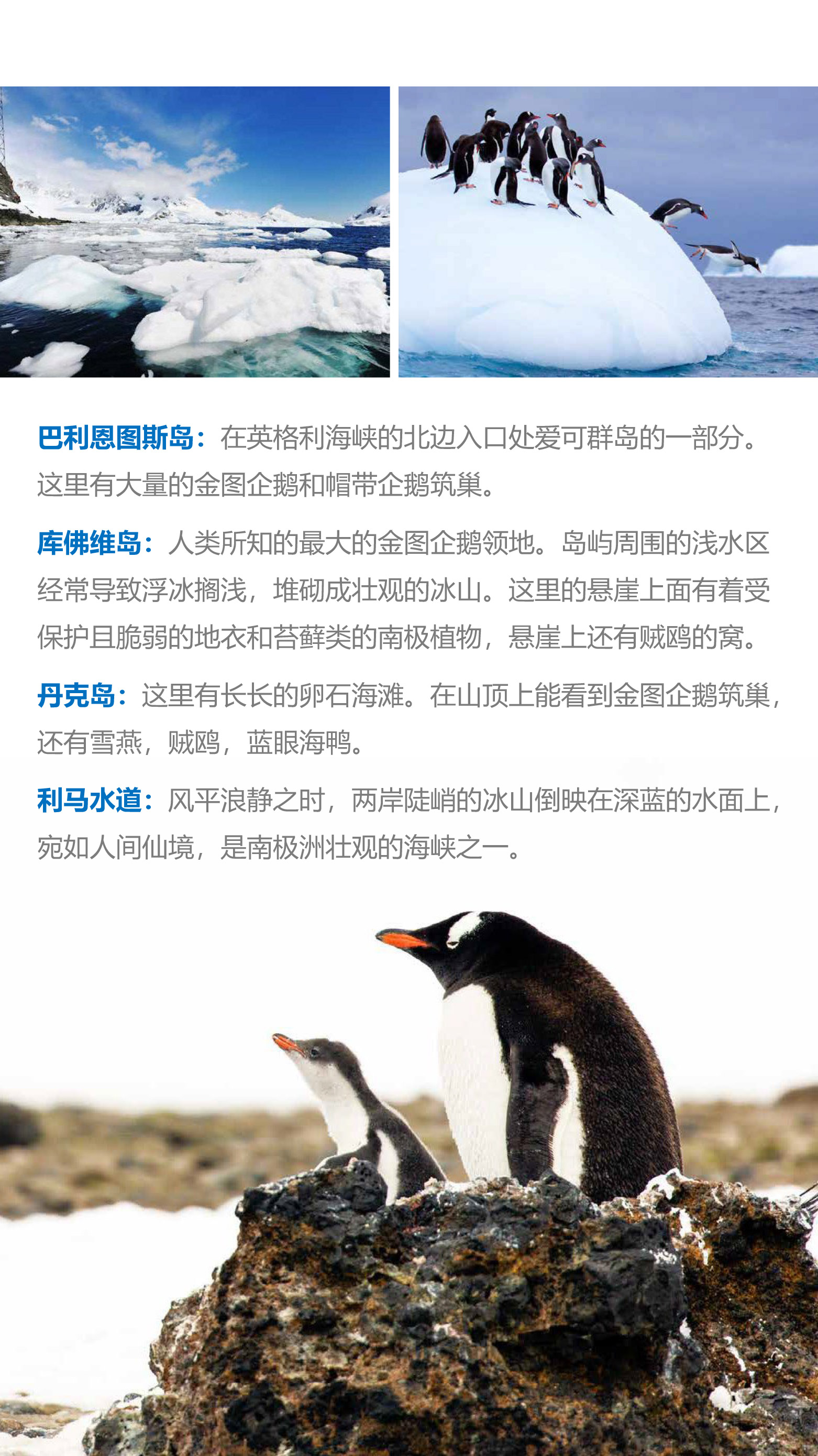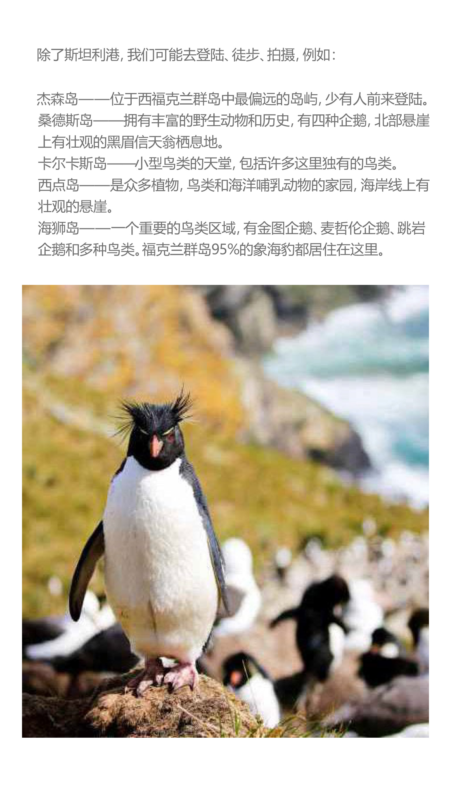 登陆亚南极岛屿,看王企鹅的幼崽——南极猕猴桃;看巨大的象海豹在海岸求偶打架,展翅长度达2-3米的信天翁在岸边筑巢;走进福克兰群岛首府史丹利港,一座英伦风情的南极城镇;登陆南极大陆,造访南极科考站,也深入在海上冰山丛中巡游;搭乘极至优选的科技型豪华游轮,穿越德雷克海峡,仪式感满满;正值企鹅们的繁殖季节,看多达六种南极企鹅千姿百态;座头鲸到南极捕食的季节,近赏鲸群跃出海面;近观海豹等极地野生动物,一路上,观赏罕见的极地海鸟