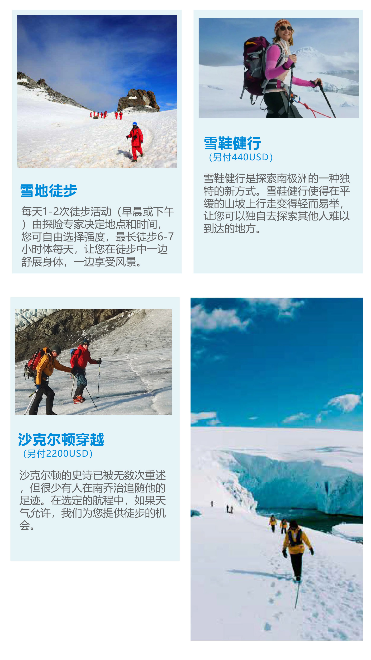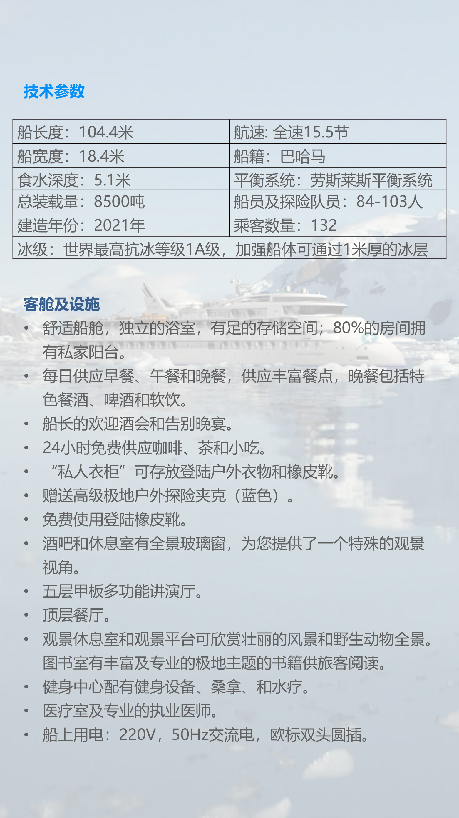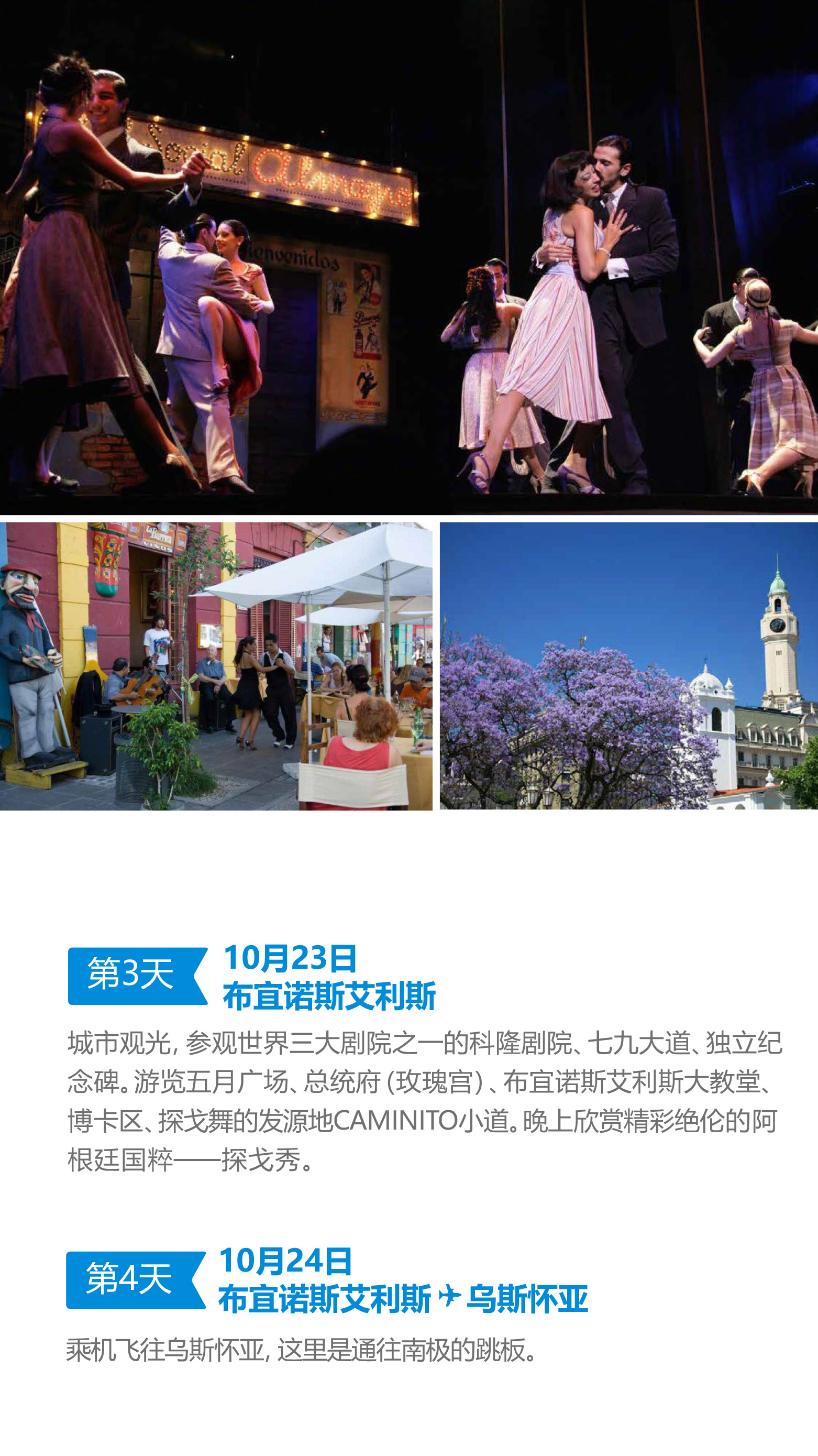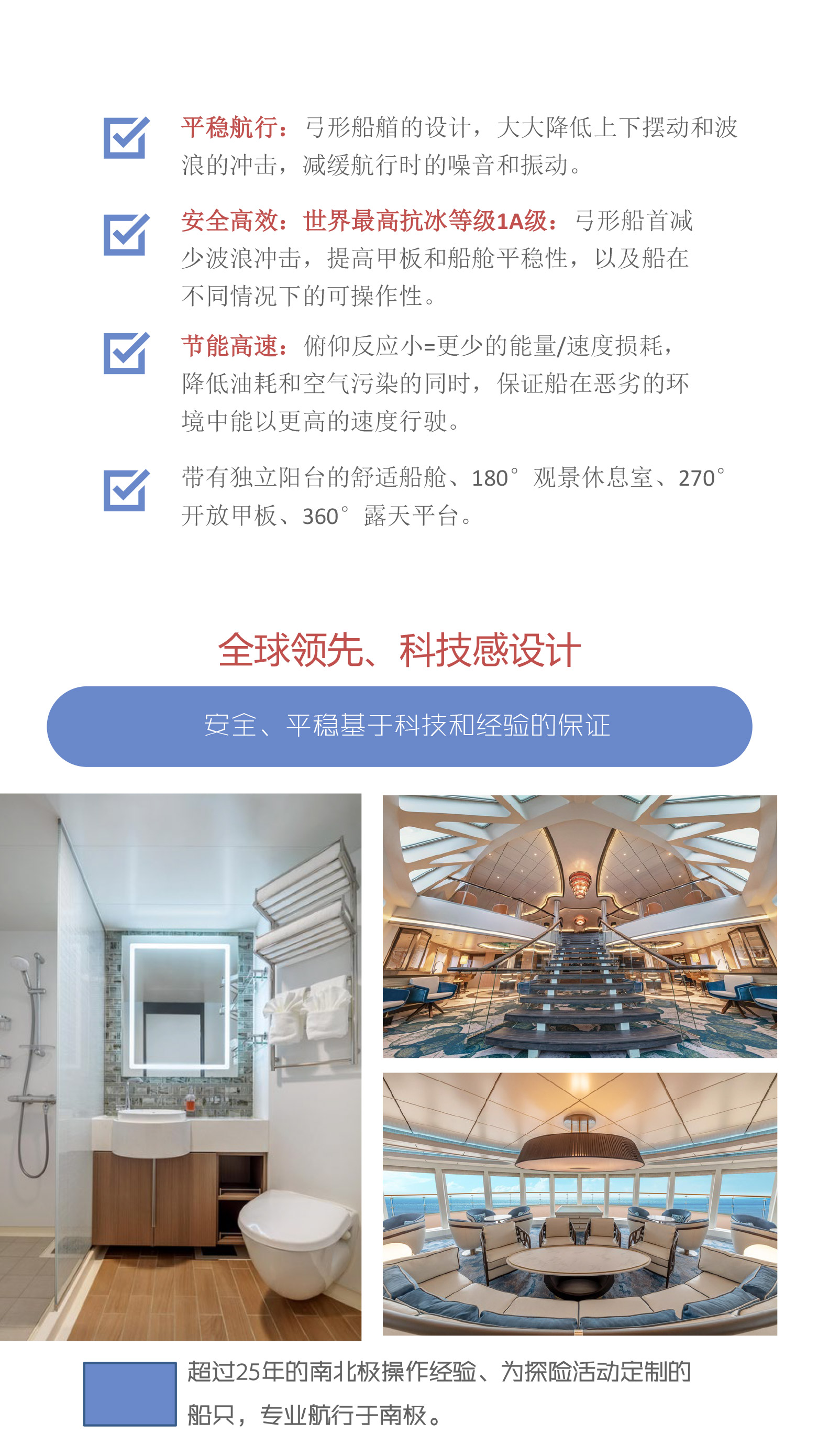 登陆亚南极岛屿,看王企鹅的幼崽——南极猕猴桃;看巨大的象海豹在海岸求偶打架,展翅长度达2-3米的信天翁在岸边筑巢;走进福克兰群岛首府史丹利港,一座英伦风情的南极城镇;登陆南极大陆,造访南极科考站,也深入在海上冰山丛中巡游;搭乘极至优选的科技型豪华游轮,穿越德雷克海峡,仪式感满满;正值企鹅们的繁殖季节,看多达六种南极企鹅千姿百态;座头鲸到南极捕食的季节,近赏鲸群跃出海面;近观海豹等极地野生动物,一路上,观赏罕见的极地海鸟