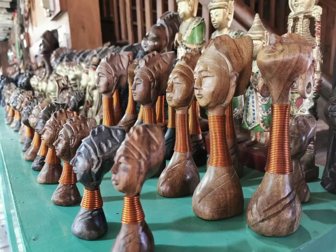 在“伊瓦玛"水上集市,我们见到了长颈族女人。她们脖子上套着金色的颈圈,在湖上的木屋里织布。她们以脖子长为美,同行的旅伴好奇的把她们的颈圈戴上想感受一番,结果不禁感慨太重了。