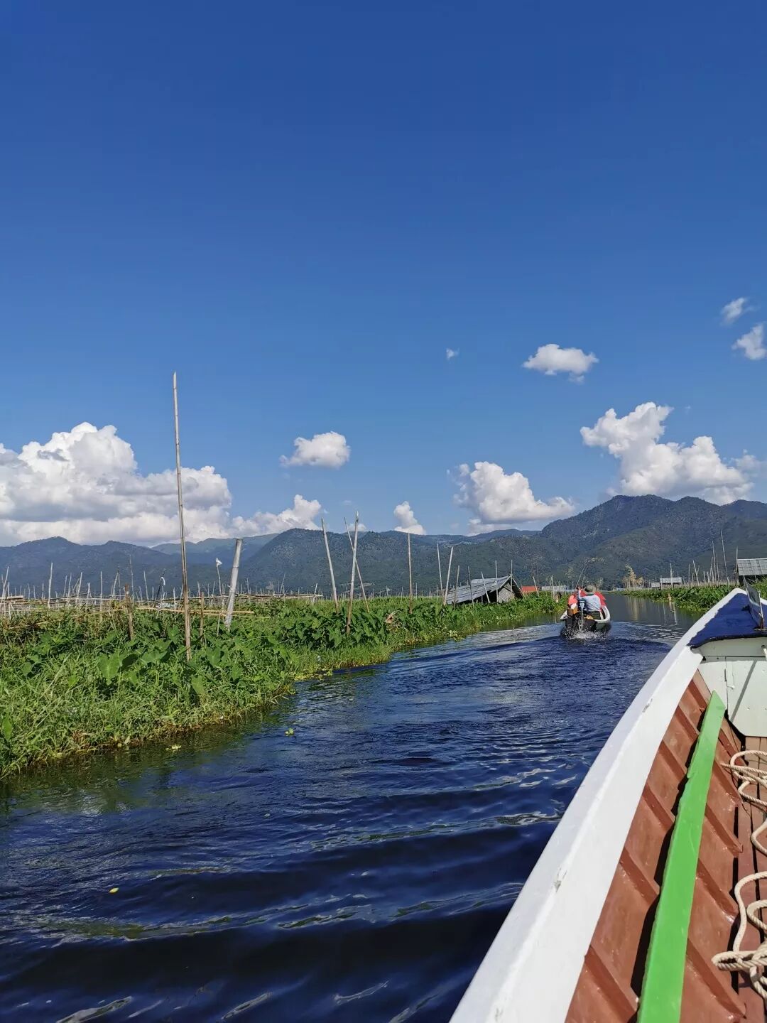 小舟行驶在茵莱湖上,追寻着我们入住的水屋,湖面上你来我往的扁舟甚多,但大部分都不是传统的双手划桨了,小舟一端装有马达,速度甚快,彼此相遇常常溅起浪花,也算是另类的打招呼方式了。