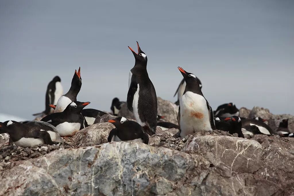 成群的企鹅会在光秃秃的山岩旁筑巢孵蛋
