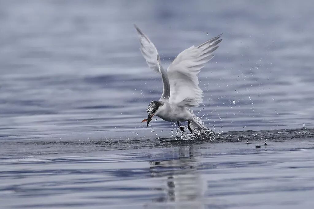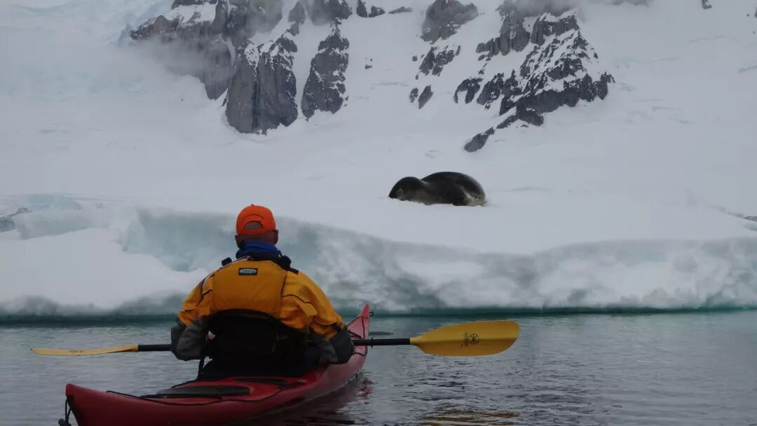 看皮划艇在炫目的白和幽兰的浮冰中穿梭