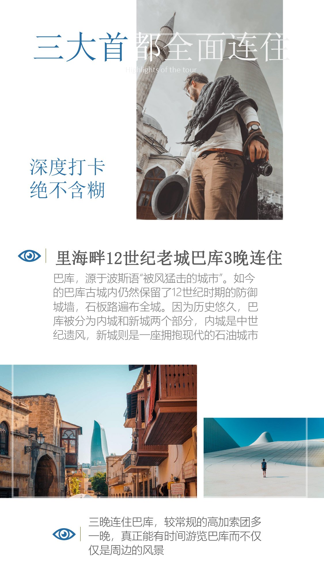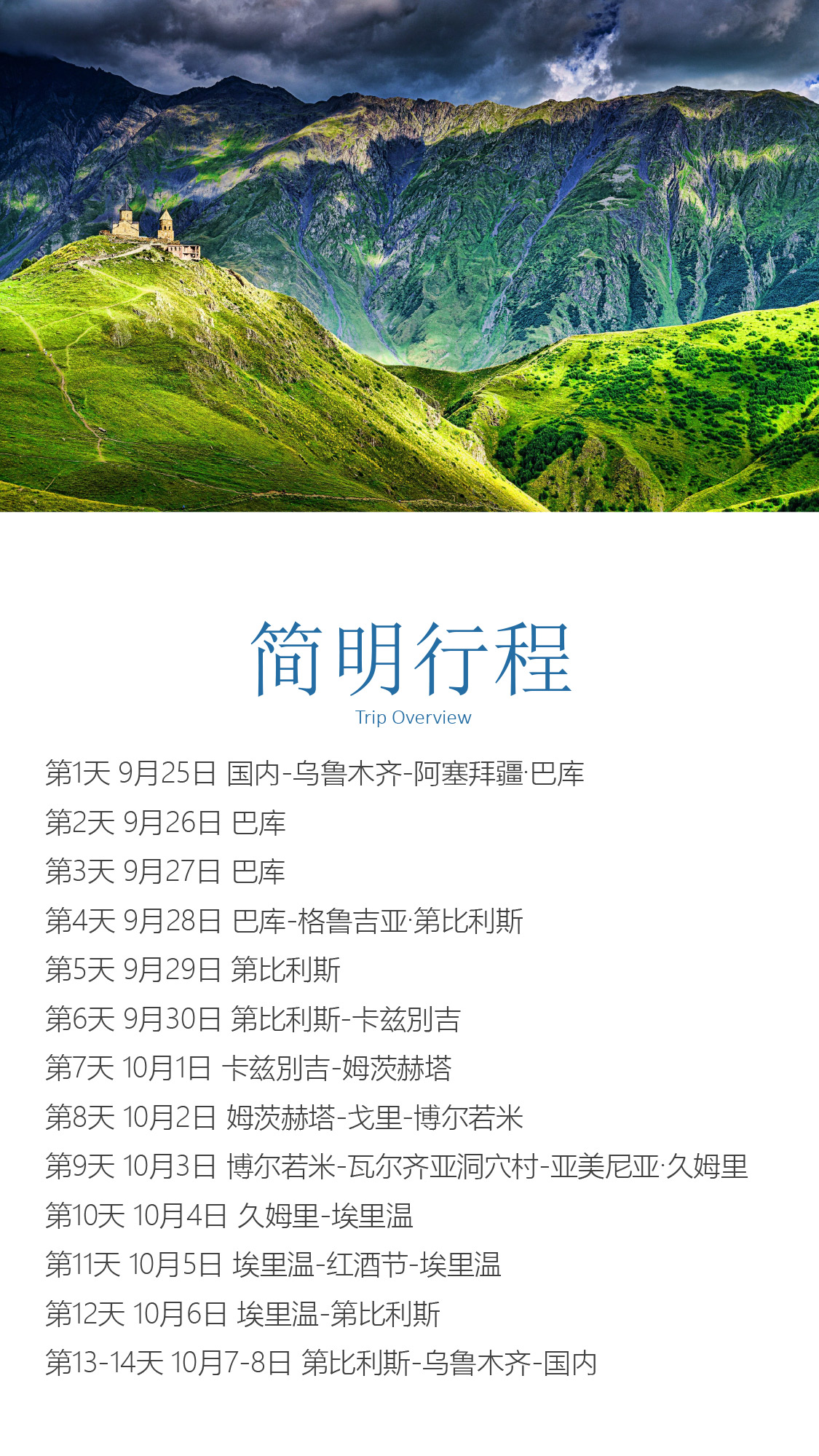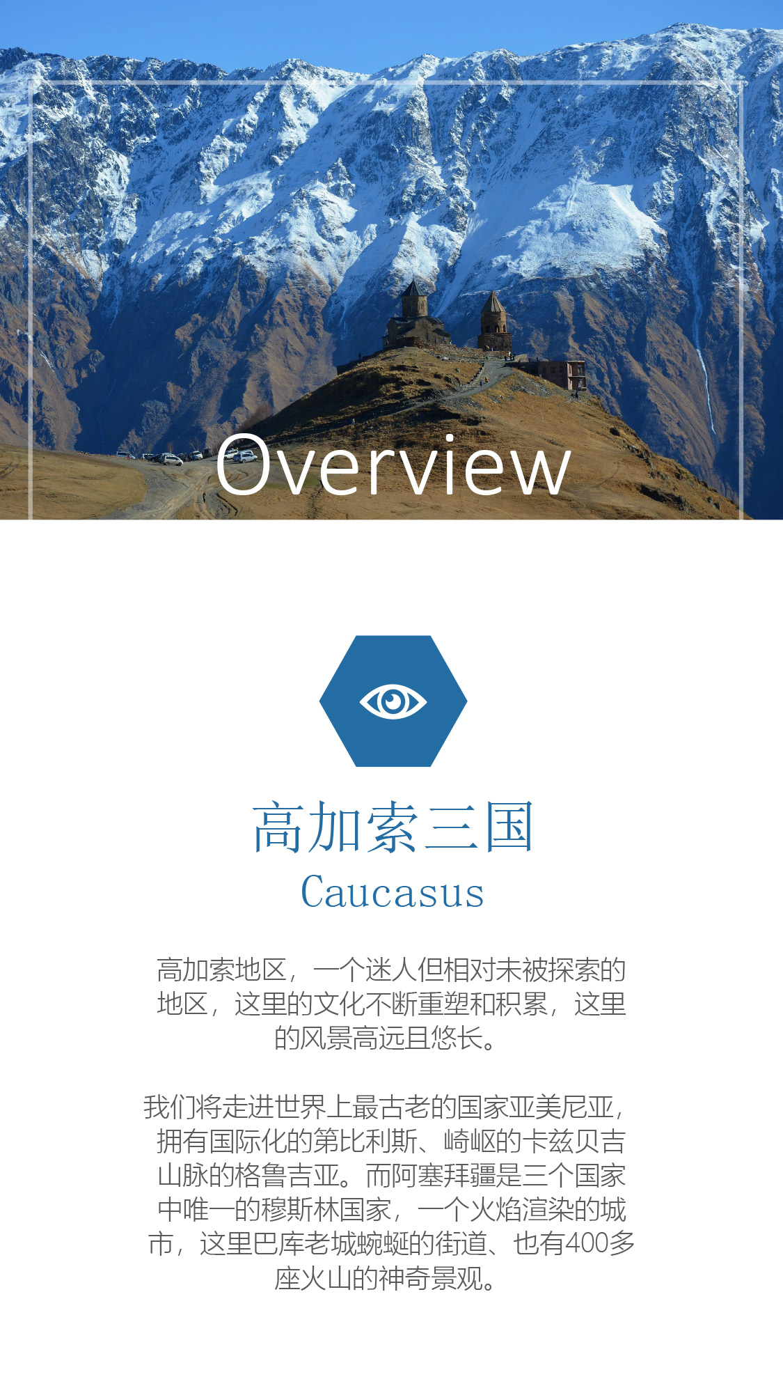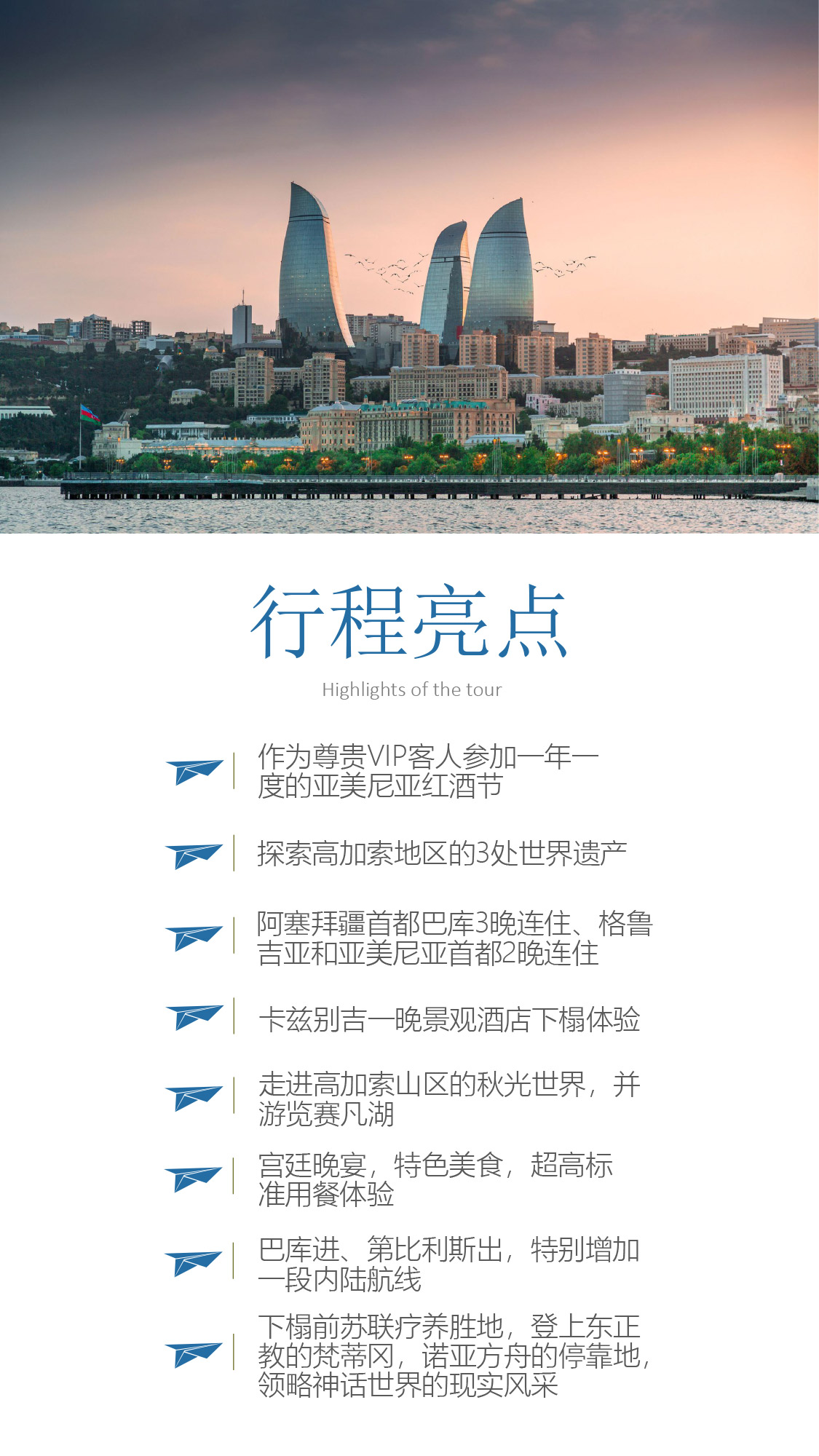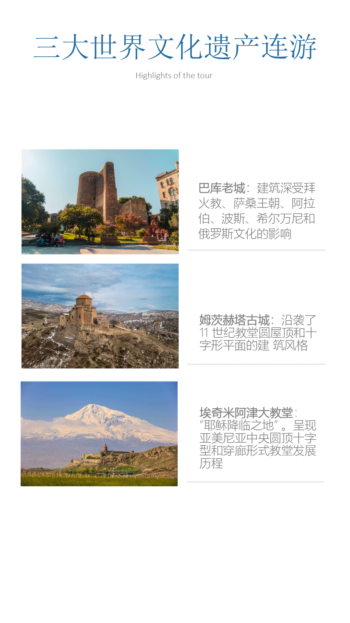 浏览多个世界遗产:巴库老城、姆茨赫塔古城、埃奇米阿津大教堂;寻找高加索的山民文化