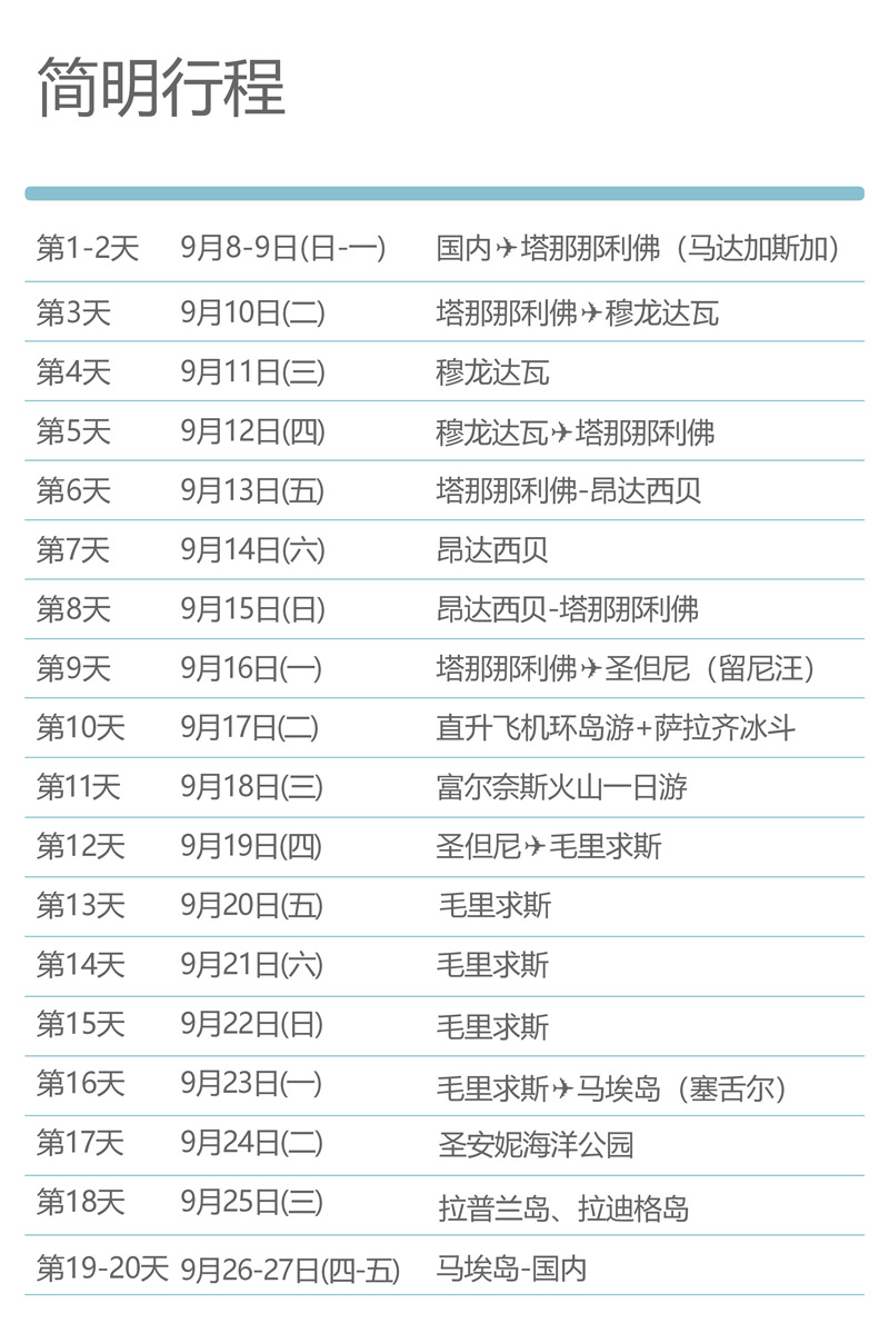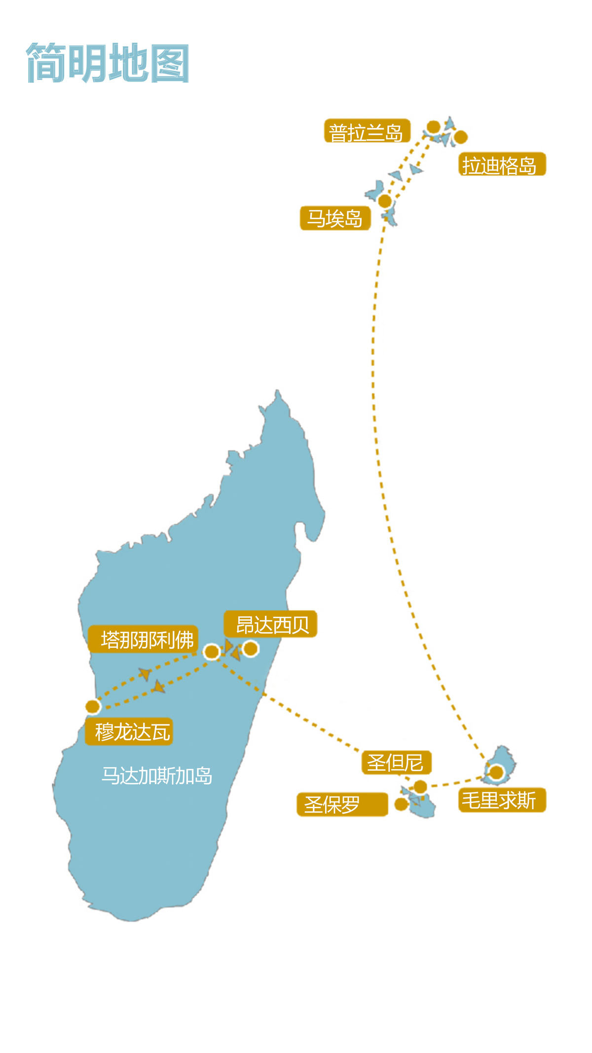 充满原始趣味的森林徒步走进狐猴的神秘世界;前往闻名于世的猴面包树大道;环岛直升机—空中欣赏美丽留尼旺;探访世界自然遗产——冰斗;游览世界自然遗产五月谷和美丽沙滩德阿让;入住奢华海边度假酒店寻找海洋的静谧;近距离与狮子接触,与狮子同行;