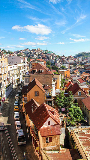 搭乘国际航班转机飞往马达加斯加的首都,塔那那利佛。 塔那那利佛是一座具有亚、非、欧三大洲混合风格的 城市,漫步市区可见高耸的教堂尖塔、挺拔成行的桉 树,红瓦盖顶的民居和块石铺砌的路面,