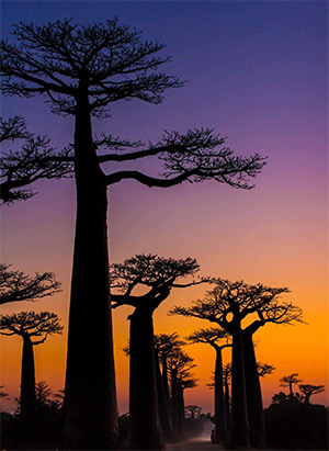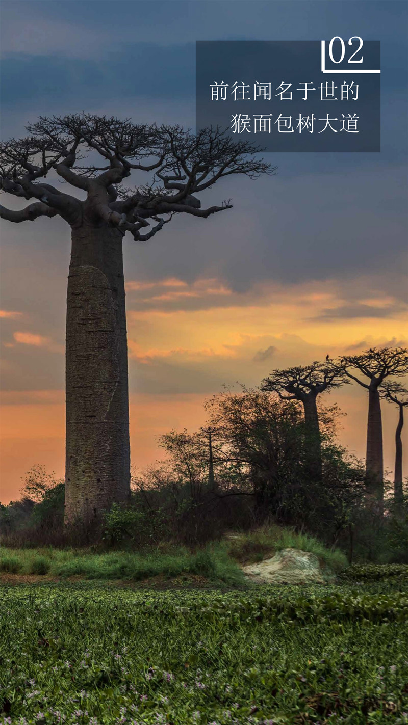 猴面包树大道是穆隆达瓦引以为豪的“名片”,距离穆隆 达瓦市区往北大概20公里,这片区域集中生长着猴面包树,其中的一段因为猴面包树排列集中且能同时看到4种不同的种属而被冠之以“猴面包树大道”的称谓,是马达加斯加也是全球最佳欣赏猴面包树的景点。