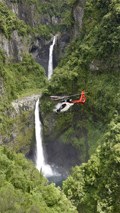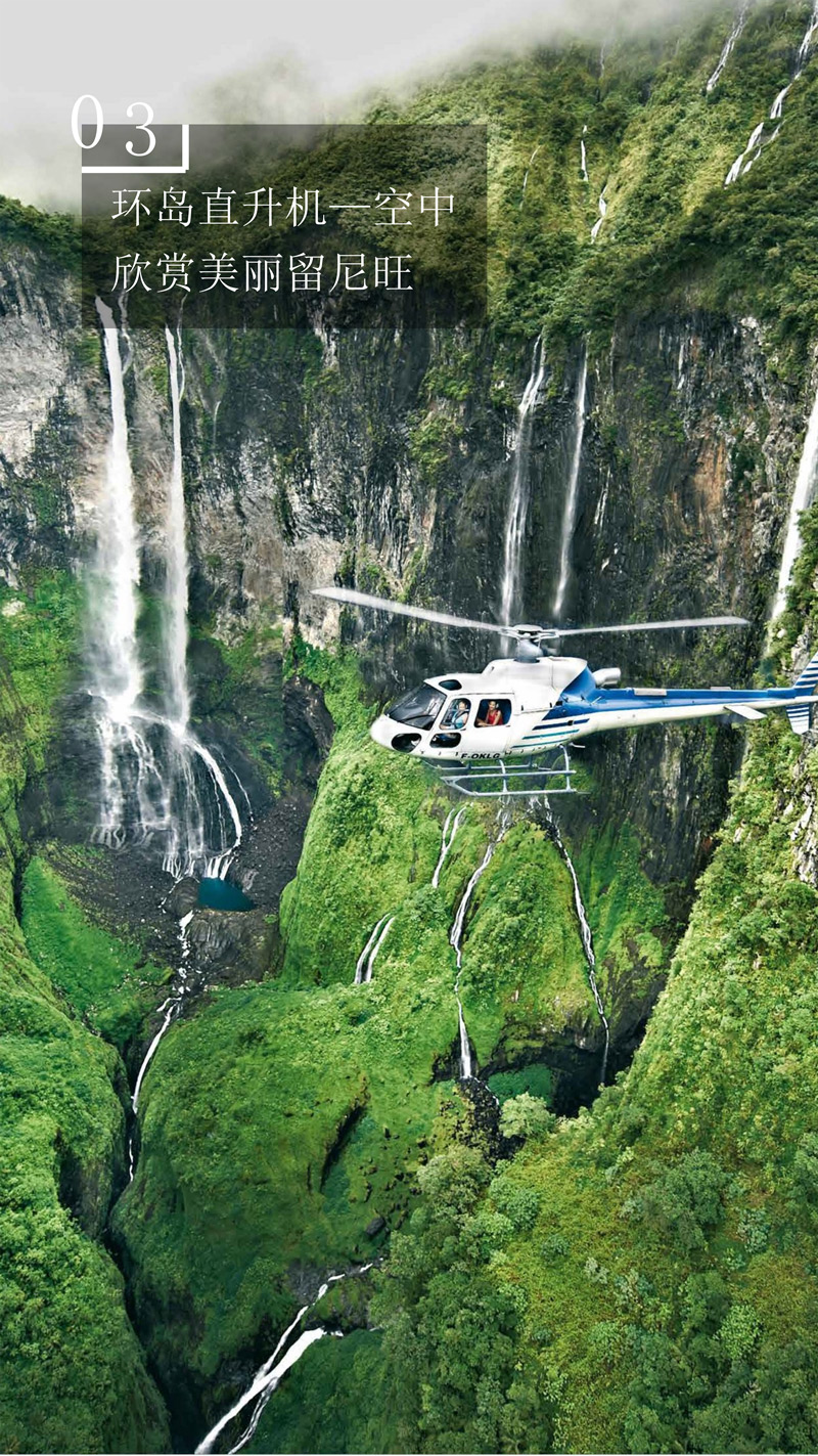 乘坐直升机飞越三大冰斗:锡拉奥,玛法特和萨拉齐, 近距离欣赏冰斗瀑布美景;盘旋在大火山口体验火 山热情;比肩印度洋最高峰内日峰欣赏壮丽景色。