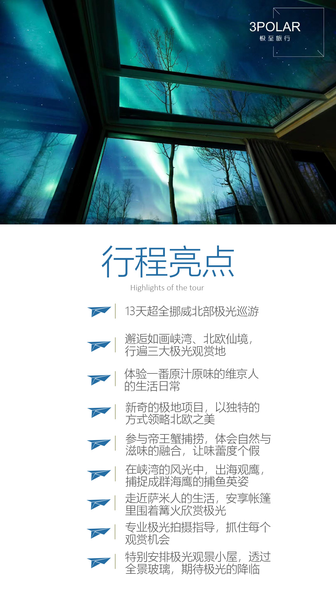 13天超全挪威北部极光巡游;邂逅如画峡湾、北欧仙境,行遍三大极光观赏地;体验一番原汁原味的维京人的生活日常;新奇的极地项目,以独特的方式领略北欧之美;参与帝王蟹捕捞,体会自然与滋味的融合,让味蕾度个假;在峡湾的风光中,出海观鹰,捕捉成群海鹰的捕鱼英姿;走近萨米人的生活,安享帐篷里围着篝火欣赏极光;专业极光拍摄指导,抓住每个观赏机会;特别安排极光观景小屋,透过全景玻璃,期待极光的降临