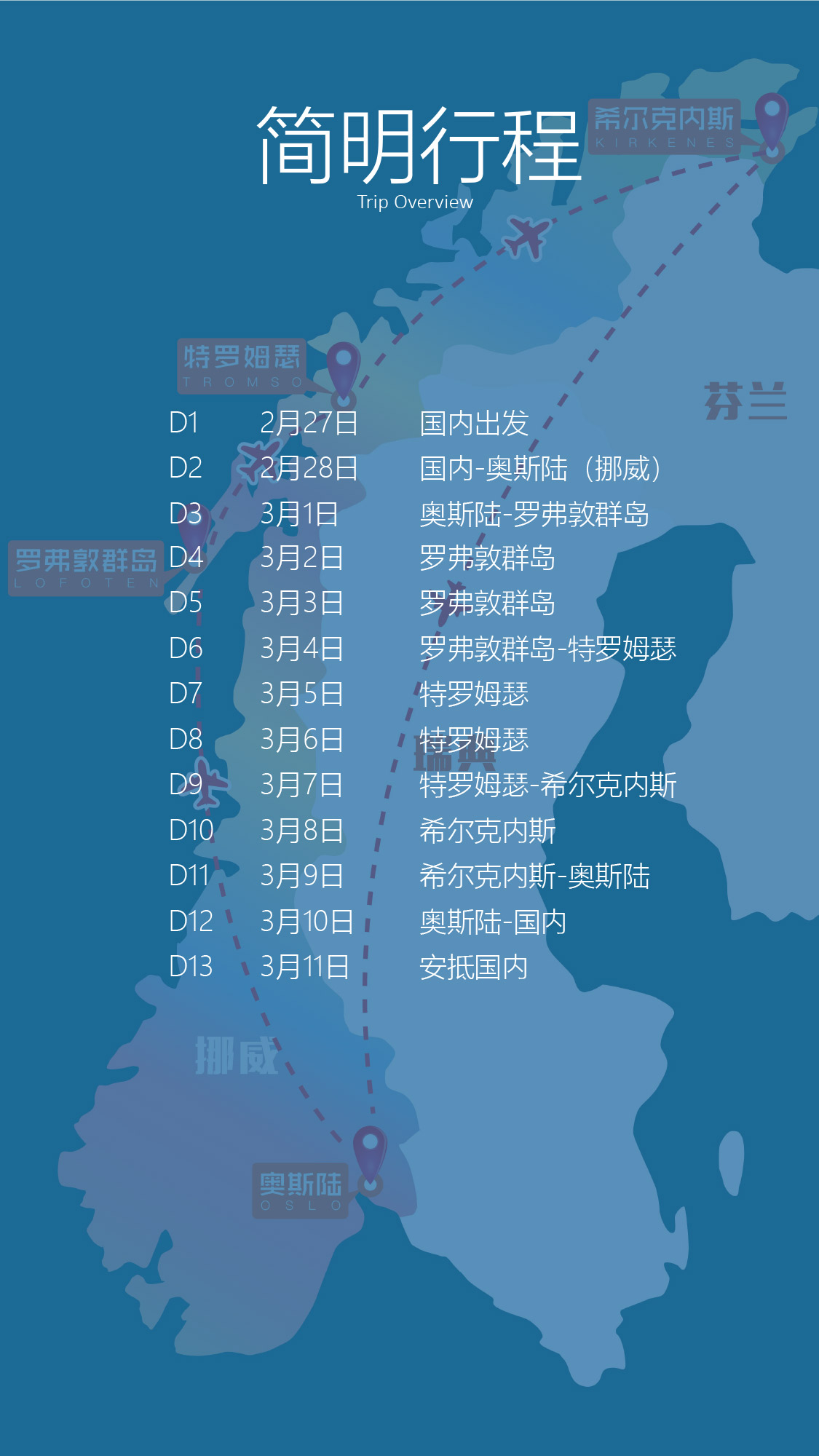 6.【门票】行程中所提及到的景点首道门票,赠特罗姆瑟追寻极光之旅一晚、希尔克内斯追寻极光之旅一晚。