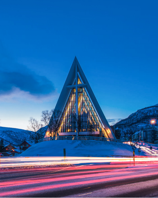北极大教堂:外观呈三角形状的北极教堂。教堂运用玻璃和混凝土融合的时尚设计,与特罗姆瑟的冬季和极光巧妙结合,被当地人亲切的称为“雪之教堂”。
