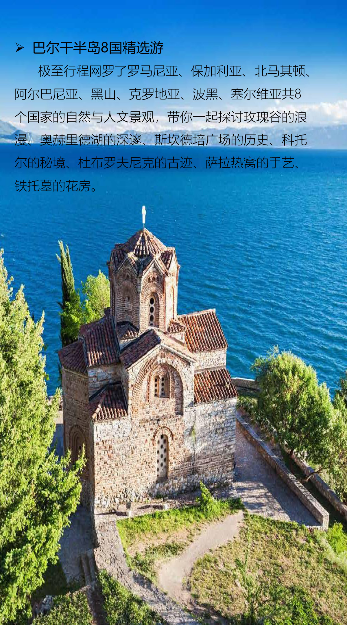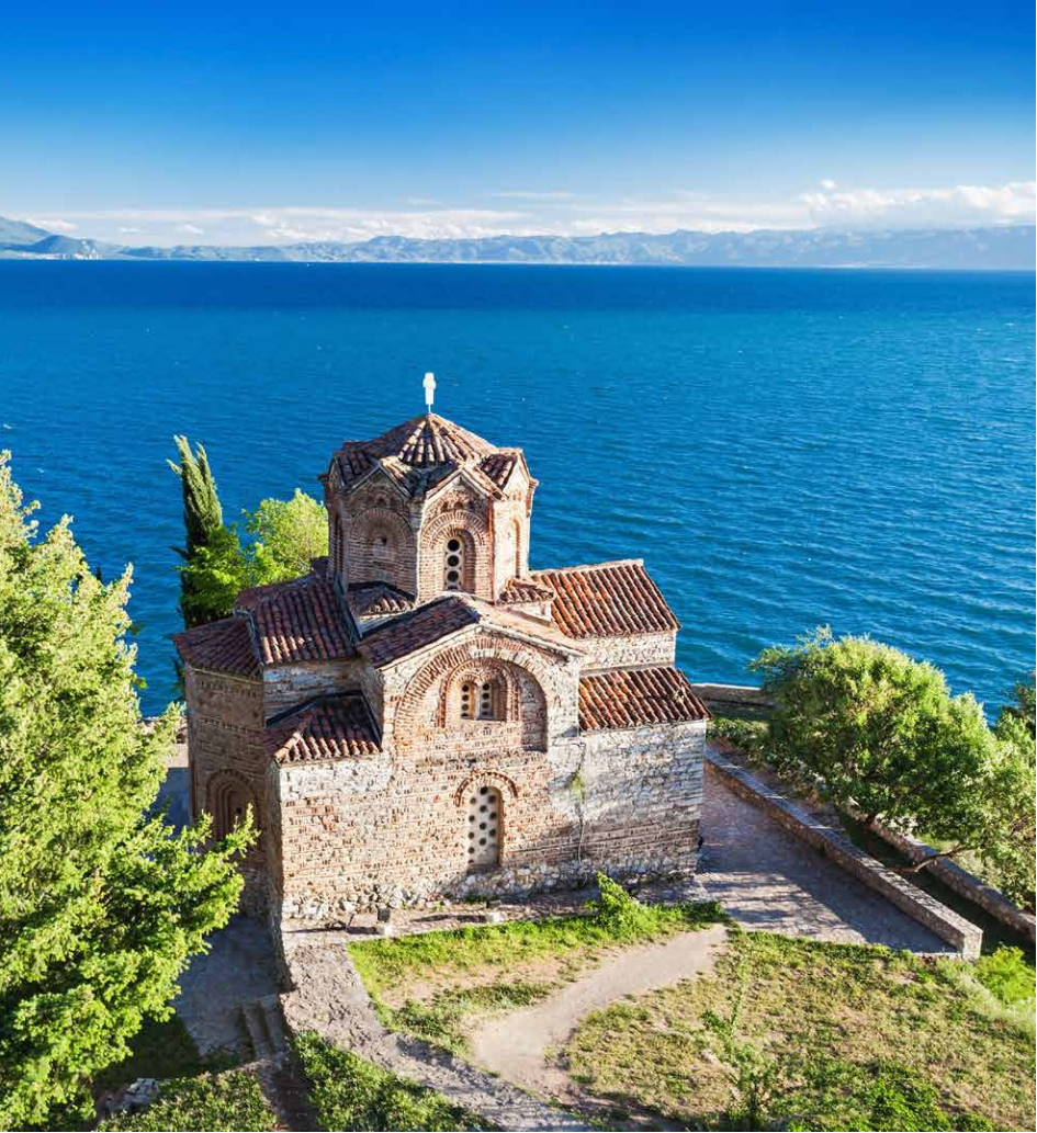 前往巴尔干半岛的第二大湖-奥赫里德湖,湖岸陡峭、群山环抱的景色尤为静谧;游览湖畔上的圣约翰教堂。