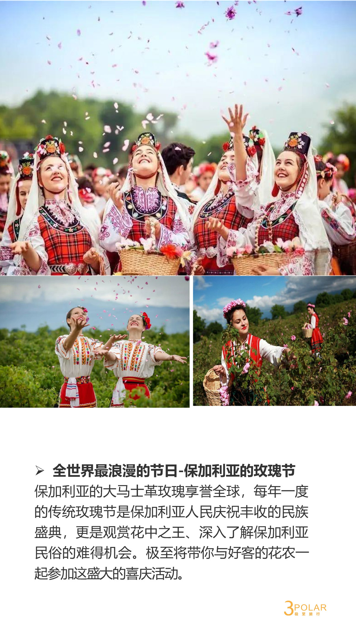 玫瑰节:保加利亚有300多年的玫瑰油生产历史。为保留玫瑰油生产的传统,保加利亚从60年代末起,每逢玫瑰收获季节,举办“玫瑰节”,透过文化活动表现保加利亚人民勤劳、智慧和好客的品格。玫瑰花农身着民族服装,共祝玫瑰丰收。